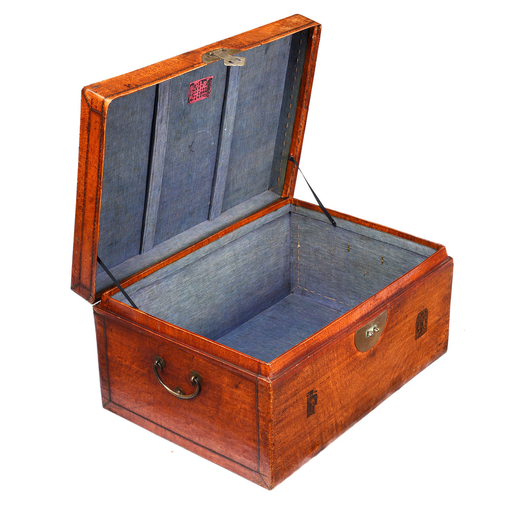 Indian military / campaign chests are almost always constructed from teak and bound with brass, often with owner’s plaques, and originate across Gujarat, Rajasthan, Hyderabad (South India) and Burma. Painted trunks from Rajasthan appear in warm mineral colours with borders and cartouches. The highest-quality merchant boxes from the Shekhawati region show refined proportions and fittings, while Jaisalmer boxes tend to be smaller and chip-carved. (Jaisalmer also produced distinctive stick boxes in kair wood.) Explore more under Indian Chests & Trunks or our broader Campaign Furniture.