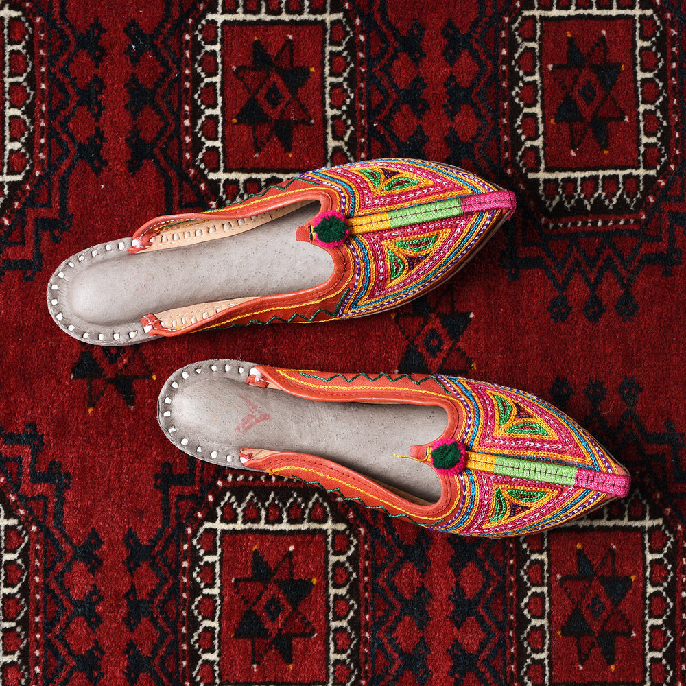 Each pair is made from soft, durable leather and richly decorated with colourful cotton or silk embroidery. Traditionally worn by both men and women across northern India, juttis remain a symbol of festive attire, known for their flexibility and distinctive upturned toe.