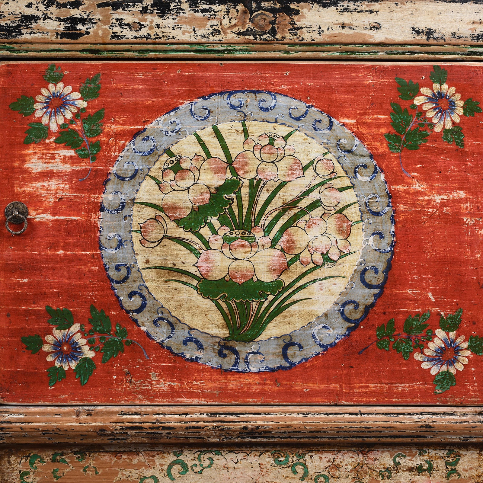 A vintage painted sideboard from Mongolia, made in the 1920's. This piece has original floral painting on a beautiful deep red background. The kickboard also has traces of its original trailing floral paintwork.