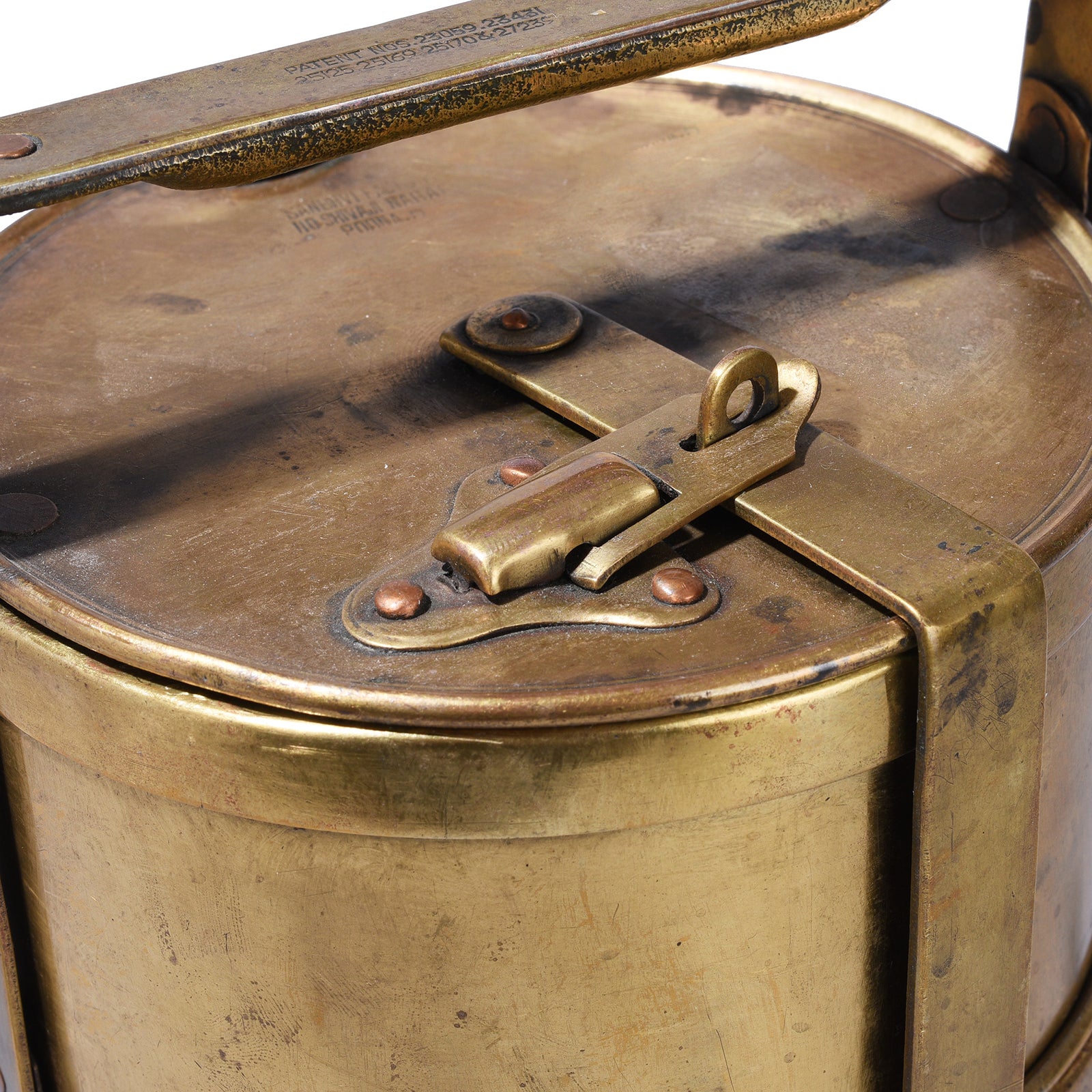 This three-tier brass tiffin box dates to around 1900 and is a classic example of the traditional Indian dabba—used for carrying lunches, small snacks, and home-cooked meals. Made entirely from hand-worked brass, it consists of three individual compartments that stack securely within their original frame, held firmly in place by a hinged handle and locking bar. The interior of each tier still shows the soft wear of many years of use.