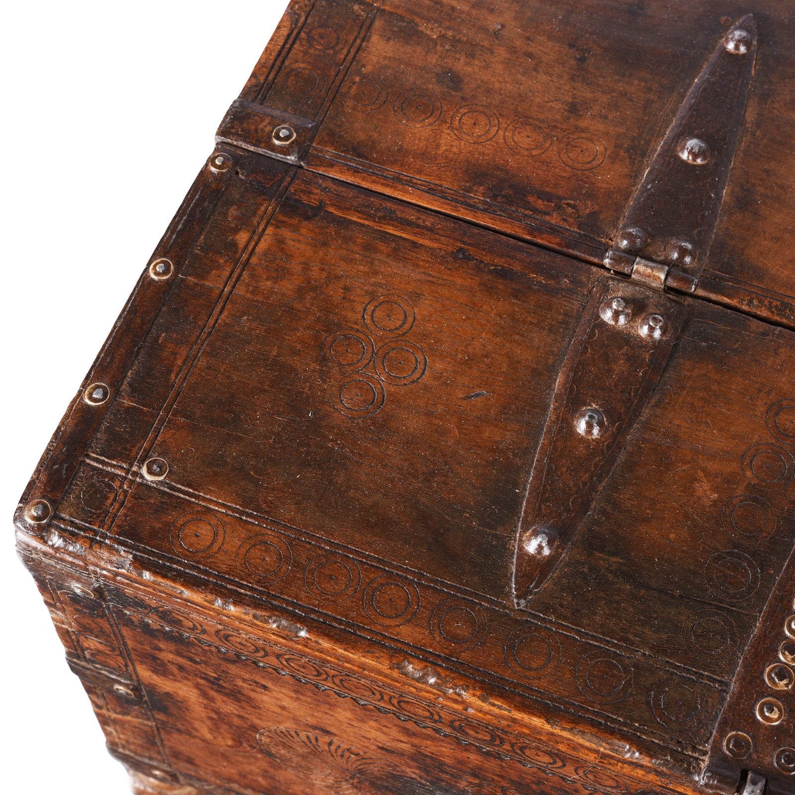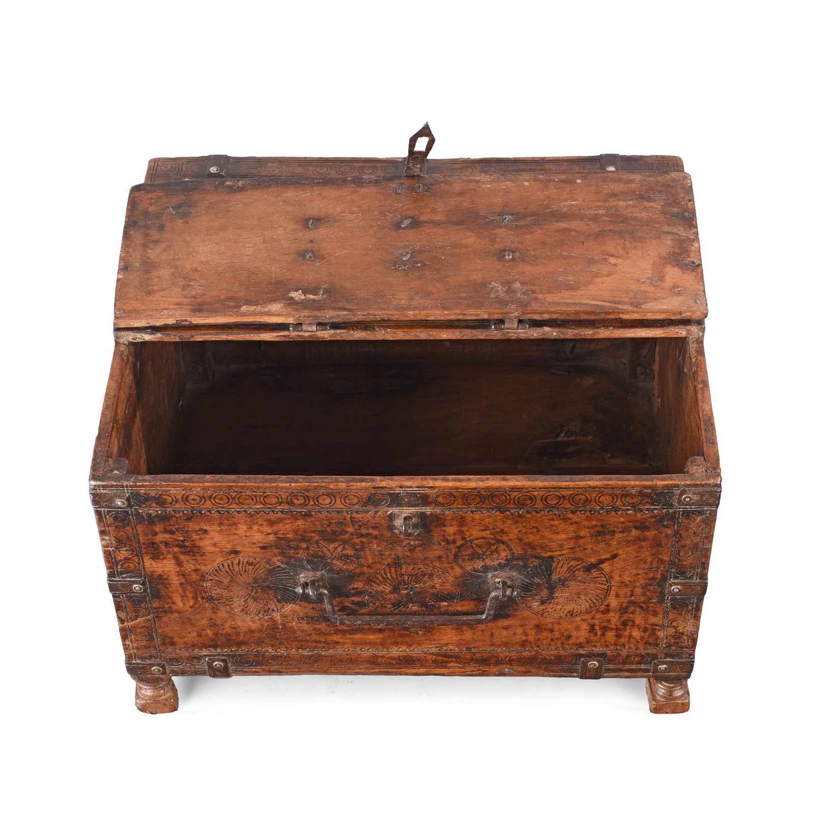 This lovely chip-carved antique Indian box is from Northern Rajasthan and has the original ironwork. It is made from roheda wood and dates to the 19th century. These boxes were used in the old days by merchants and traders in the bazaars for storing their cash and ledgers. They were also used by Indian families for the dowry of their daughters, as a trousseau