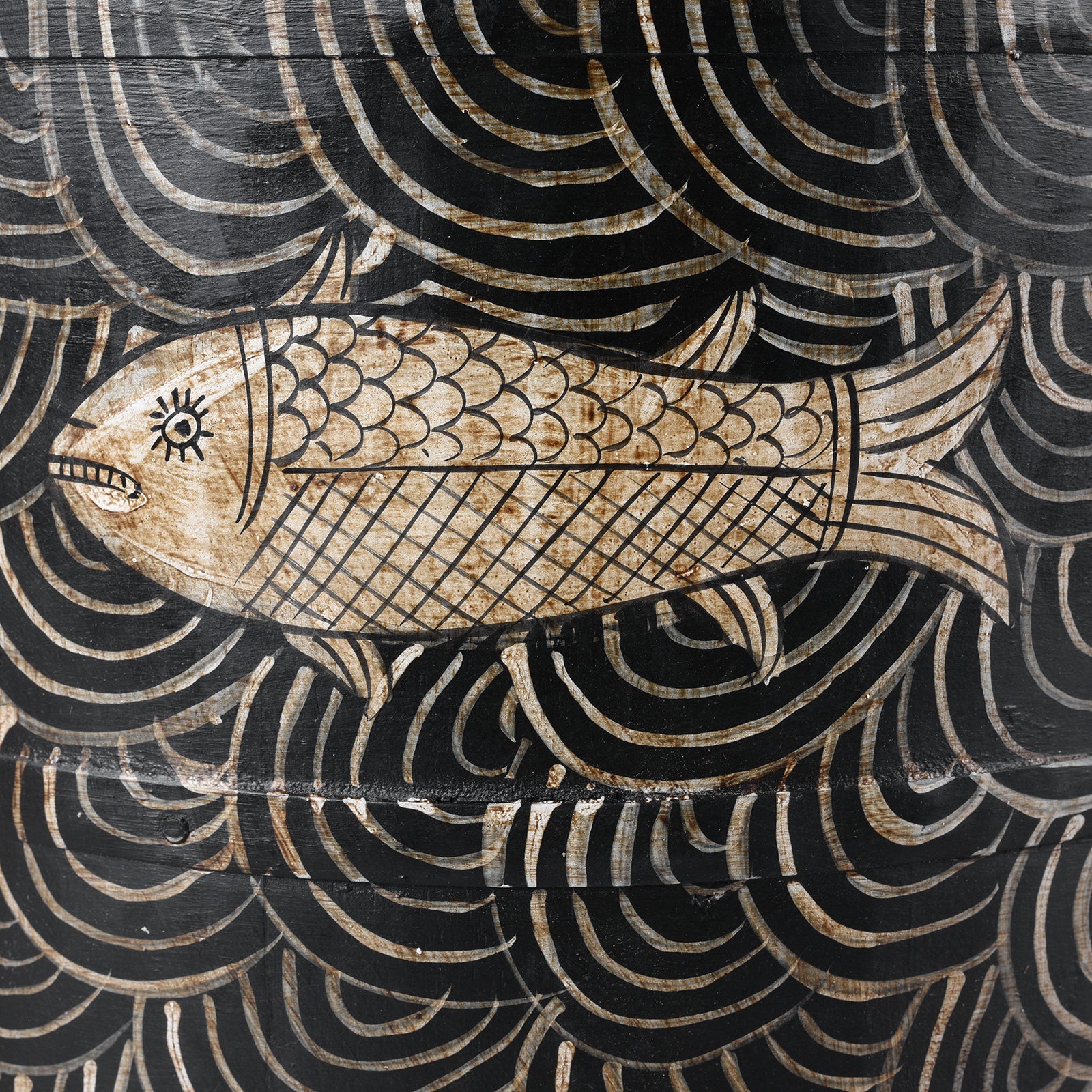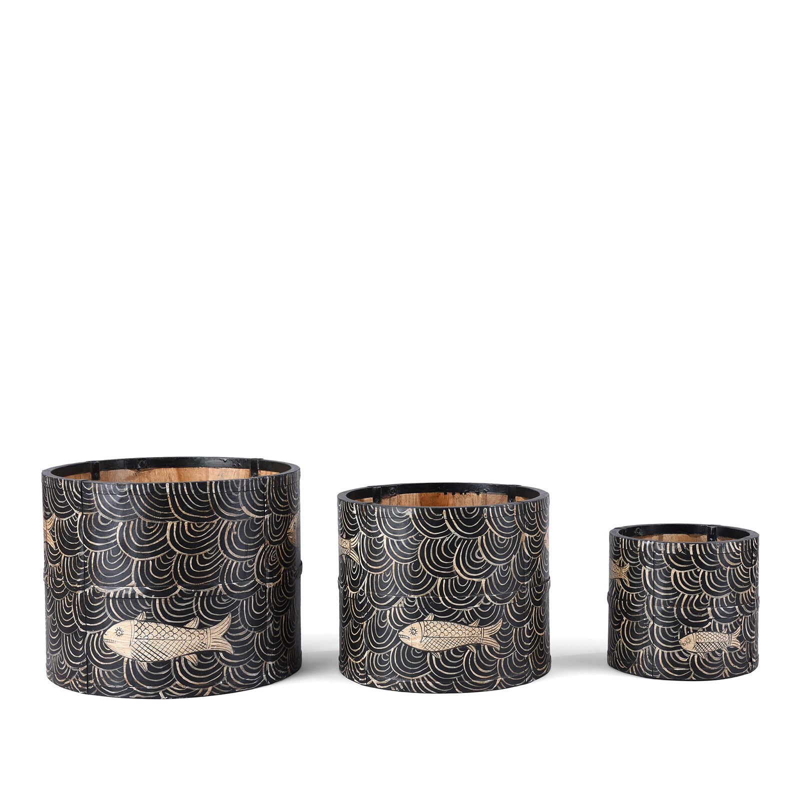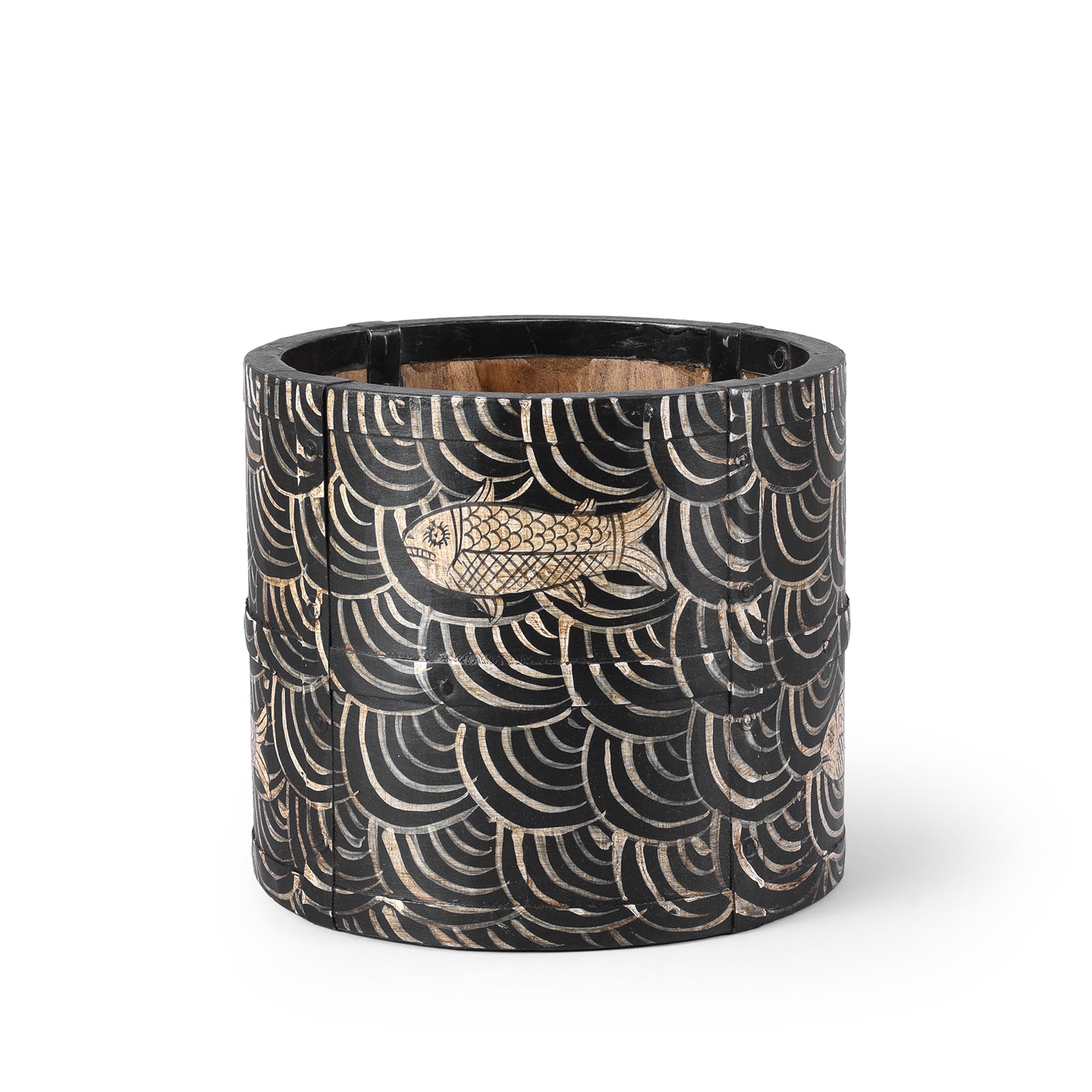 These distinctive hand-painted wooden bins are styled on traditional Indian grain measures (paila), once used to scoop and store grain in rural markets. Hand-carved from solid wood and bound with iron, each piece is adorned with flowing jali-style wave patterns and a stylised gold-painted fish€”a symbol of abundance and luck in Indian folklore.