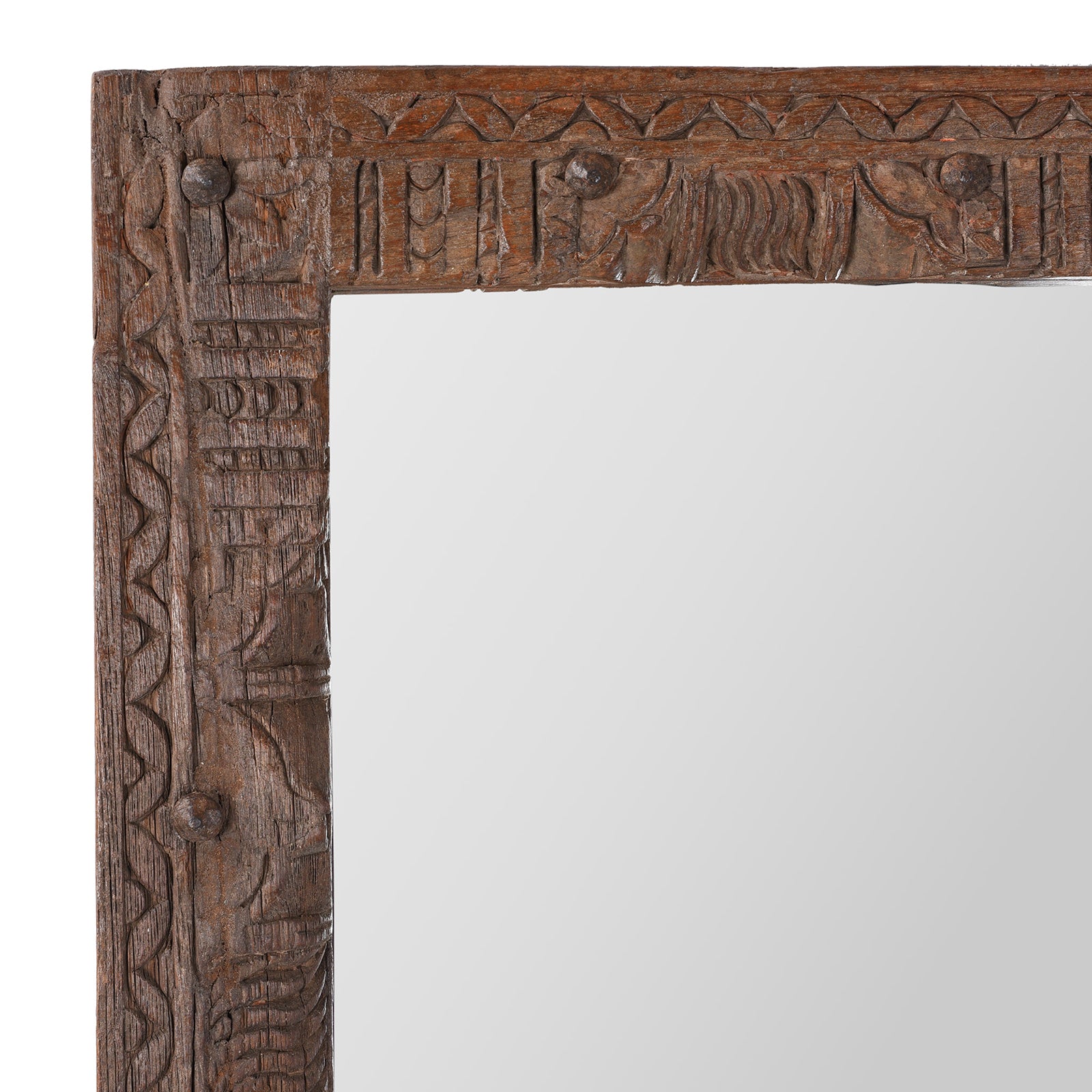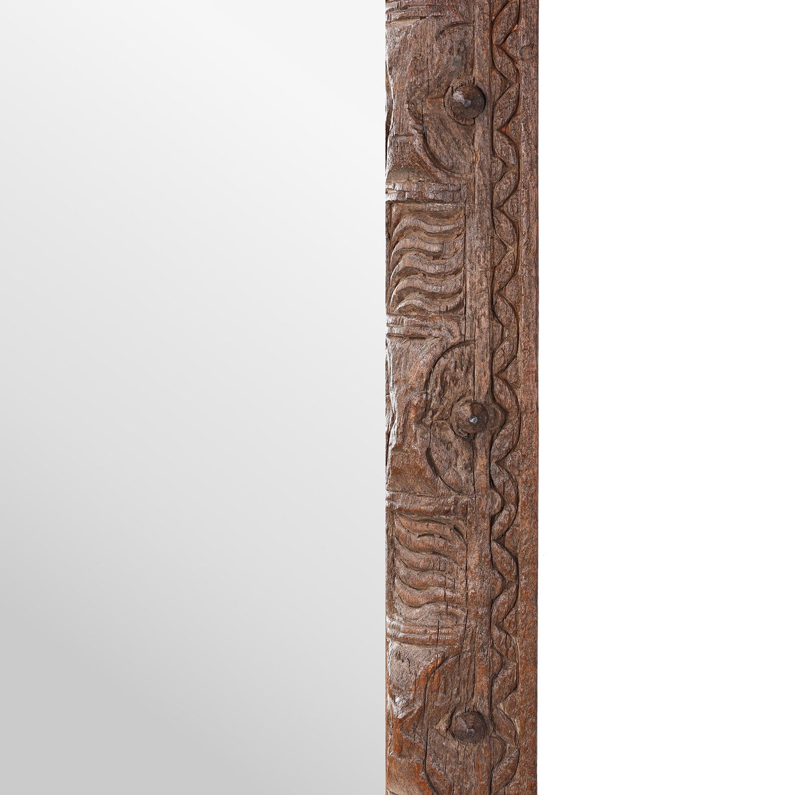 Crafted in India from reclaimed architectural teak, this tall mirror exudes rustic character and historic charm. The hand-carved frame showcases a medley of geometric and organic motifs, likely salvaged from traditional Indian door or window surrounds. Each carving bears the marks of age and craftsmanship, creating a richly textured surface that adds soul and story to any interior.
