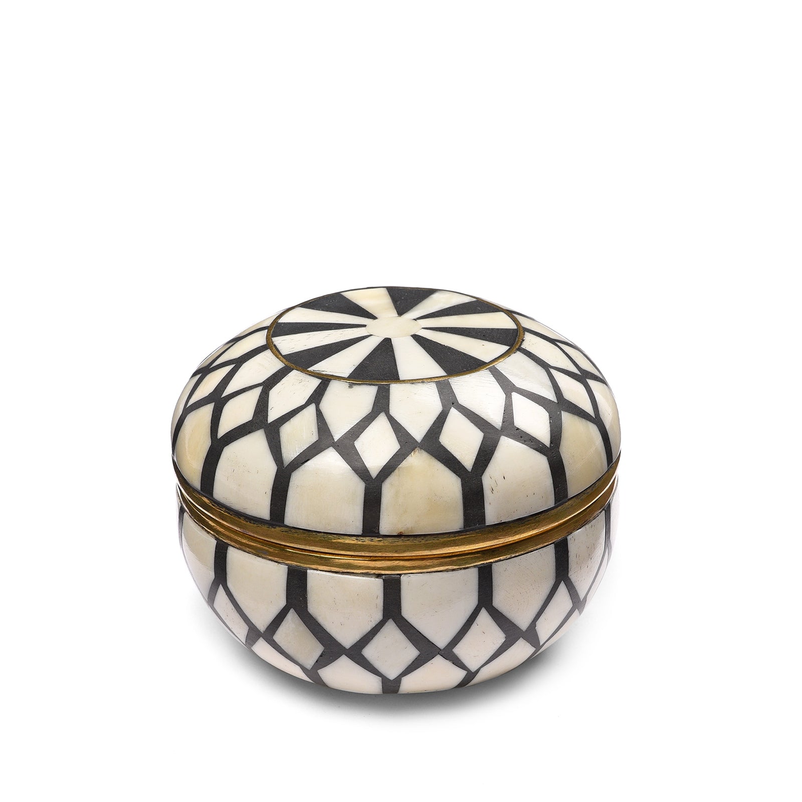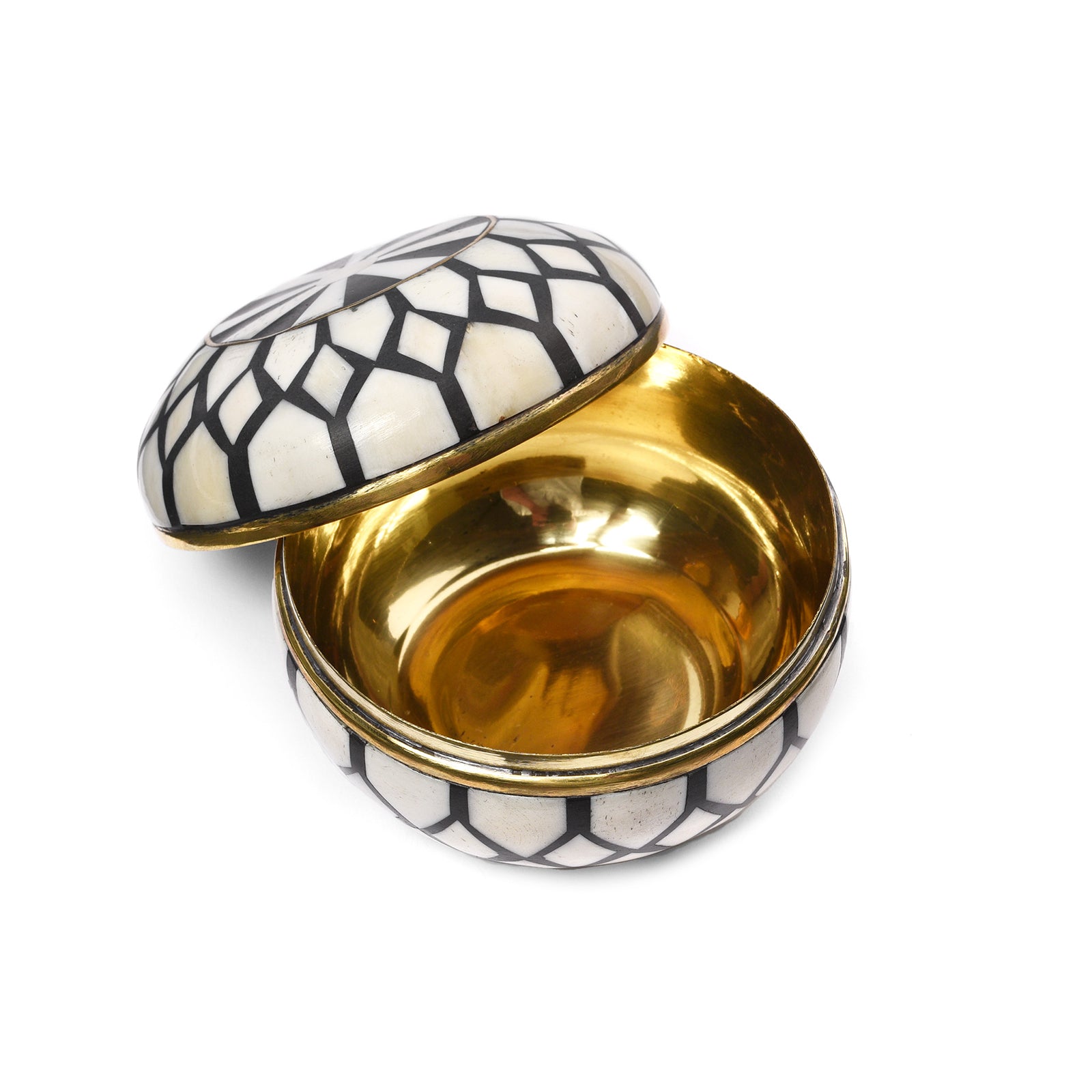 Crafted in the Mughal style, this brass trinket box features intricate camel bone inlay and a sleek polished brass interior, making it ideal for storing cuff links or earrings with elegance and charm.