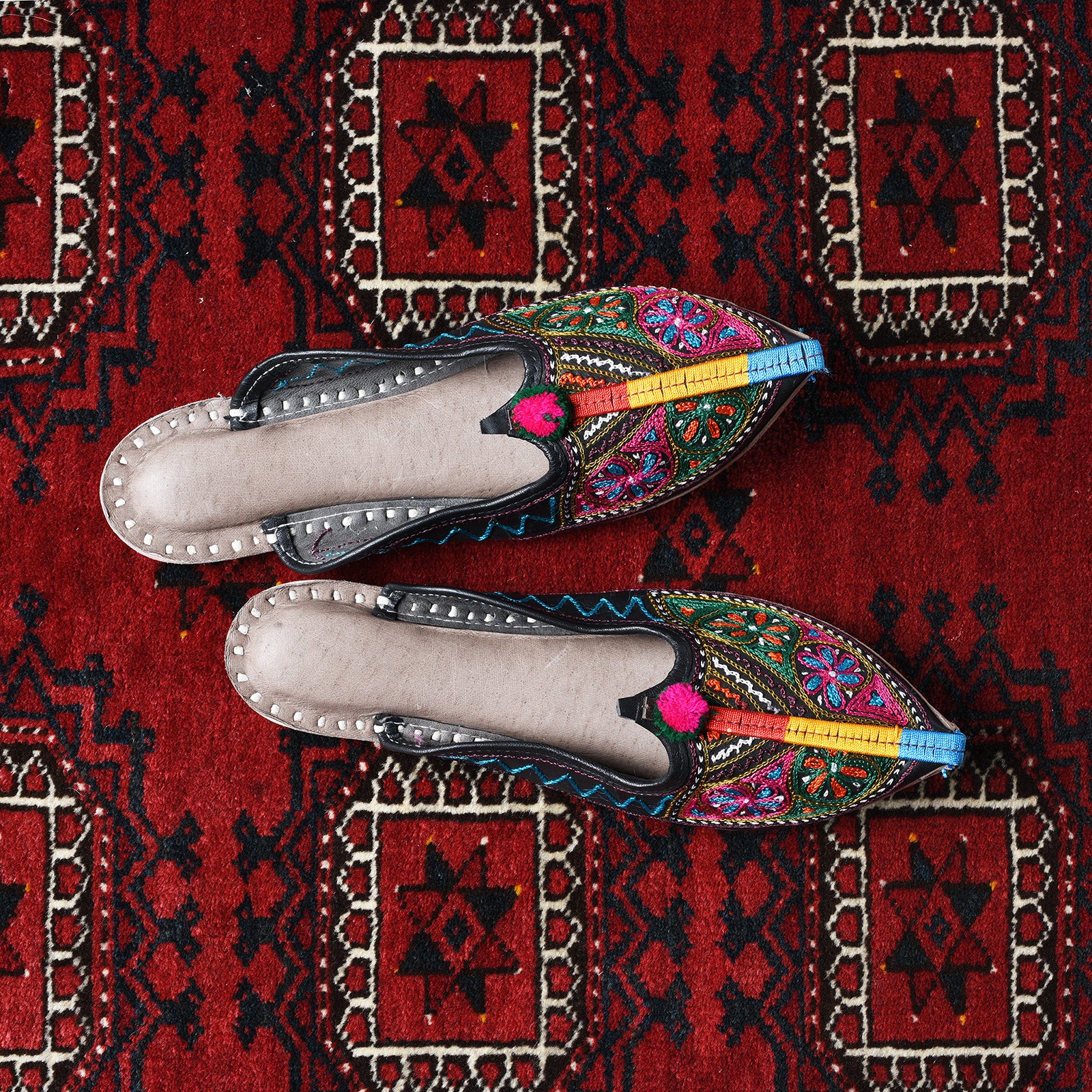 These lovely handmade leather jutti (or jooti) embroidered slippers are traditionally worn in Rajasthan by men and women. These ethnic slippers are seen throughout Northern India and are Indo-Persian in style. They are often referred to as Punjabi jutti.