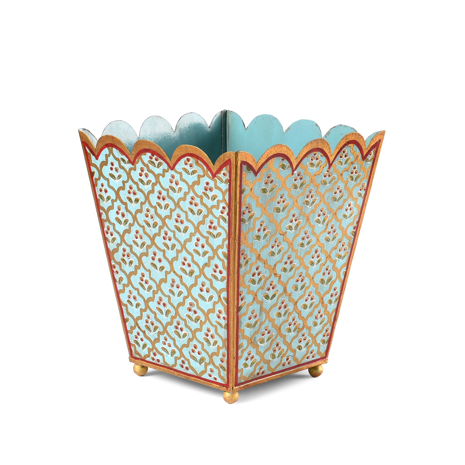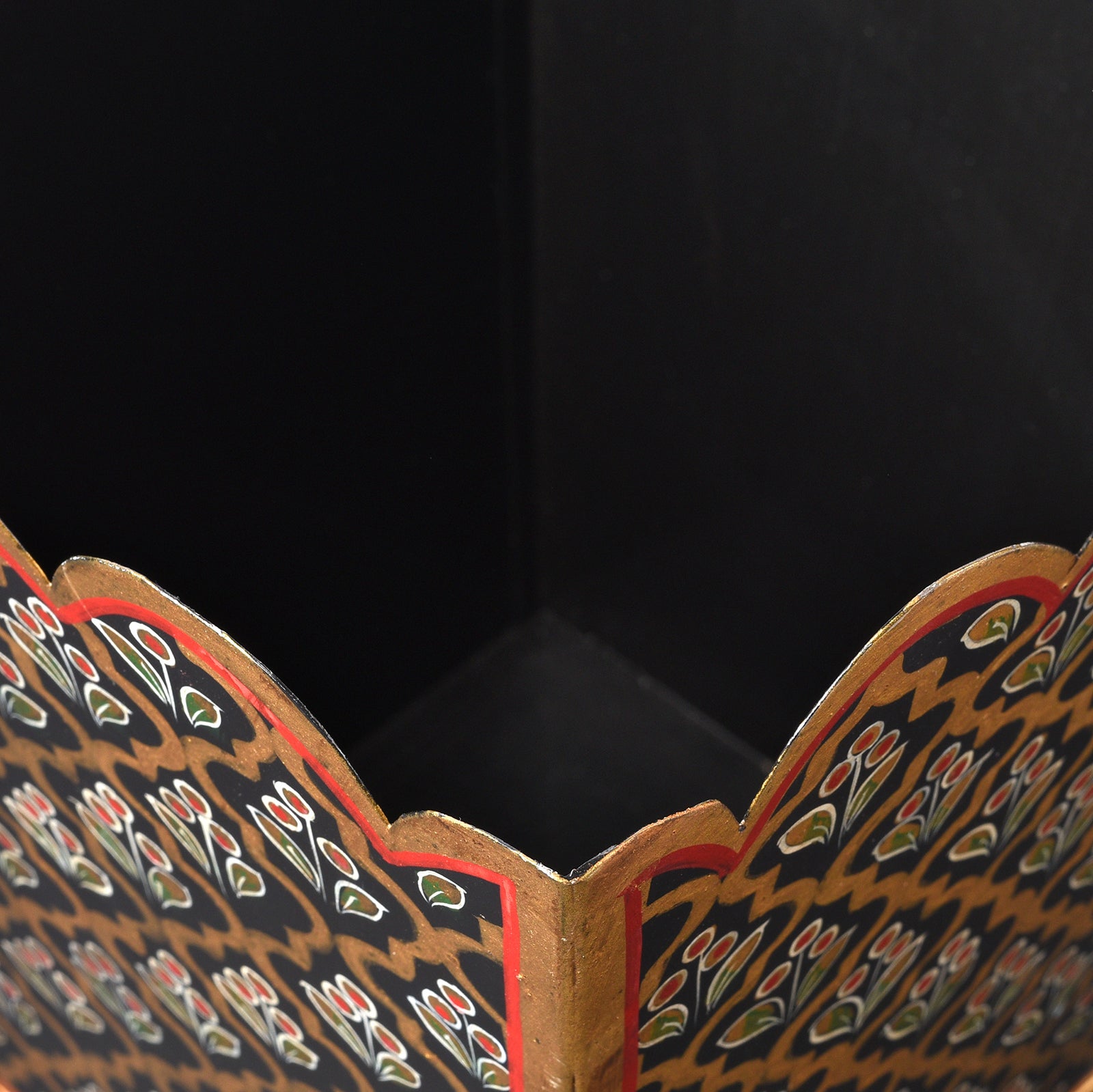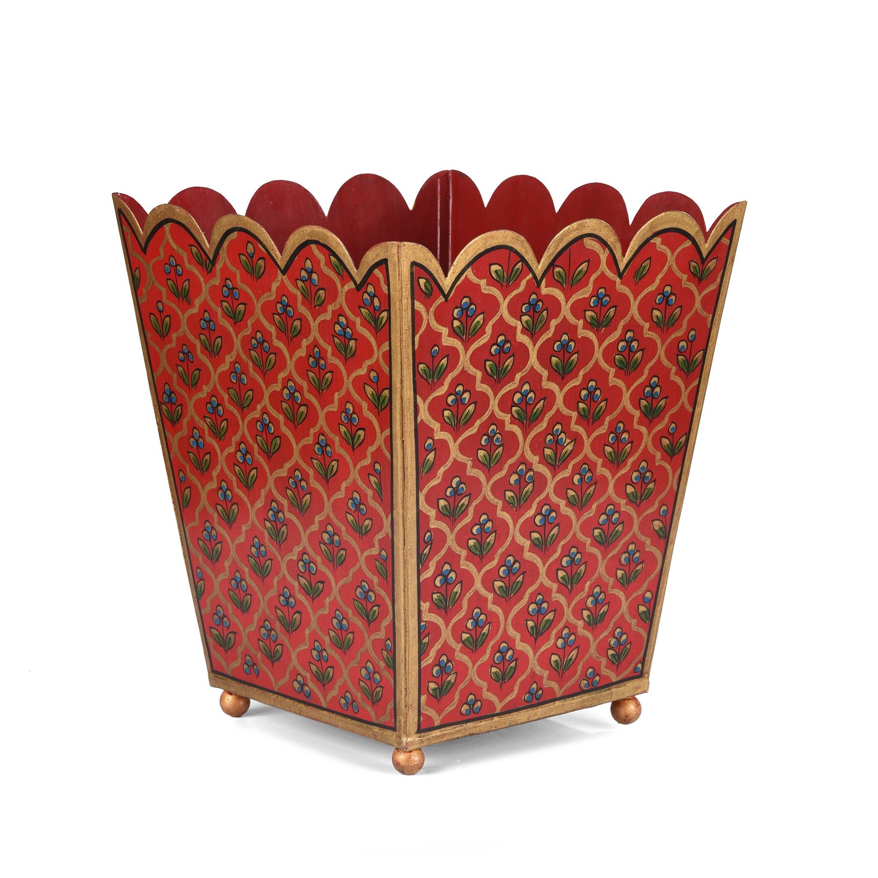 This painted toleware waste paper bin brings a touch of majestic India to your home. It doubles as a decorative planter and is hand painted in traditional Rajasthani designs. It is hand made from recycled tin & iron.