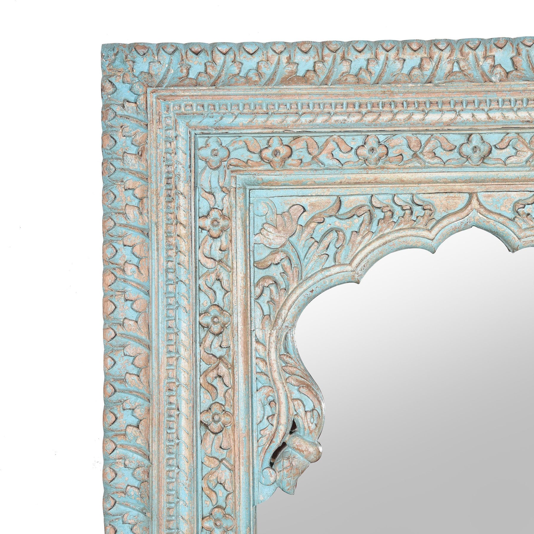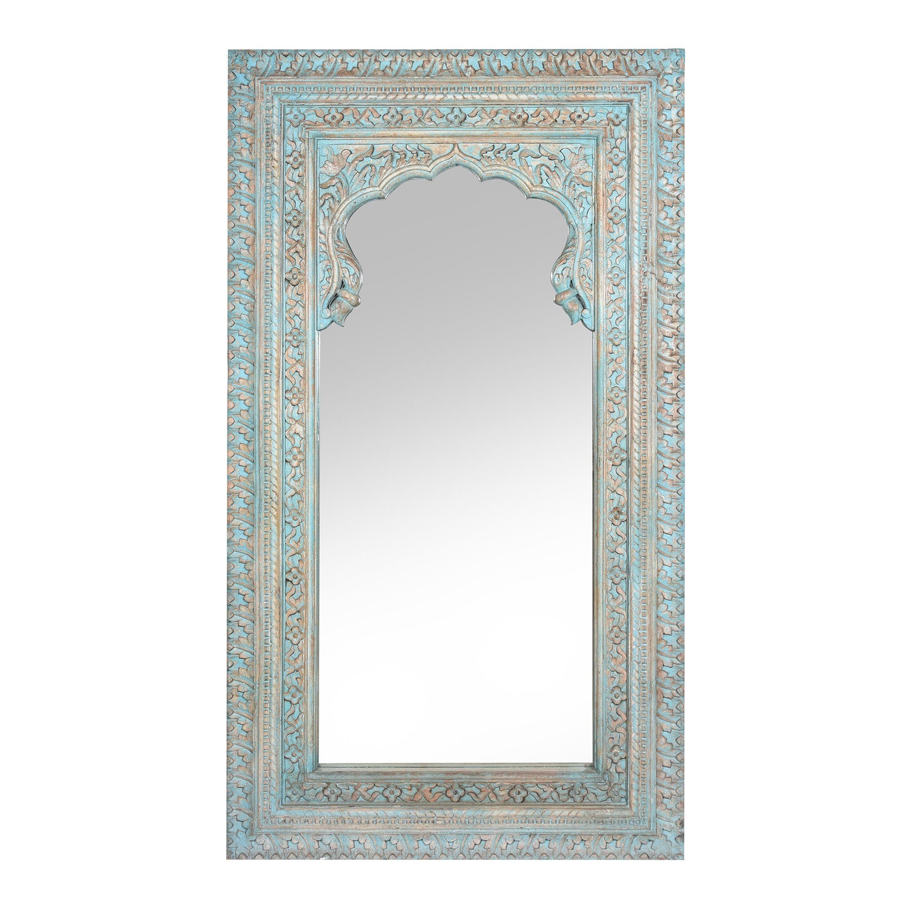 Carved Wood Mihrab Mirror Frame with a Sky Blue and limed finish - from Rajasthan. This classic Mughal design is seen throughout Northern India. Glass supplied in India may have some small scratches or imperfections.