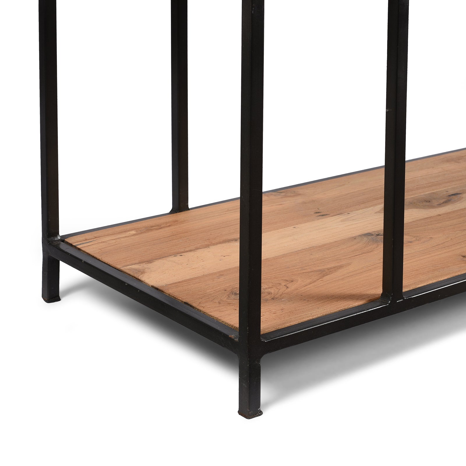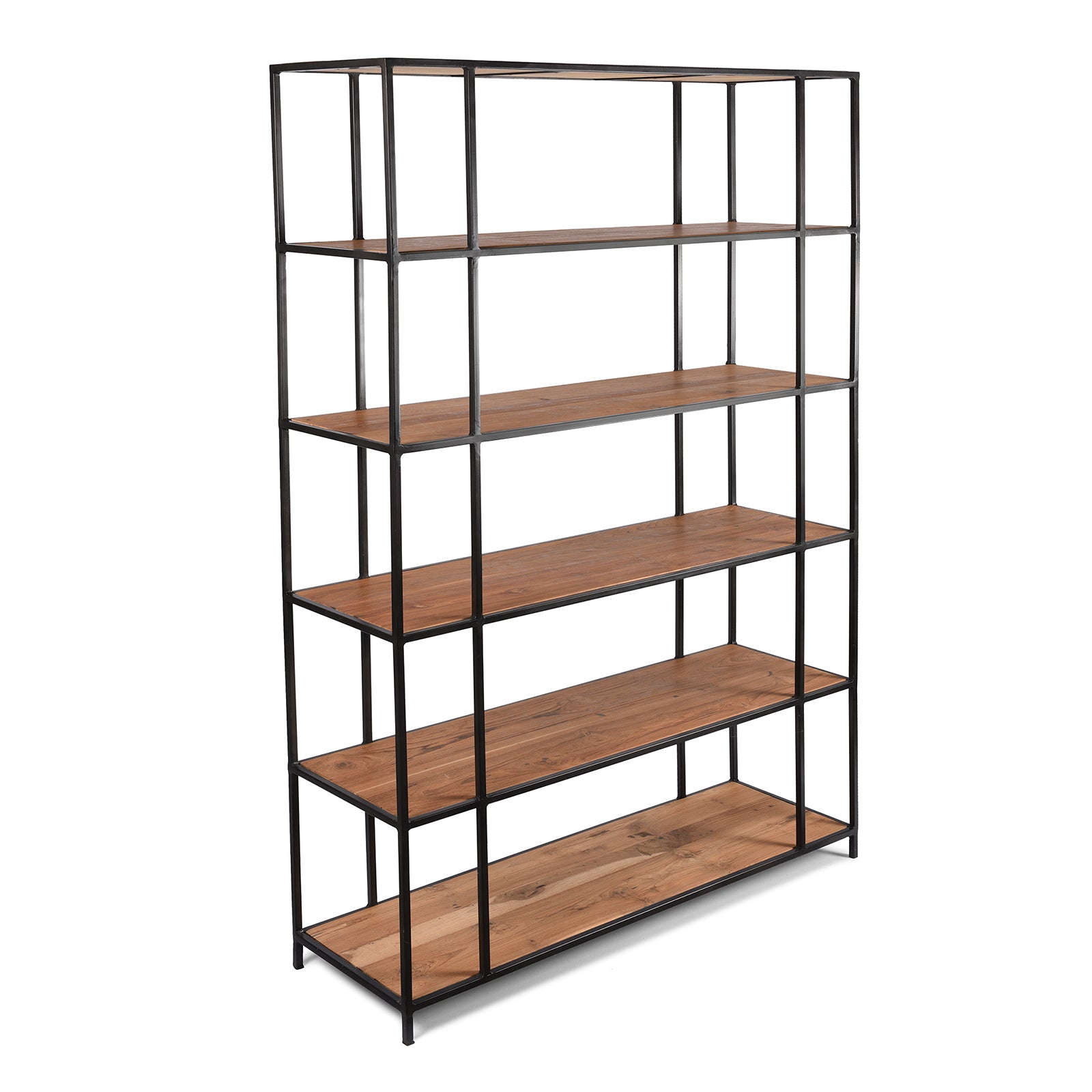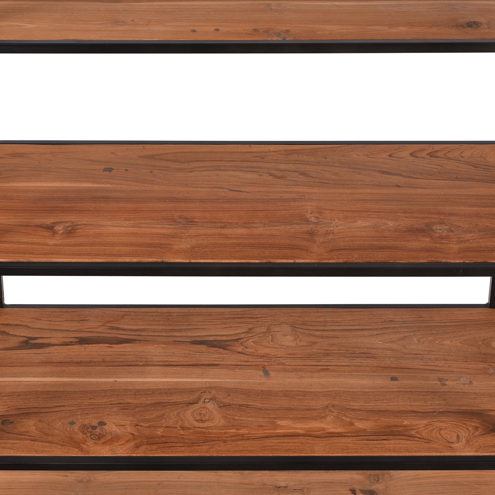 This decorative shelving unit blends contemporary iron lines with five natural teak wood shelves.