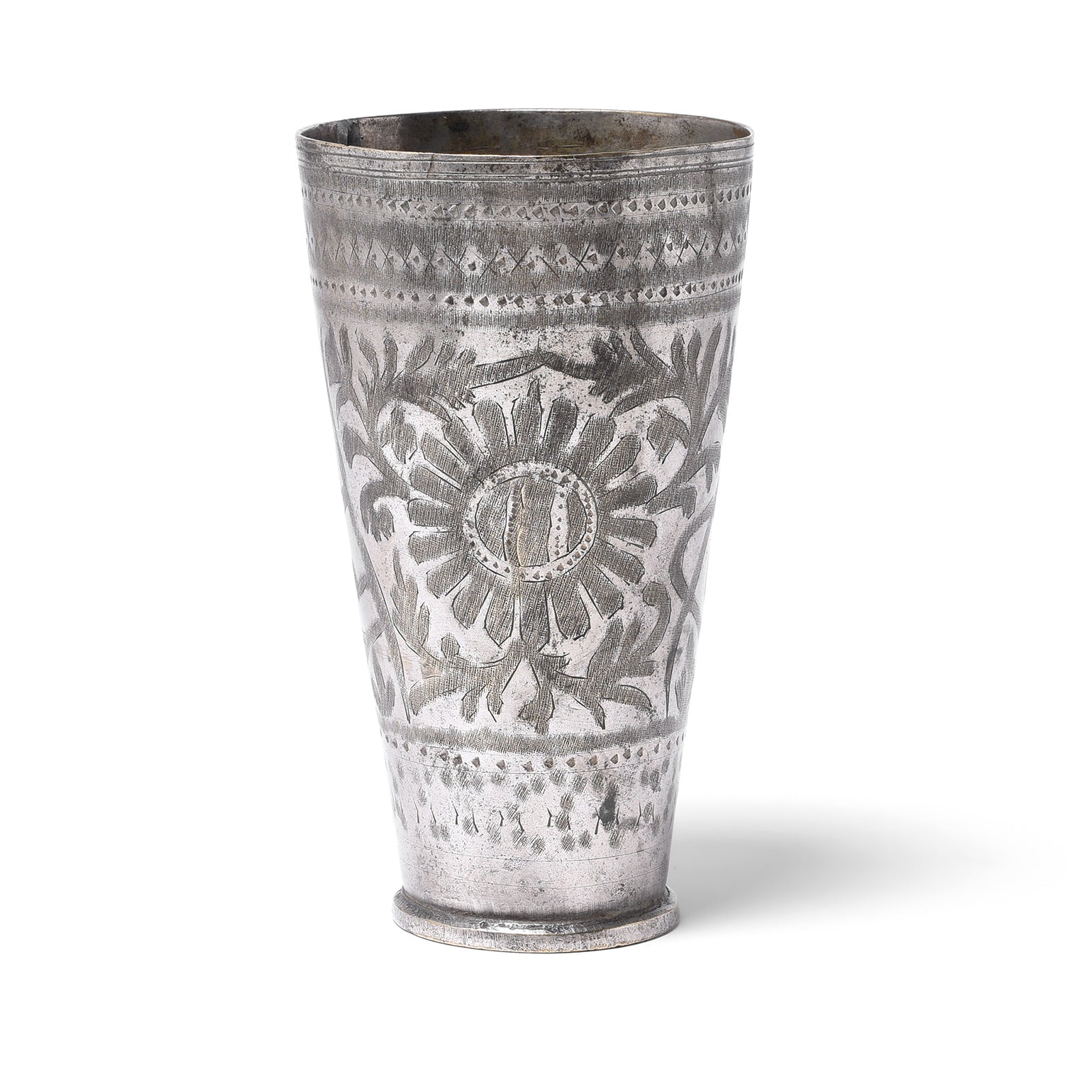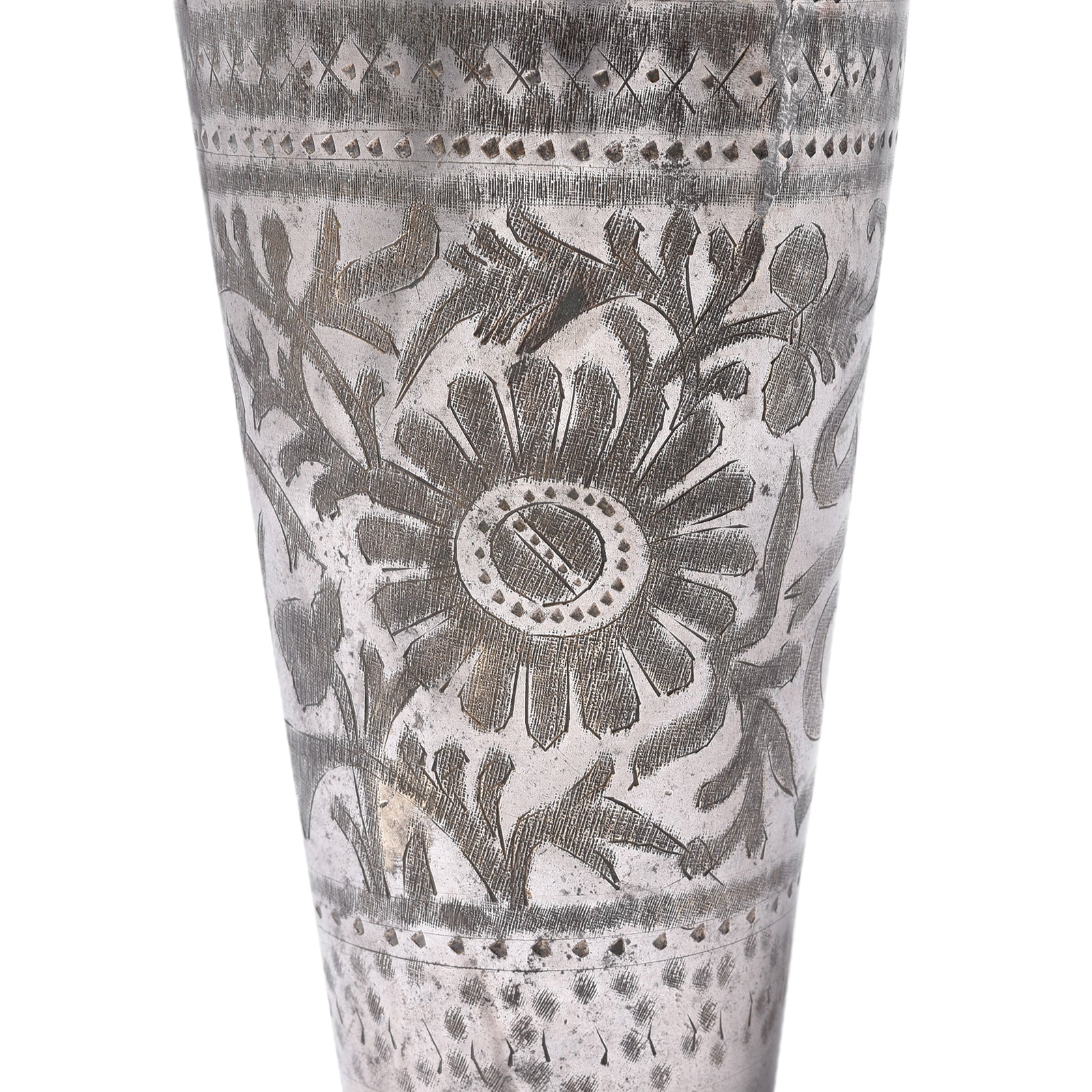 This old Indian lassi cup is from North India is made from nickel plated brass. Each one has its own hand etched Mughal design. They date back to the early 20th century, circa 1920.