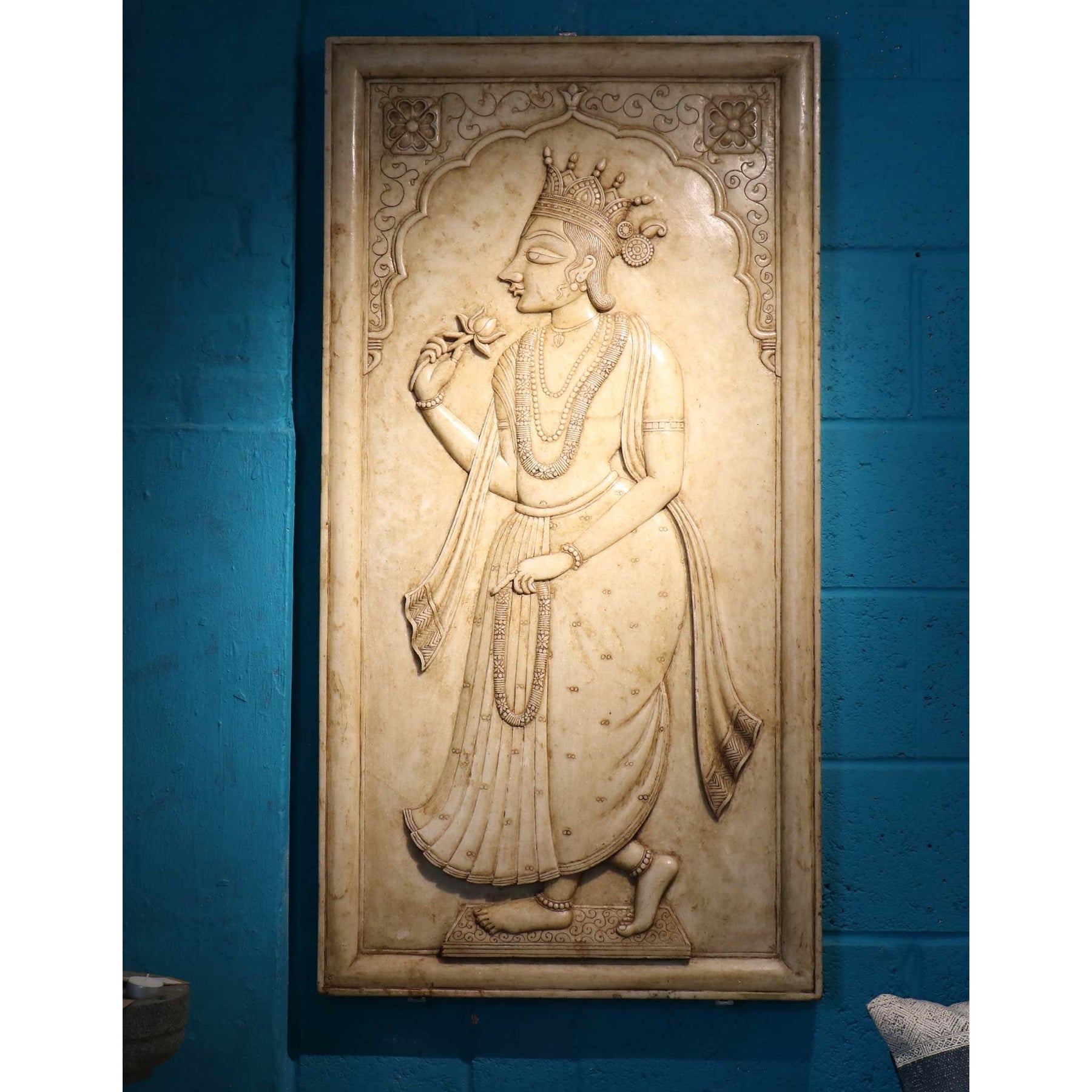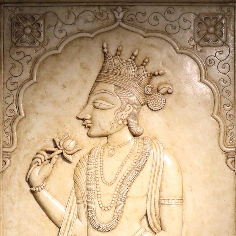 Carved from creamy-hued marble in Udaipur, this elegant pair of wall panels (sold separately) depicts a regal Maharaja and Maharani in classic Rajput style. Each figure is shown in graceful profile, holding a lotus flower - a symbol of purity and divine beauty in Indian art. Their richly detailed dress and jewellery are captured with fine relief carving, framed by a scalloped arch and scrolling foliate borders.