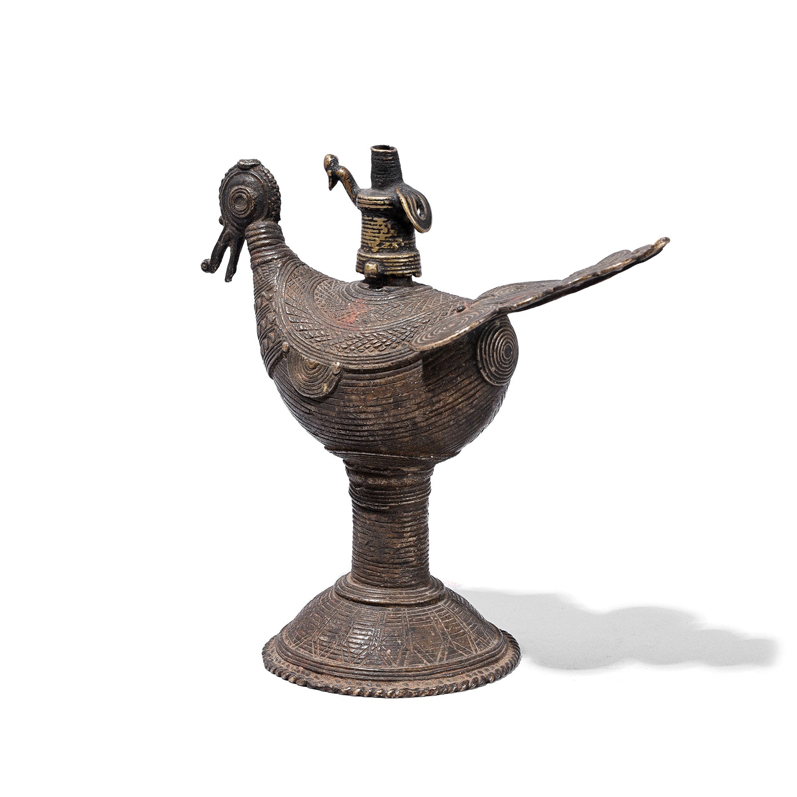The body of the lamp is ingeniously formed as a stylised peacock, a symbol of beauty, protection, and spirituality in Indian culture. The hollow body serves as a reservoir for the oil, while the removable top holds the wick. The surface is richly decorated with incised geometric patterns, concentric spirals, and textured bands, all characteristic of Dhokra metalwork. The lamp stands on a circular foot, giving it both stability and an elegant vertical presence.
