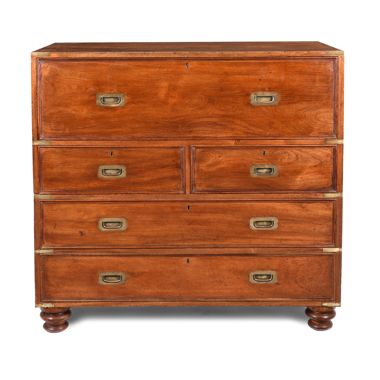 This Chinese export campaign chest is made from solid camphor wood and is classic of the style with a secretaire and pigeonholes concealed within the top drawer. Being made from camphor wood, these chest of drawers were made in Canton in China and shipped either 4420 miles to Calcutta or 5135 miles to Bombay for export to officers of the British army in India during the 19th century.