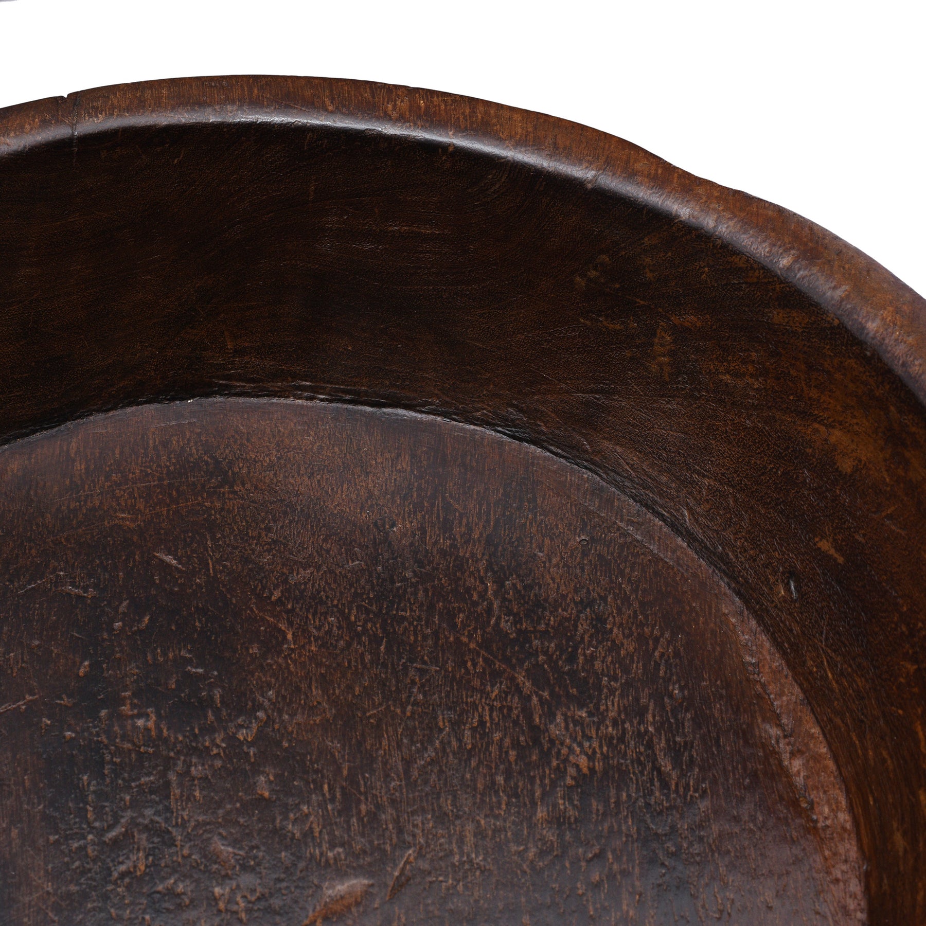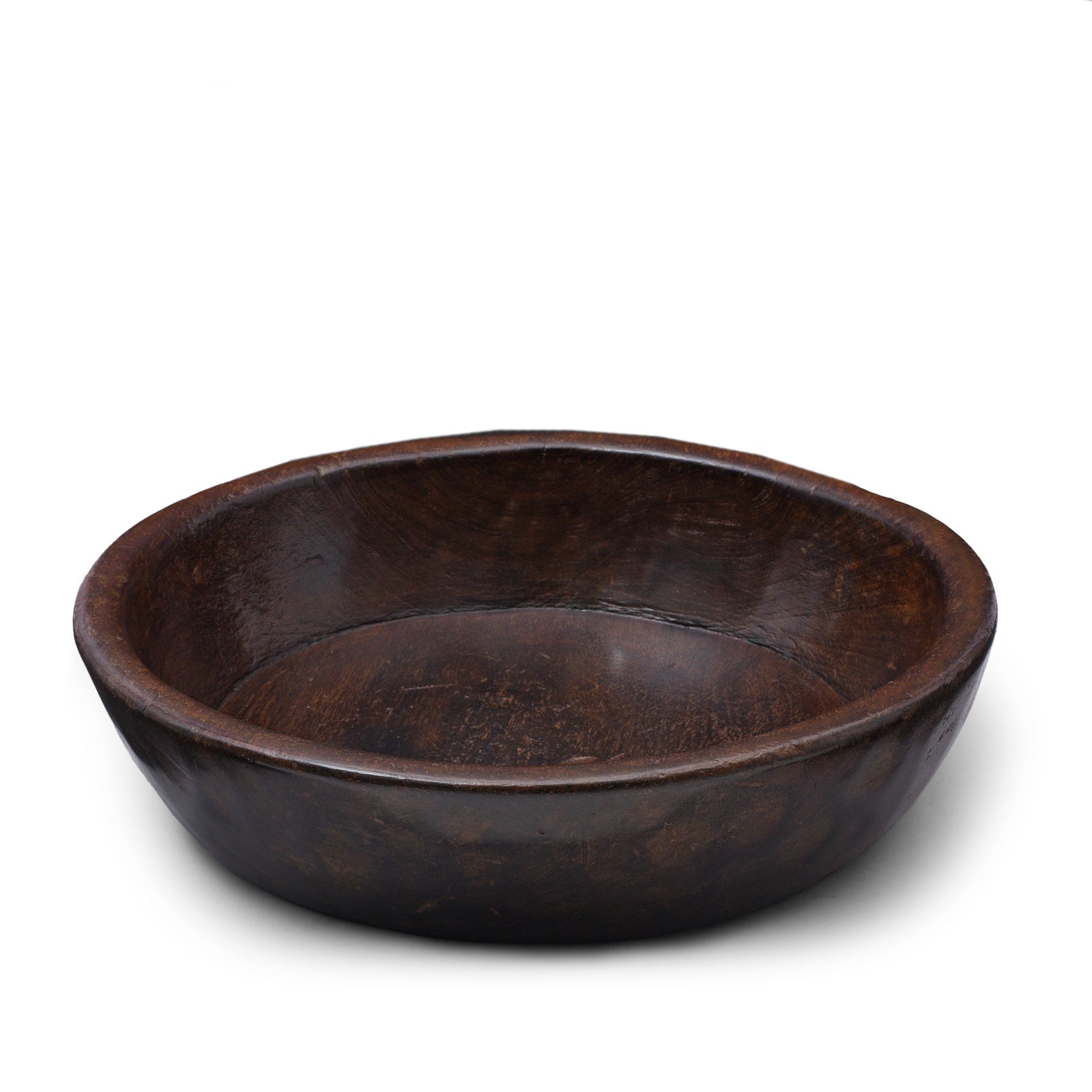 This original Indian parath bowl, crafted in the early 20th century is made from a single piece of sturdy teak. These bowls were traditionally used for mixing dough to create chapatti and paratha bread. The rich patina on our old parath bowls is a result of years of regular use, making them a valuable addition to any kitchen. This one was originally from Rajasthan.