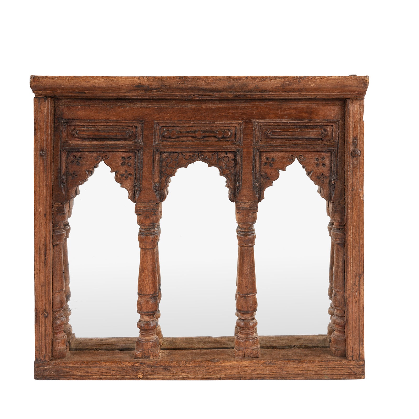 This exquisite 19th century Indian mirror is made from beautifully patinated teak and is converted from a triple arch window originating from Rajasthan, India. Resonating a strong Mughal influence, its timeless craftsmanship and stunning details will bring a unique and refined presence to any space.