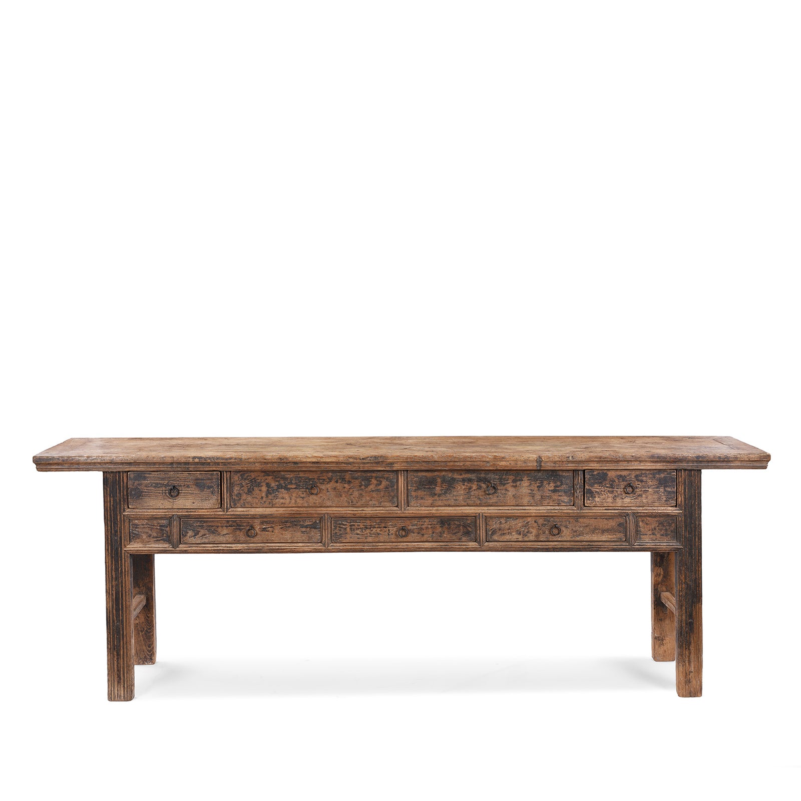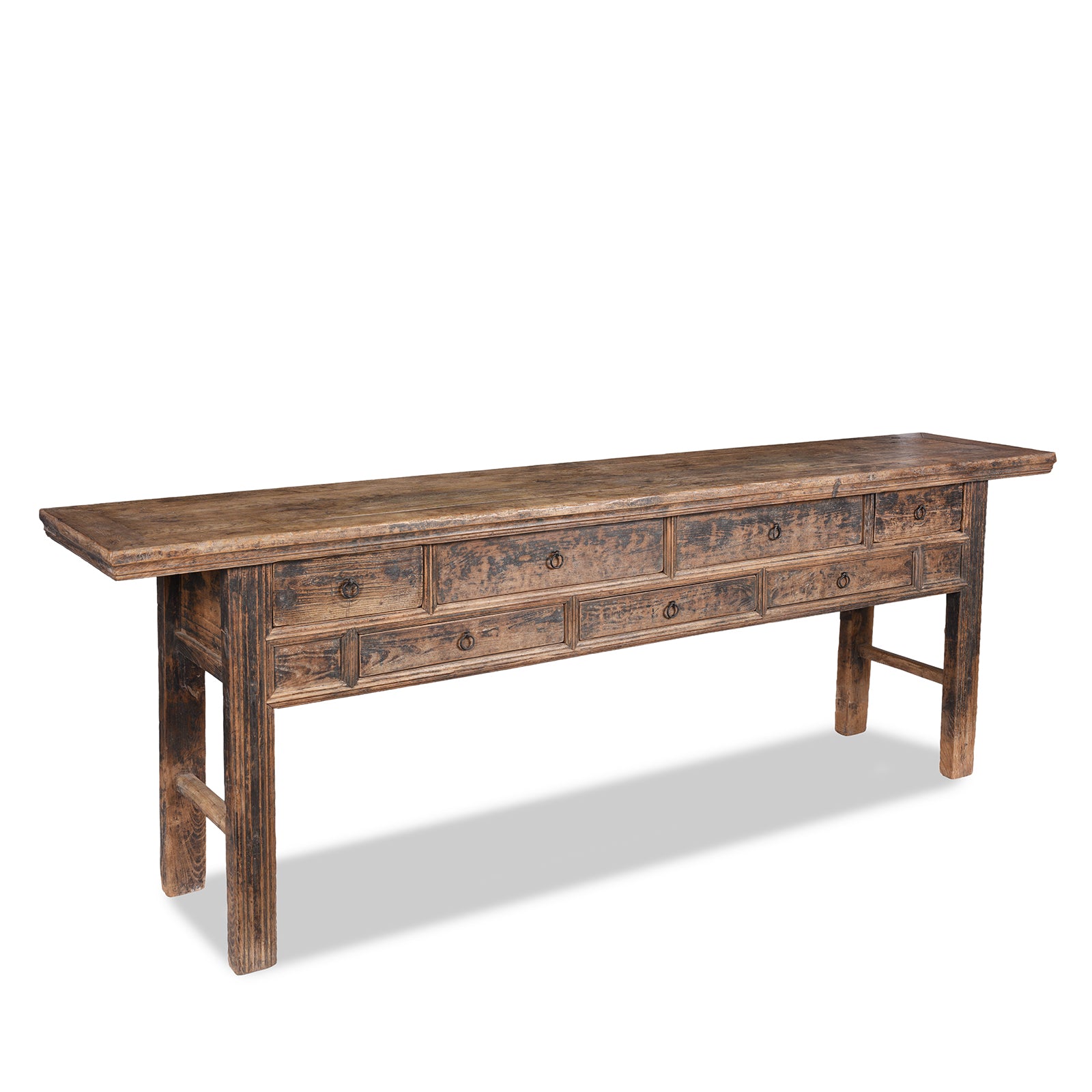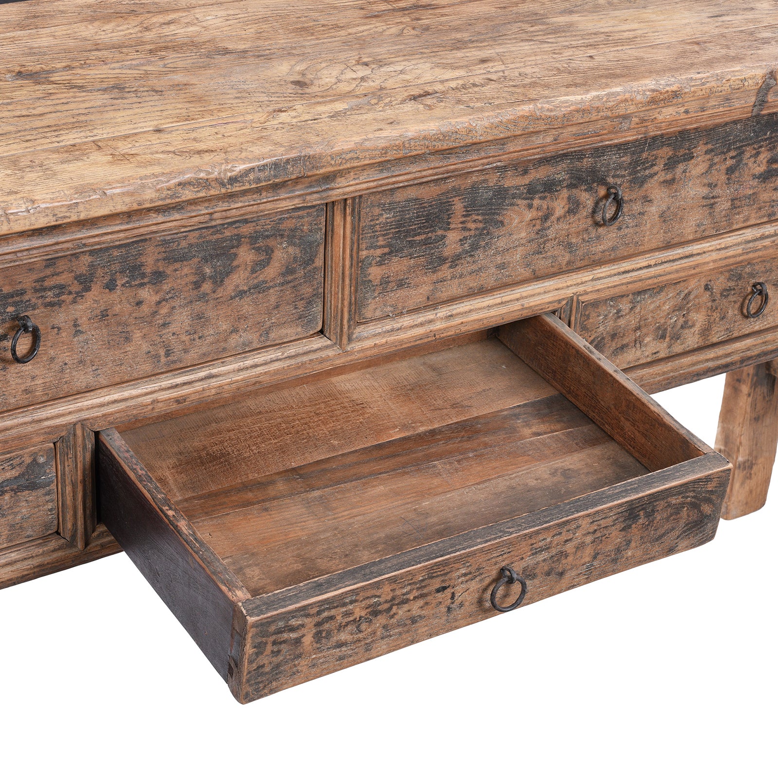Antique Chinese Elm Console Table With Seven Drawers And Rustic Aged Patina
