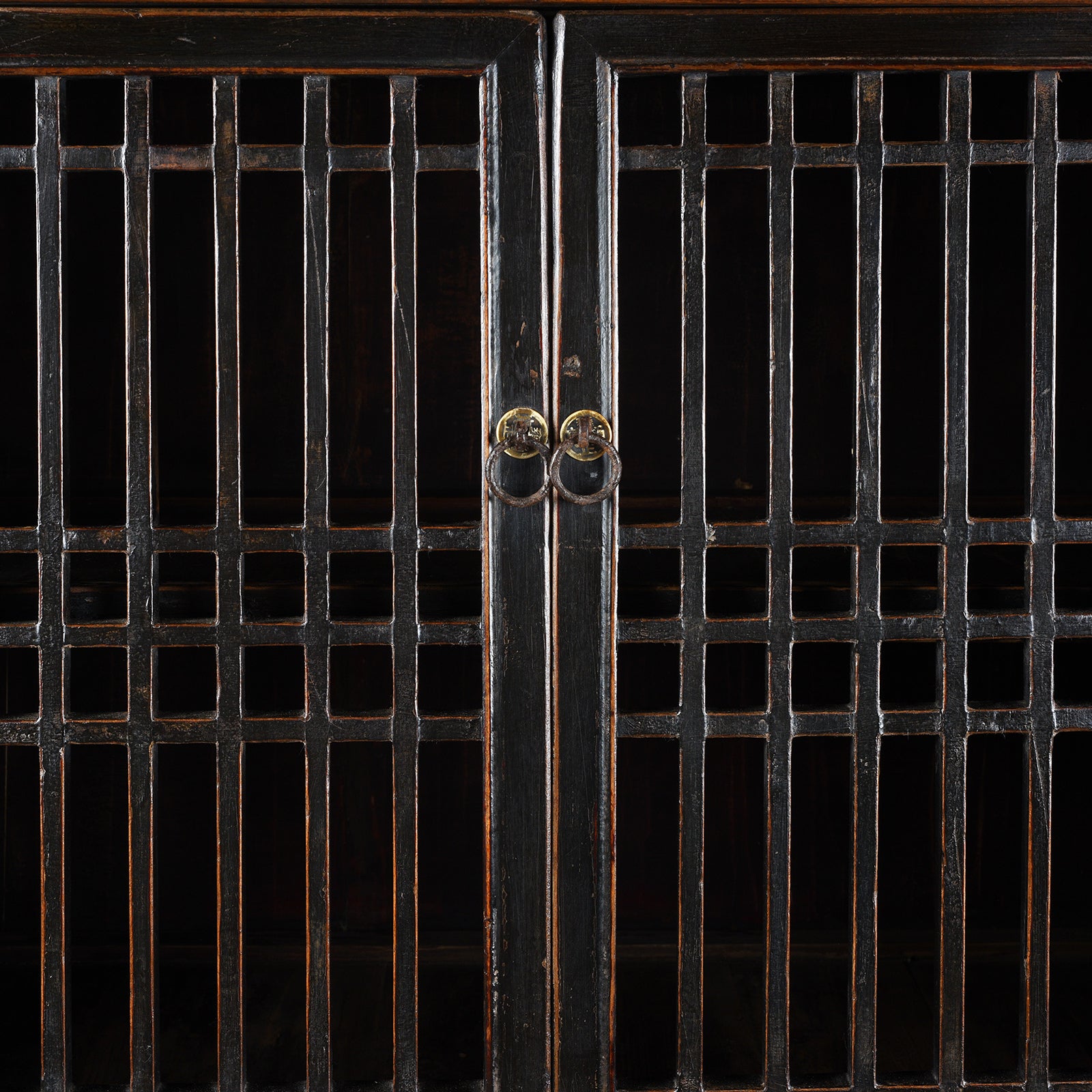 This striking 19th-century kitchen cabinet from Shandong, China, is a superb example of traditional Chinese joinery and understated design. Crafted from richly patinated soft wood, its elegant proportions and lattice-panelled upper doors reflect influences from Ming-era aesthetics - celebrated for their graceful simplicity and balance. The cabinet's original purpose was practical yet refined: to store and air-dry noodles and other foodstuffs in family kitchens across northern China.