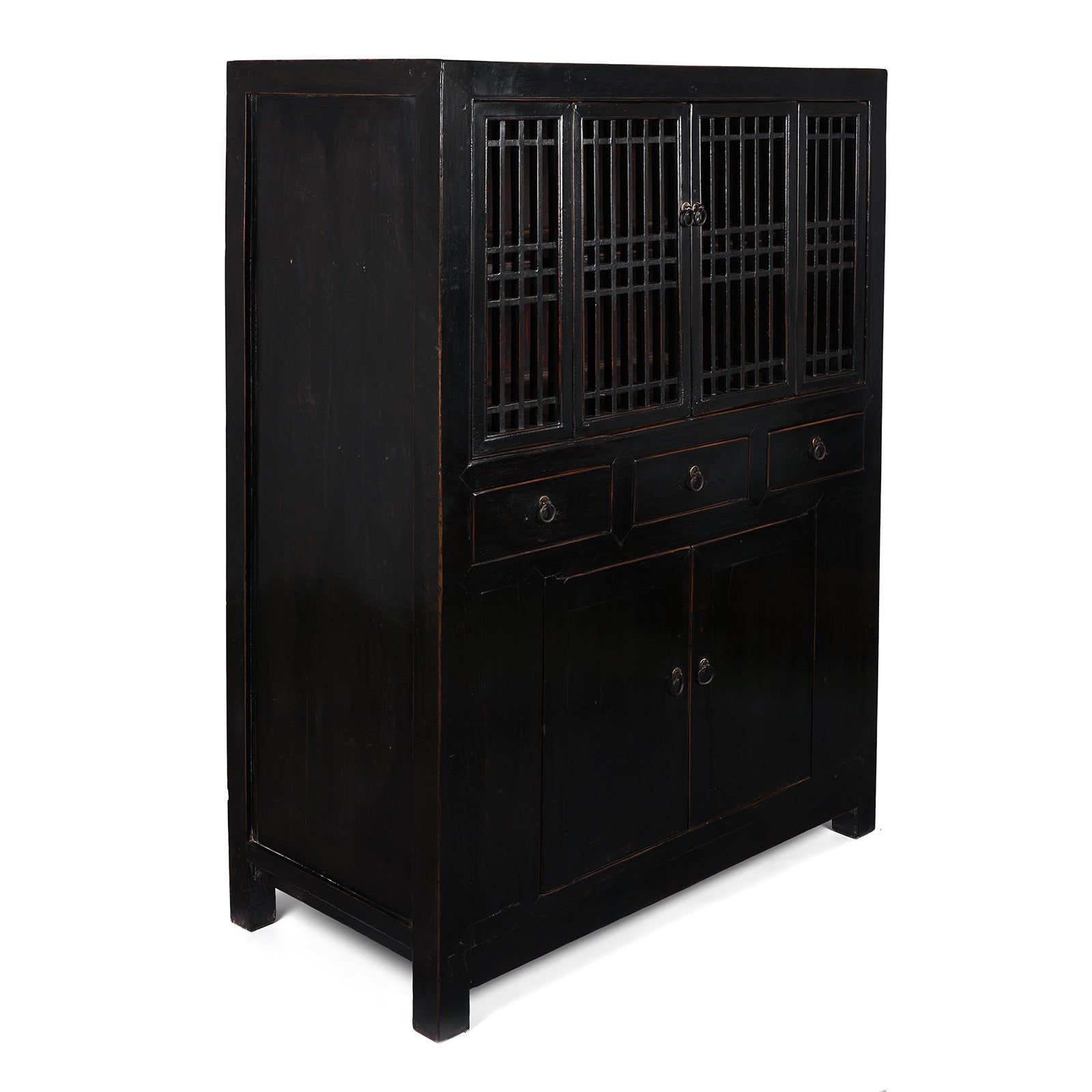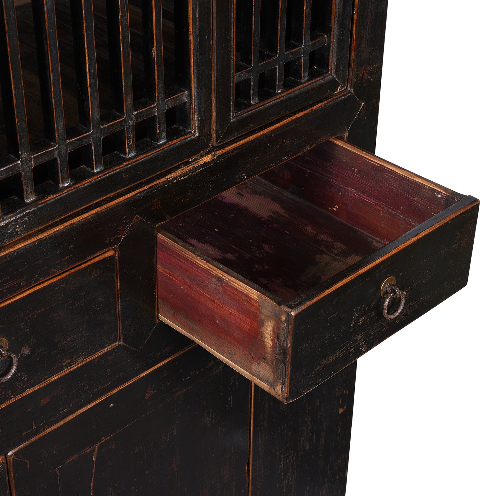 Interior View Of Antique Chinese Black Lacquered Cabinet With Upper Lattice Doors And Lower Panelled Cupboard And Drawer Section