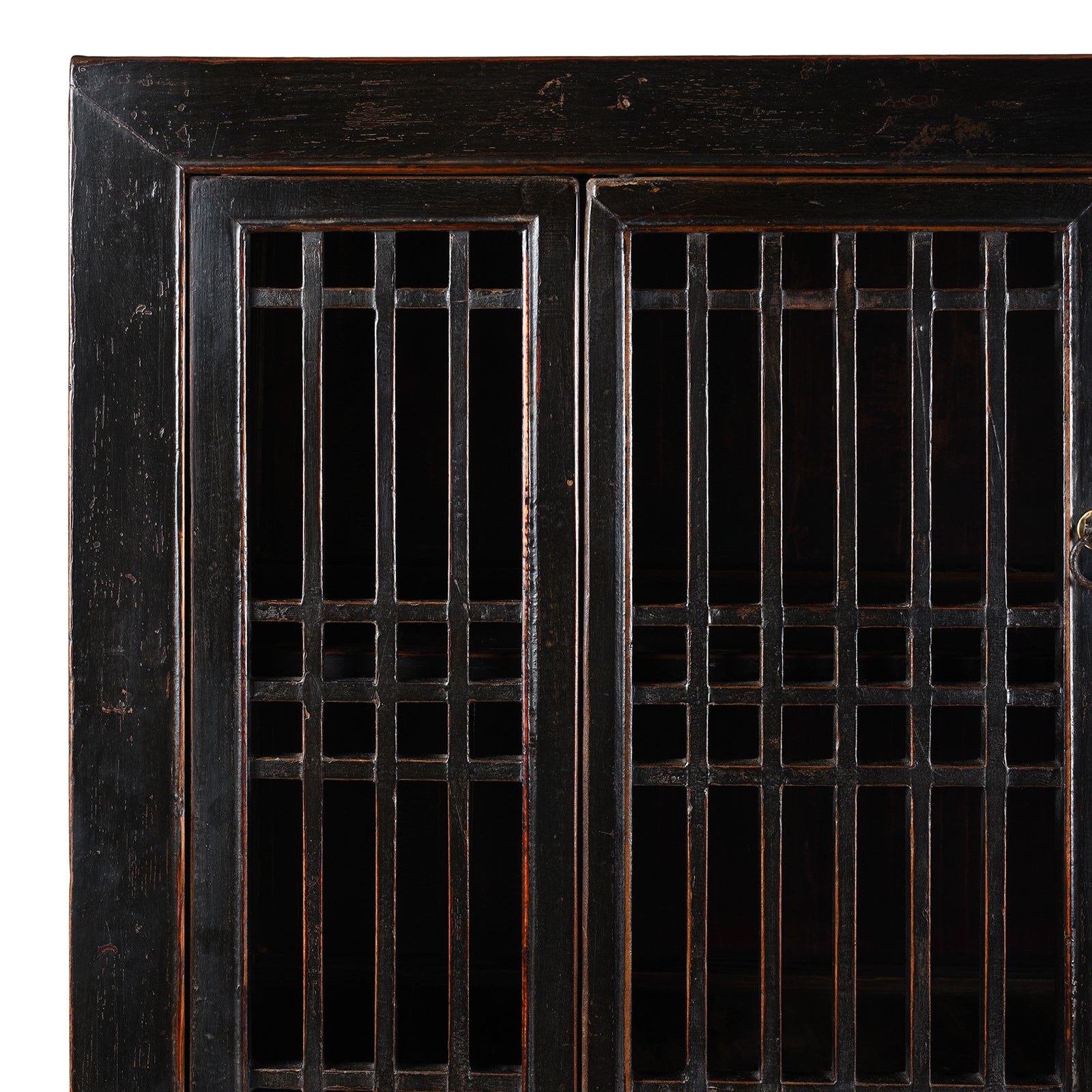 Detailed View Of Lattice Doors From Antique Chinese Black Lacquered Cabinet With Upper Lattice Doors And Lower Panelled Cupboard And Drawer Section