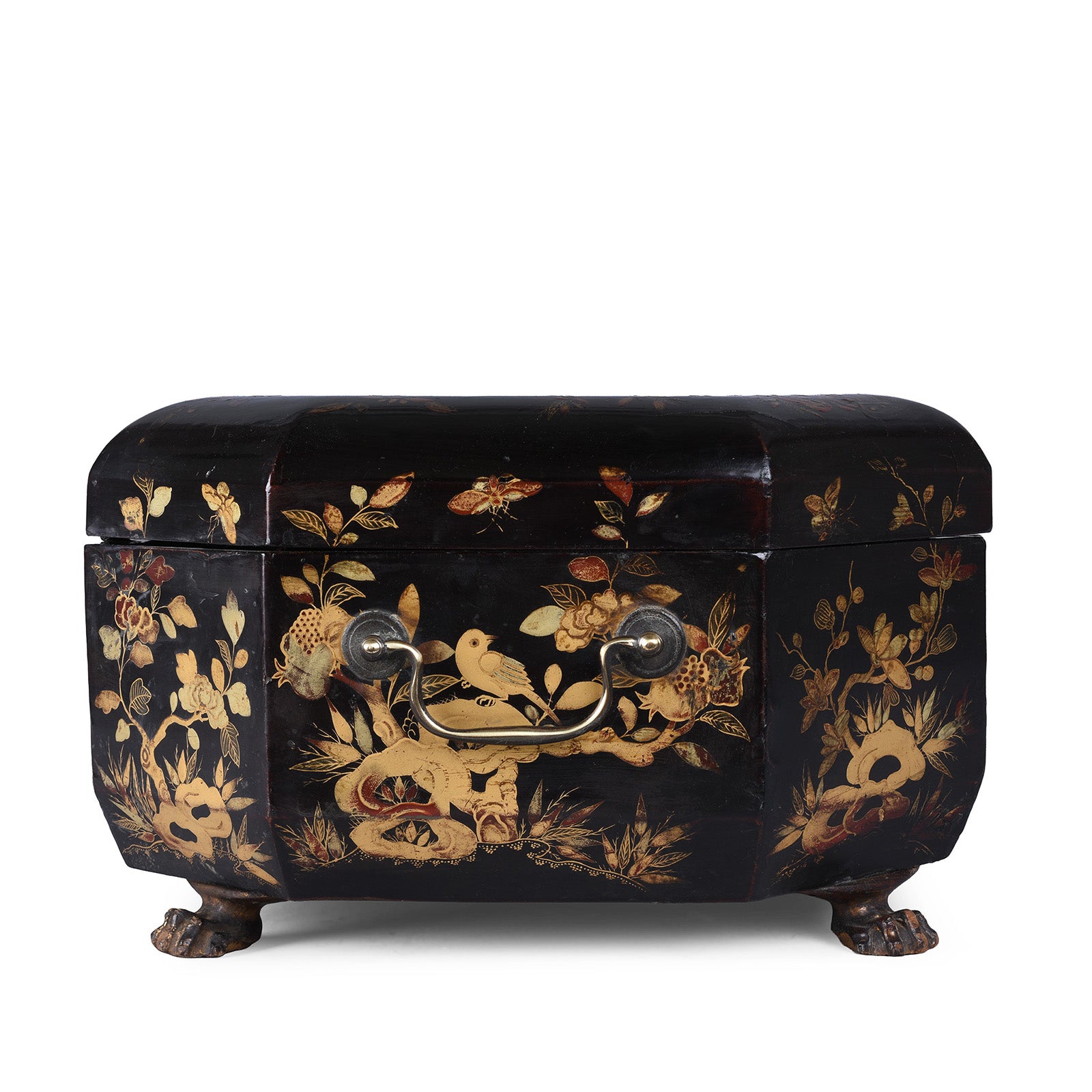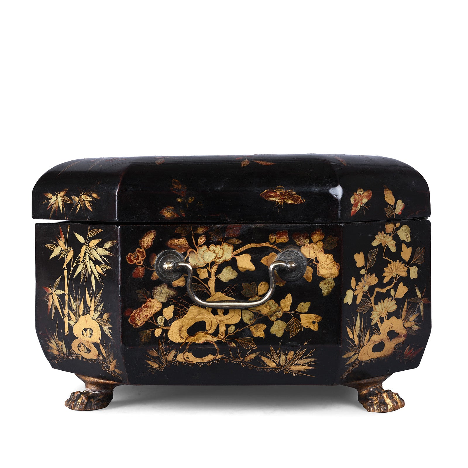 Raised on distinctive paw-shaped feet, the box also retains its original side handles, allowing it to be carried easily. Inside, a fitted and compartmentalised interior provides storage for sewing implements, jewellery, or small personal items. Canton export pieces are often found today with significant damage, particularly to the lid, making the condition of this example especially notable. The box has been carefully checked in our workshop, with minor stabilising restorations carried out to preserve the lacquer and slow the ageing process.
