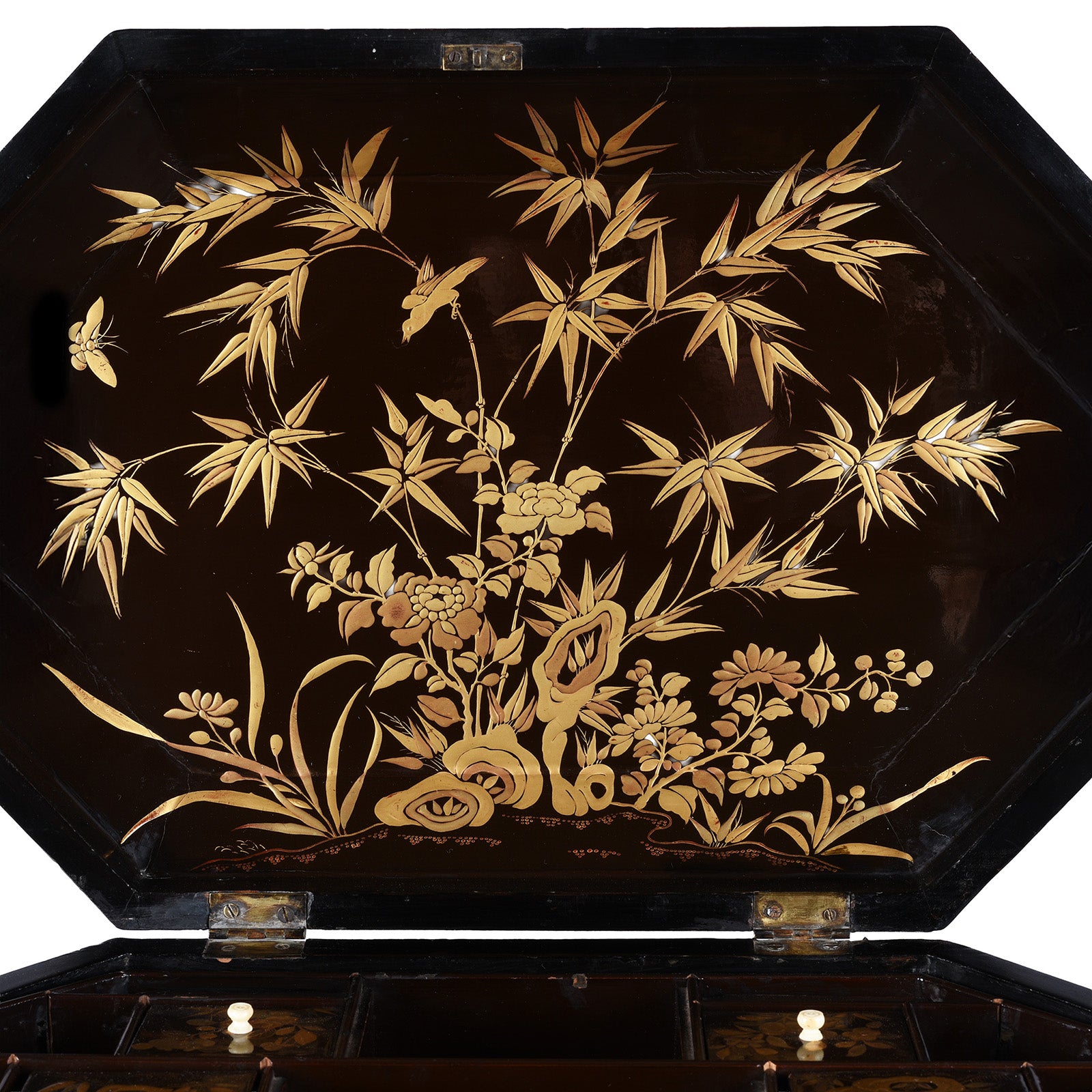 The box is richly decorated in gilt and polychrome lacquer against a deep black ground, with scenes of flowering branches, trees, birds, and garden motifs wrapping around all sides. The hinged lid opens to reveal a beautifully painted interior panel featuring bamboo, flowers, and foliage, executed with the same delicacy and attention to detail as the exterior. The overall decoration reflects the refined aesthetic developed by Canton workshops for the export market.