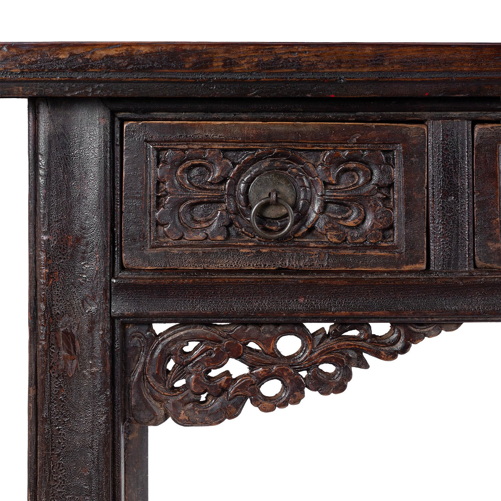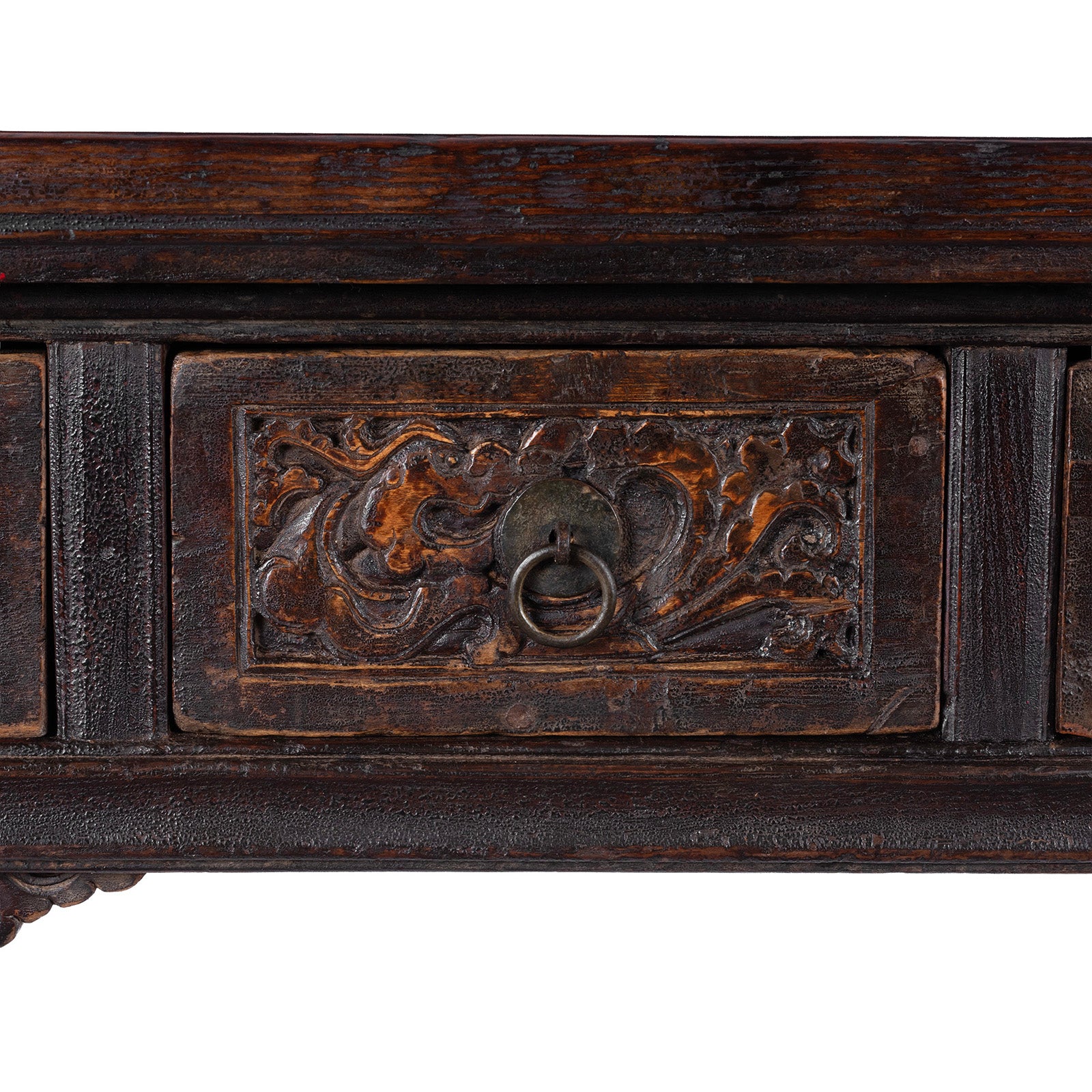 Three poplar (yáng mù 杨木) drawer fronts are carved with intricate floral panels, their soft depth and subtle mouldings framed by original ring pulls. Below, a pierced apron adds movement and delicacy to the design. With its generous length, understated presence and quietly sculptural character, this is an exceptional console for hallways, dining rooms or living spaces that value history and authenticity.