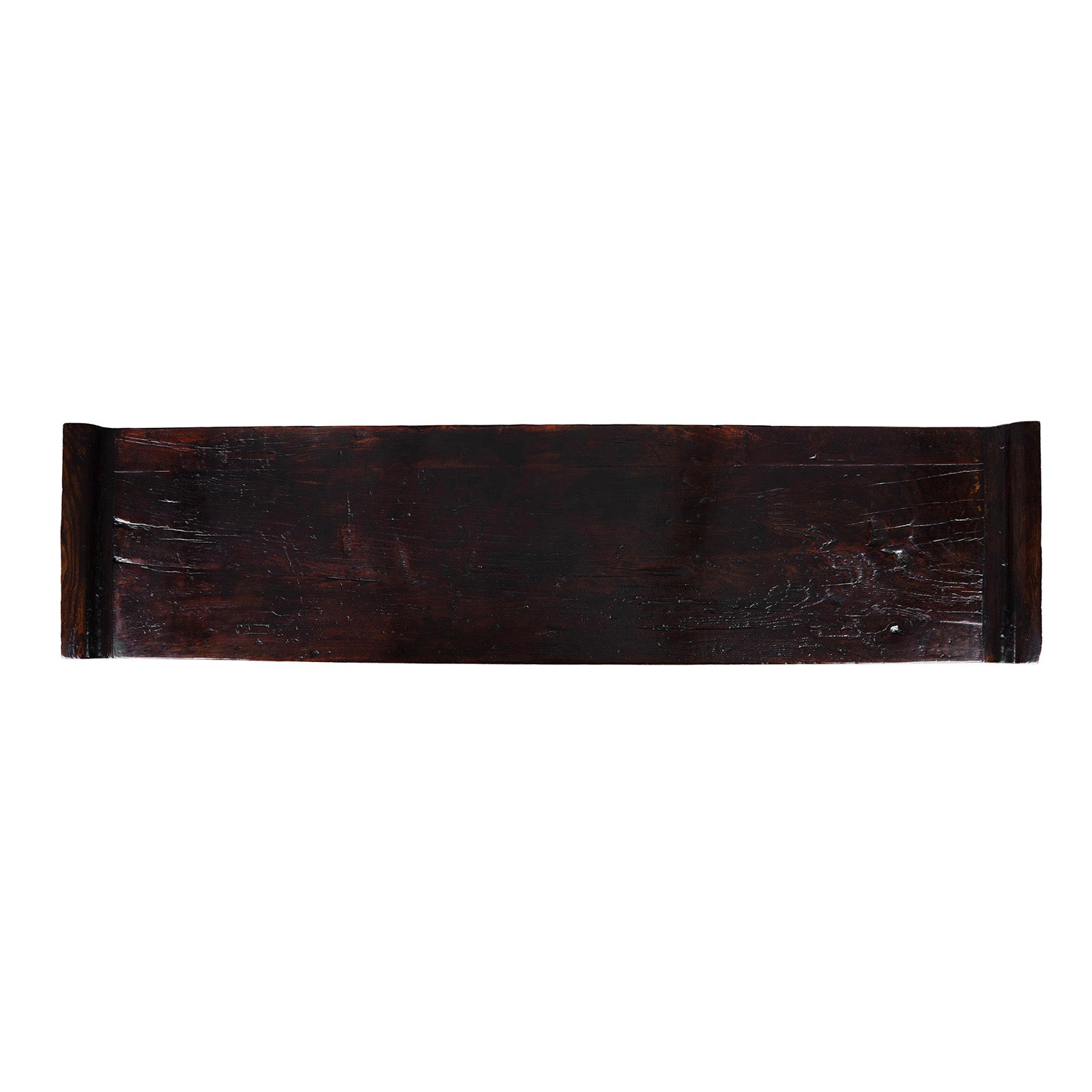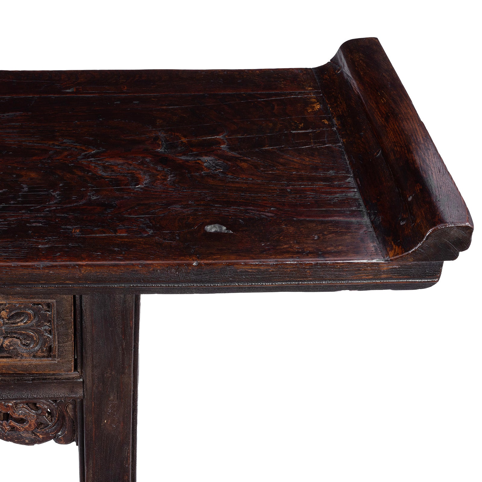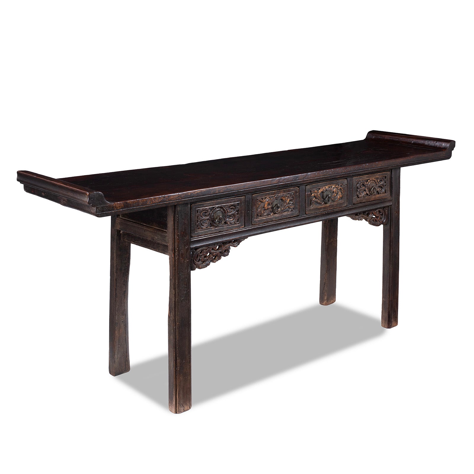 This elegant 18th century altar table from Shanxi is a refined example of northern Chinese craftsmanship, created for use in traditional ancestor worship. Families would hang an ancestral portrait above such a table, placing incense and offerings along its long, narrow top, a format distinctive to Chinese domestic interiors. Crafted from richly patinated northern elm (yumu 榆木) with generations of cube cracking the table shows a beautifully worn dark lacquer surface, with generations of use revealing warm natural timber beneath.