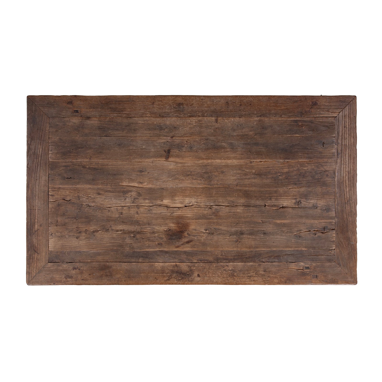 The broad, plank-constructed top and distinctive straight legs joined by double stretchers reflect classic Ming-style design influences, known for their balance, proportion, and restrained elegance. Crafted from aged northern elm, the wood’s surface bears a beautifully weathered grain and warm natural patina acquired through years of use.