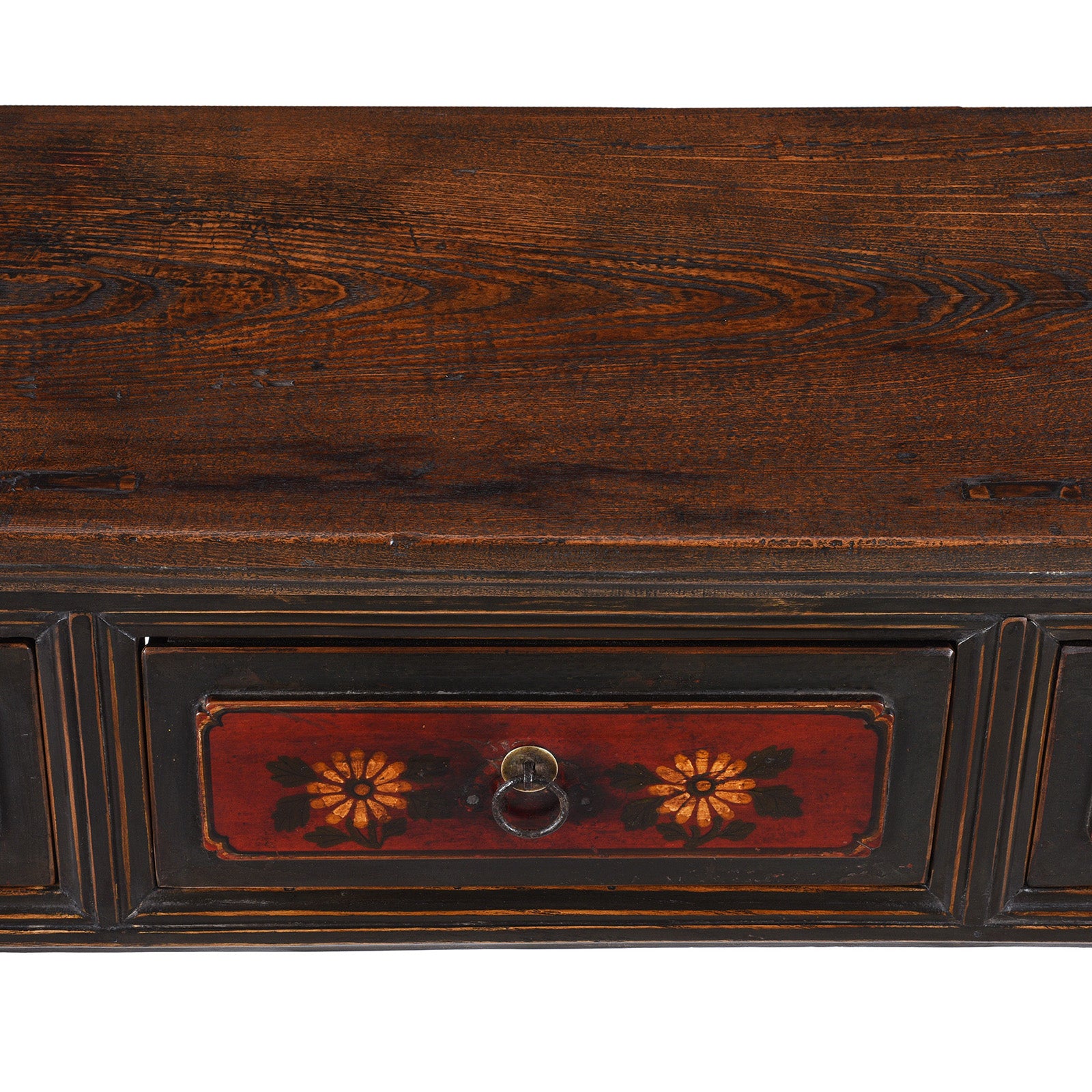 • Features: Long narrow form; four drawers with hand-painted floral motifs; worn lacquer surface with rich patina