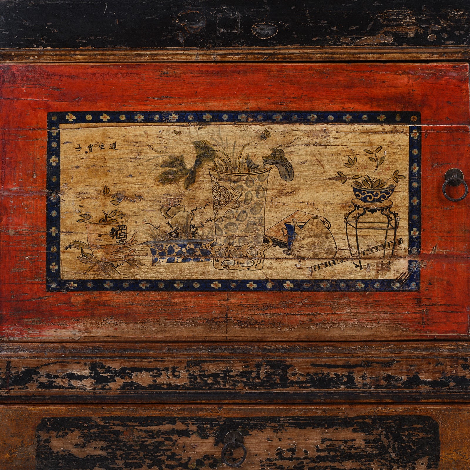 Originally designed to open from the top via a hatch, this sideboard has been sympathetically adapted at a later date with front-opening doors to improve functionality, while retaining its original character. The painted decoration on the doors is particularly appealing, depicting a refined arrangement of household objects associated with scholarly pursuits, wisdom, and cultivation, alongside floral motifs displayed on elegant stands. What makes this piece especially desirable is the high degree of originality: the painting, carving, and surface patina are all original and show honest wear consistent with age and use.