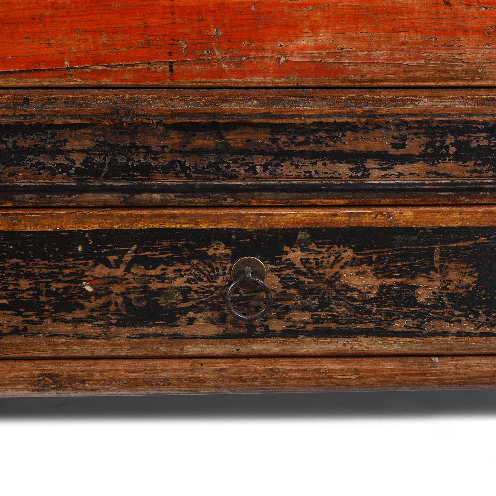 This antique Gansu sideboard dates to the 19th century and this style was traditionally used by nomadic communities across Gansu and northern Shanxi provinces for the storage of clothing and grain. Pieces of this type also served an important ceremonial role as altar cabinets for family ancestor worship, making them both practical and culturally significant objects within the home.