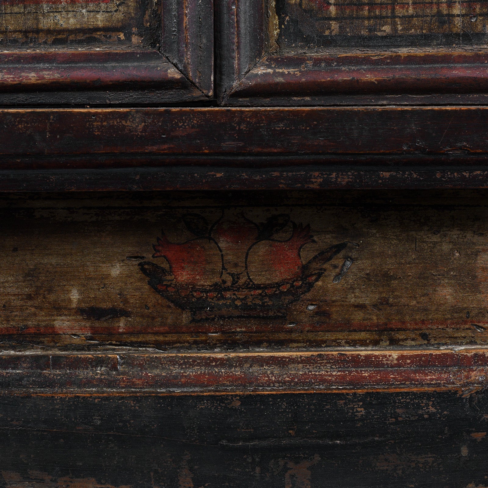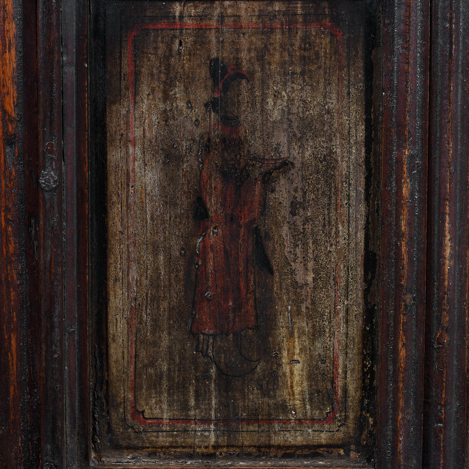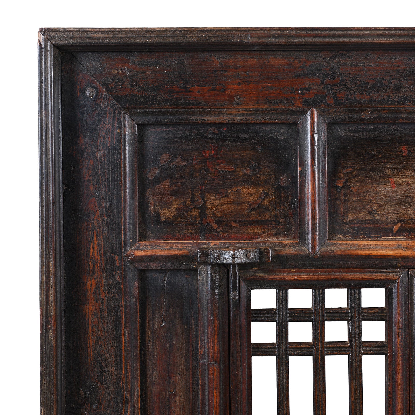 This beautifully aged Chinese lattice window showcases the refined craftsmanship of late-Qing artisans, carved from rich, time-worn elm wood with its original painted panels still softly visible beneath the patina. The upper section features a classic geometric lattice, allowing filtered light to pass through, while the lower panels retain traces of folk-figure paintings and floral motifs—each one softened by generations of use.