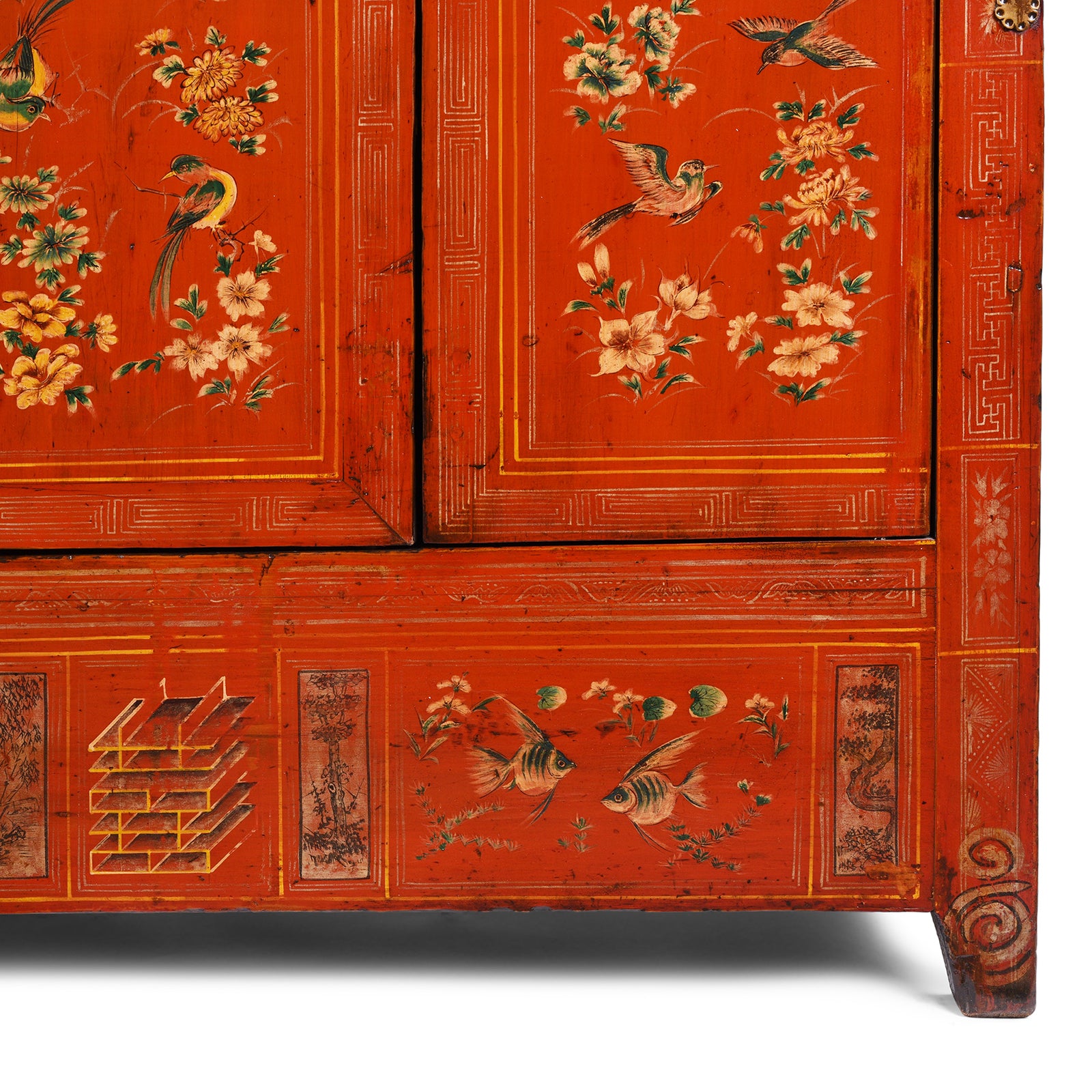 Interior Of Original Lacquered Chinese Sideboard From Dongbei Manchuria With Handpainted Floral And Bird Motifs In Bright Red Finish Circa 1920s
