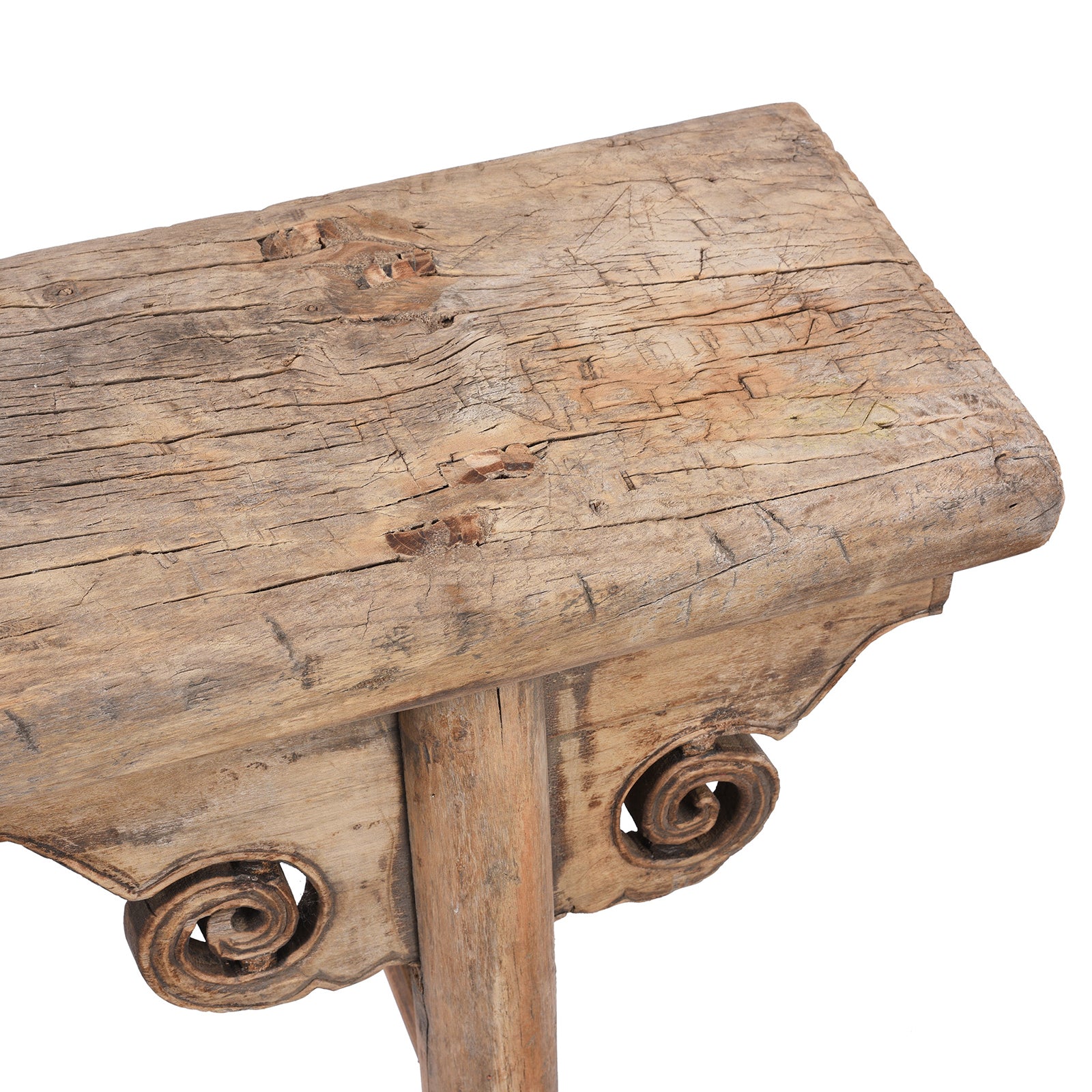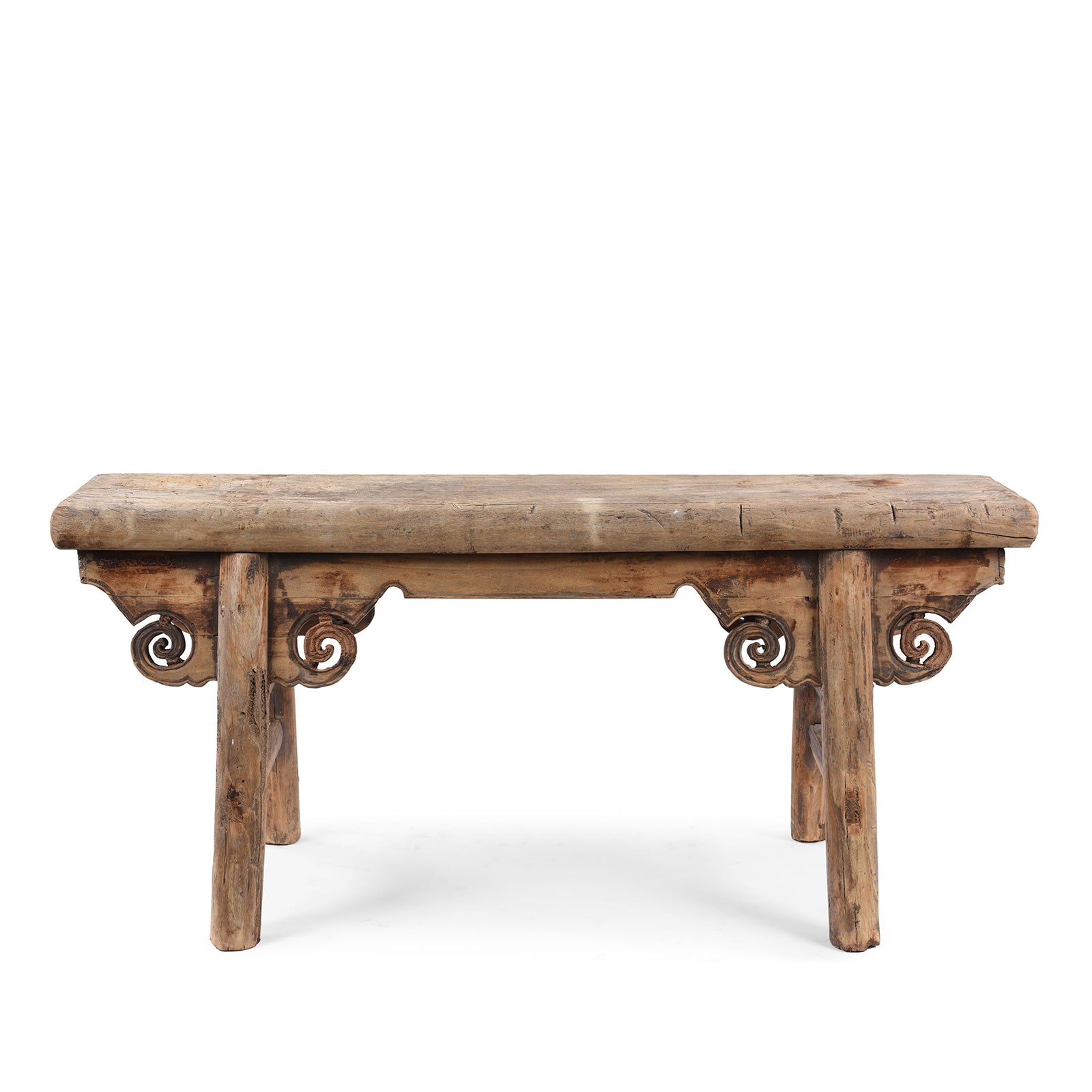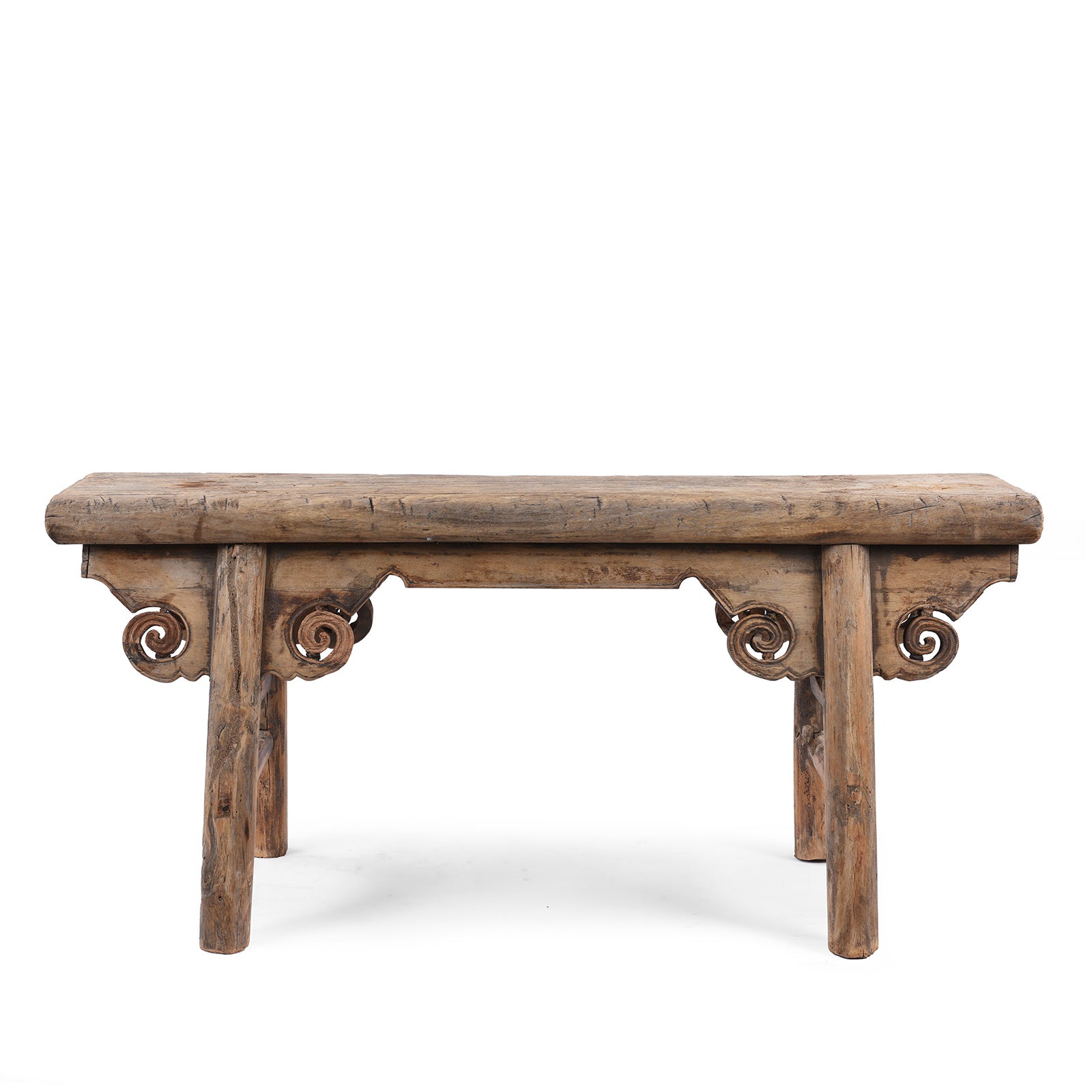 Known as spring benches, these pretty Chinese benches used to be seen outside shops and small restaurants in China and used by both staff and customers to enjoy the fresh air. Constructed from elm, this one is from Shanxi Province. It is carved with a beautiful cloud motif and dates to the 19th century.