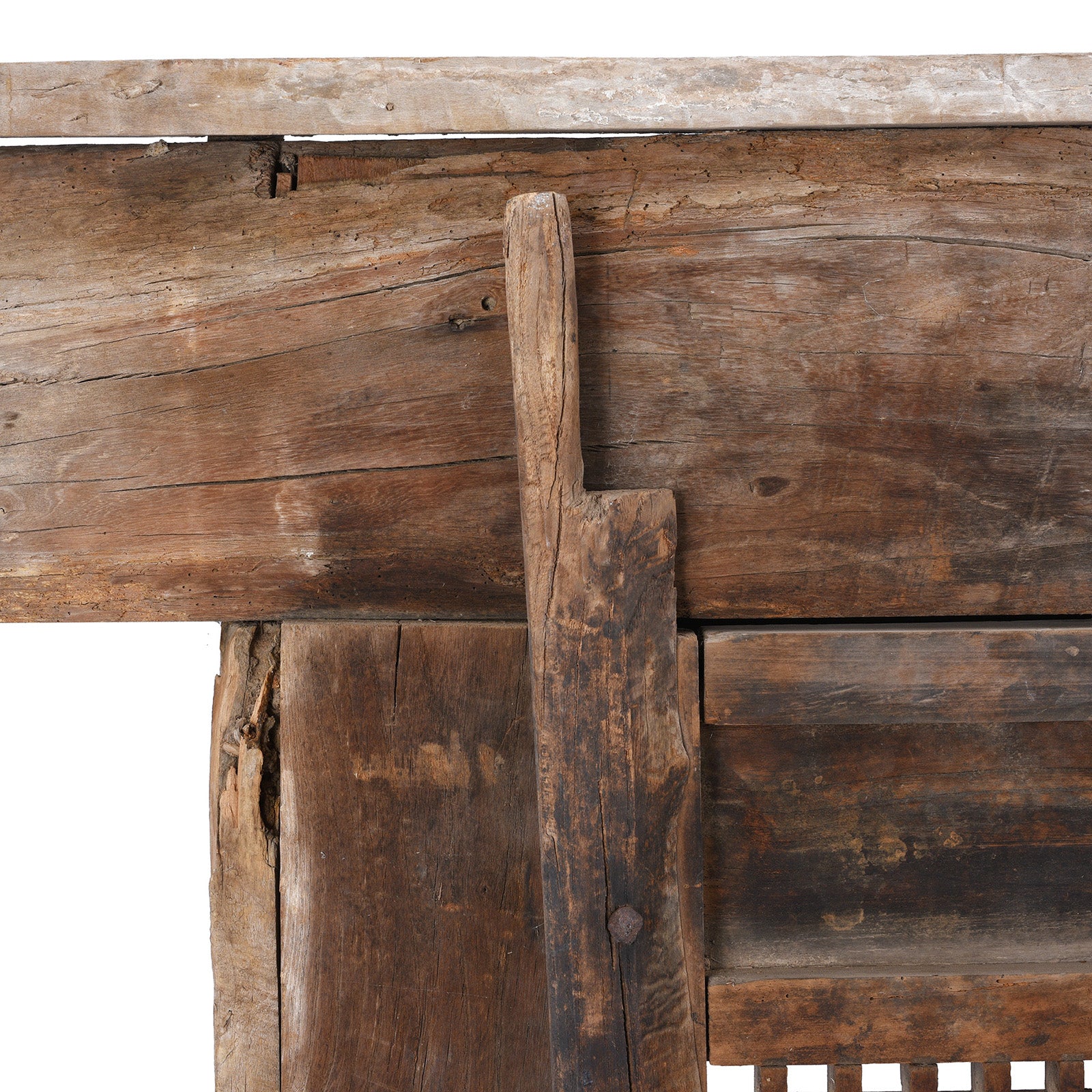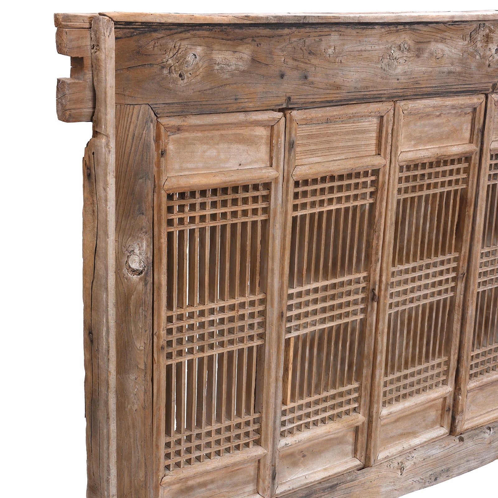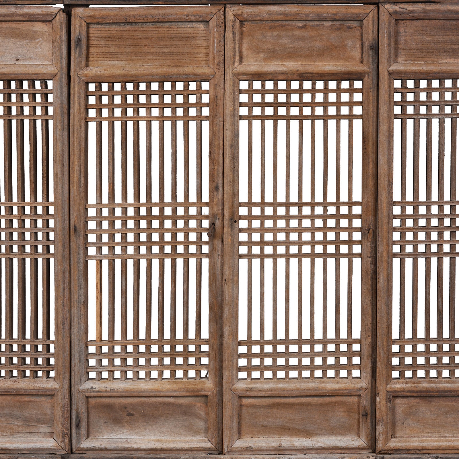 Crafted from yumu 榆木 (northern elm), this 19th-century Chinese window shutter set retains its original architectural frame. The four shutters are arranged side by side, each with a geometric lattice design of vertical and horizontal bars, a pattern typical of late Qing domestic joinery. The surface has developed a muted, weathered patina through long use, highlighting the grain and character of the elm.