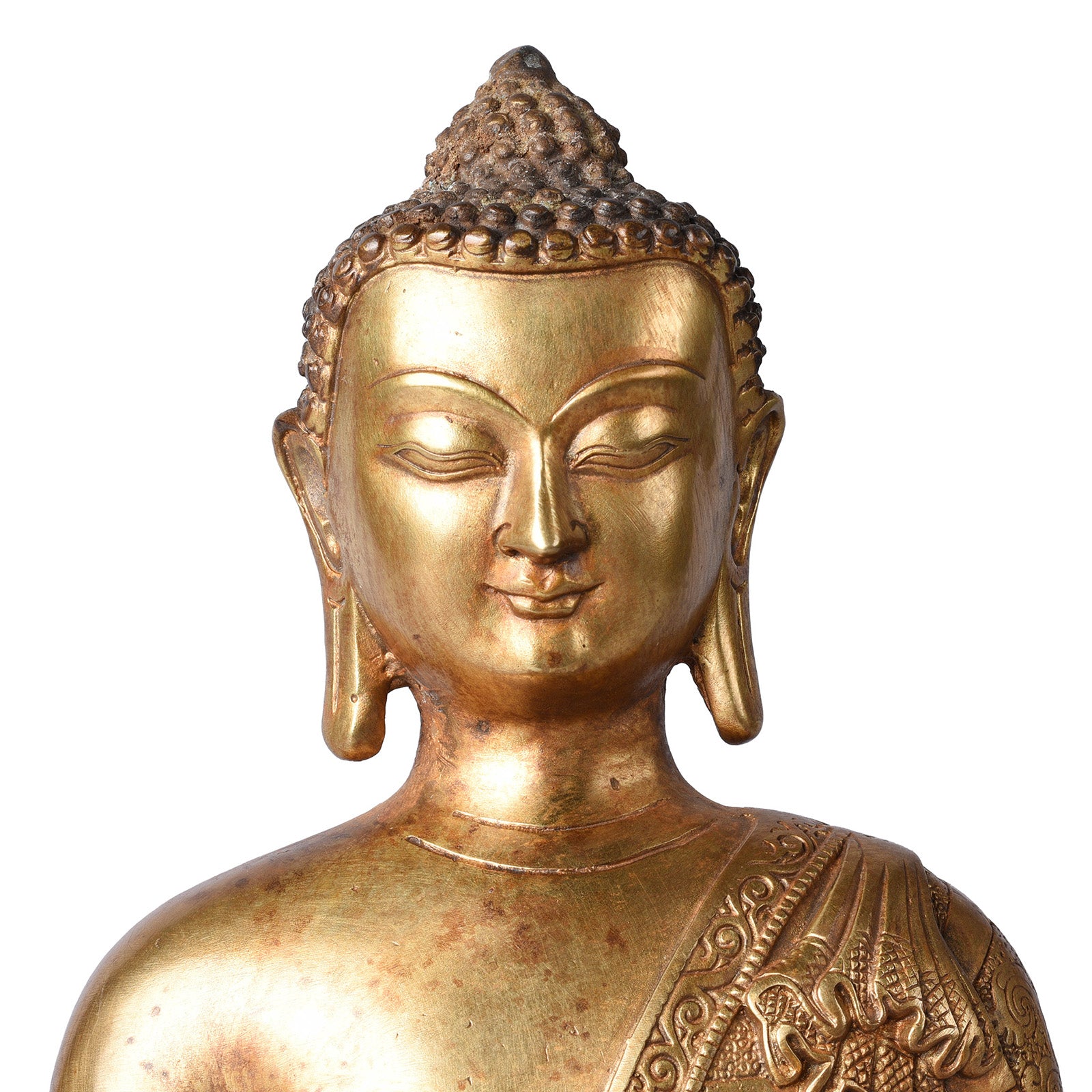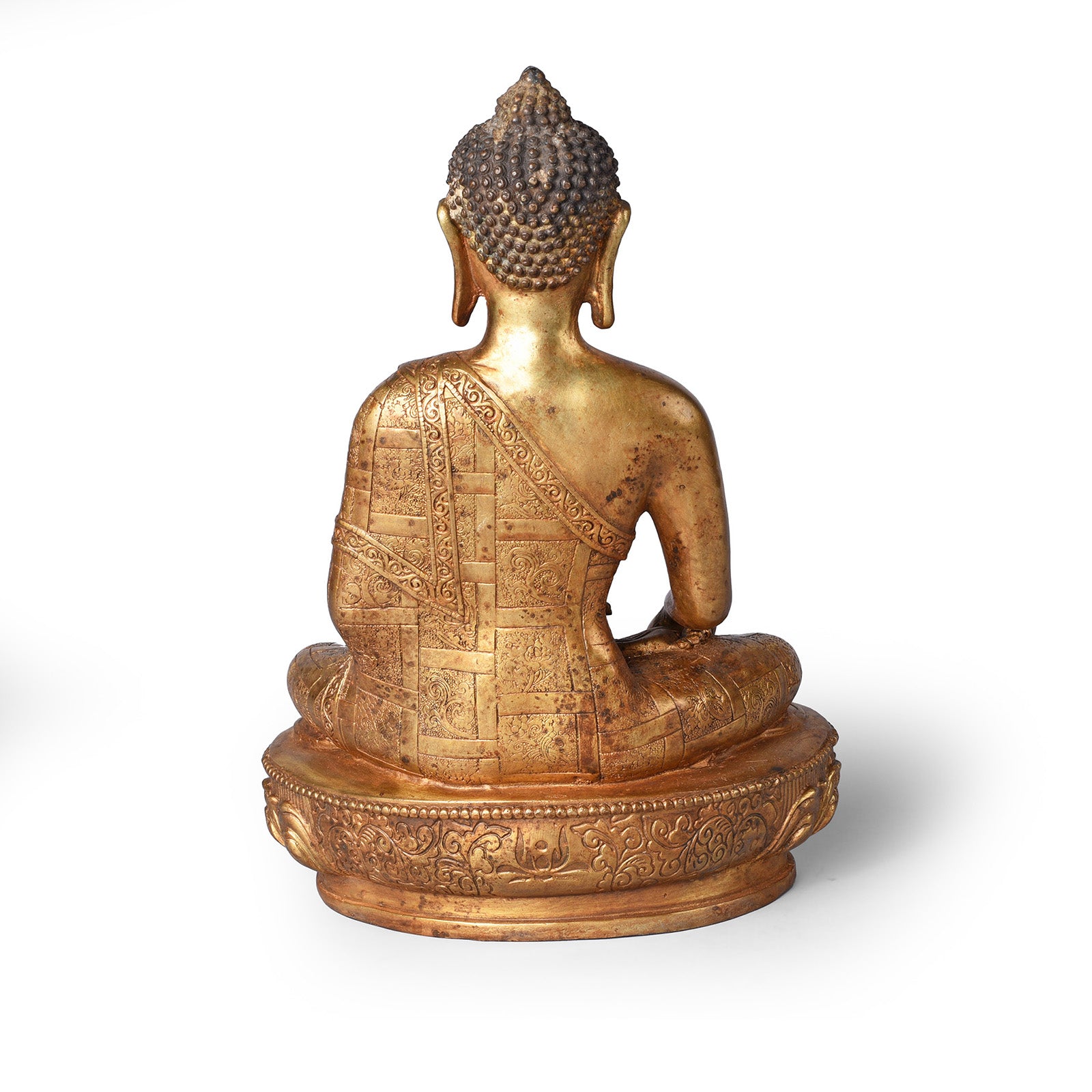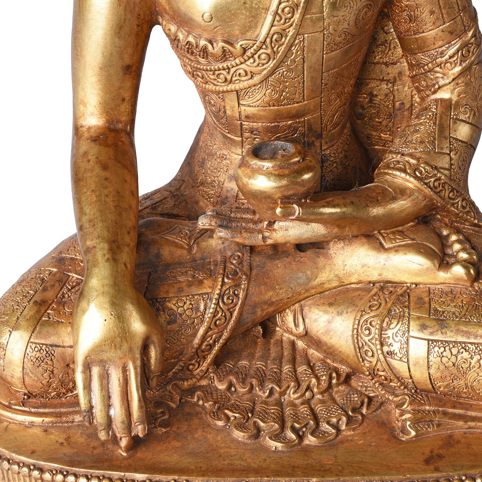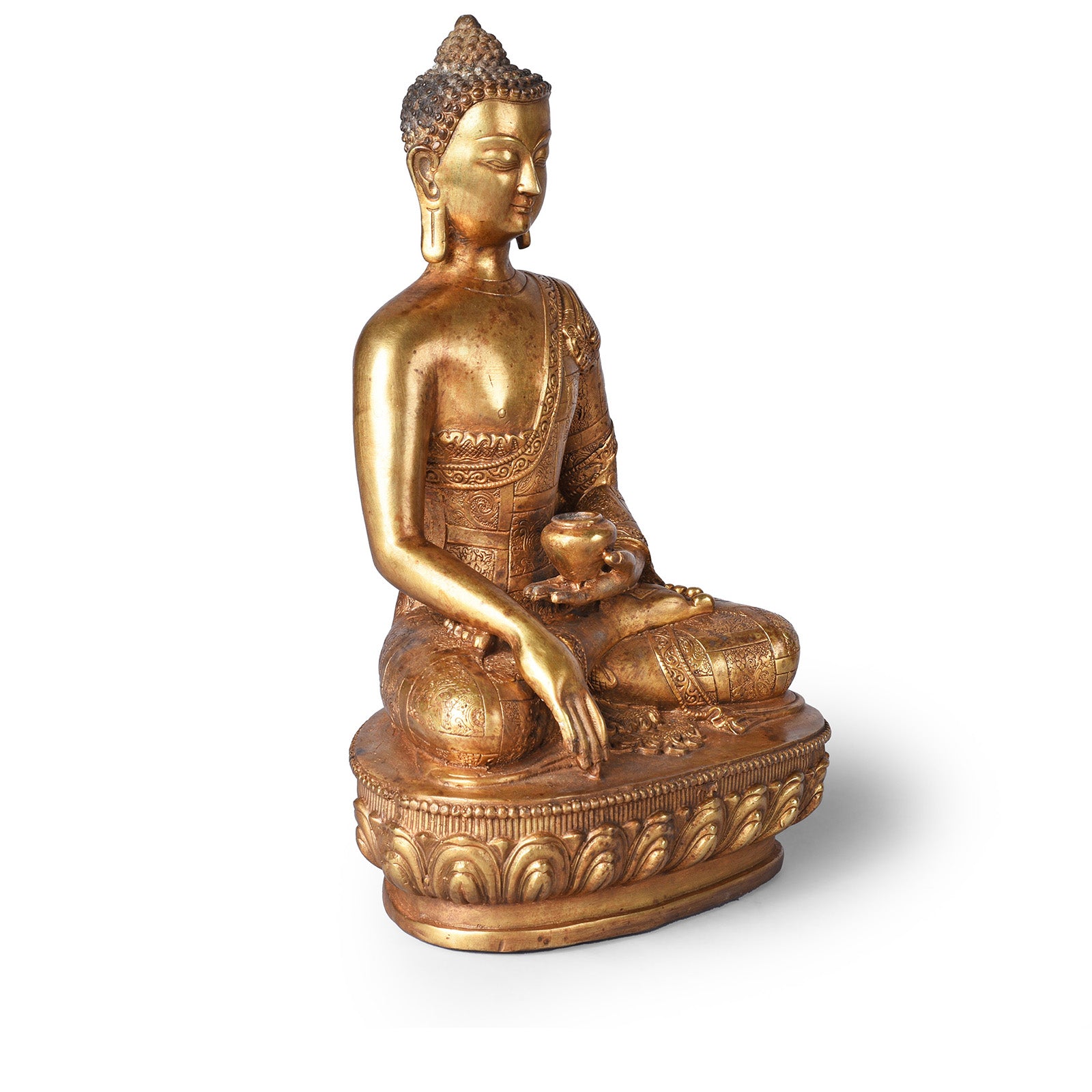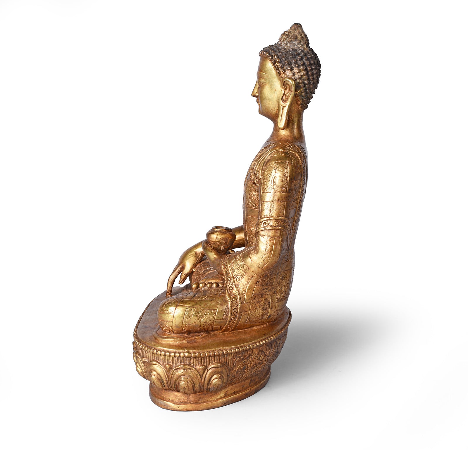 This brass Buddha has a serene gaze and is seated varada mudra, both palms open. Varada mudra is a sign of compassion & charity, representing the five perfections; patience, effort, concentration, generosity & morality. This pose is always from a seated position with the right hand resting on the knee, hand facing outwards. Here Buddha also holds an offering bowl.