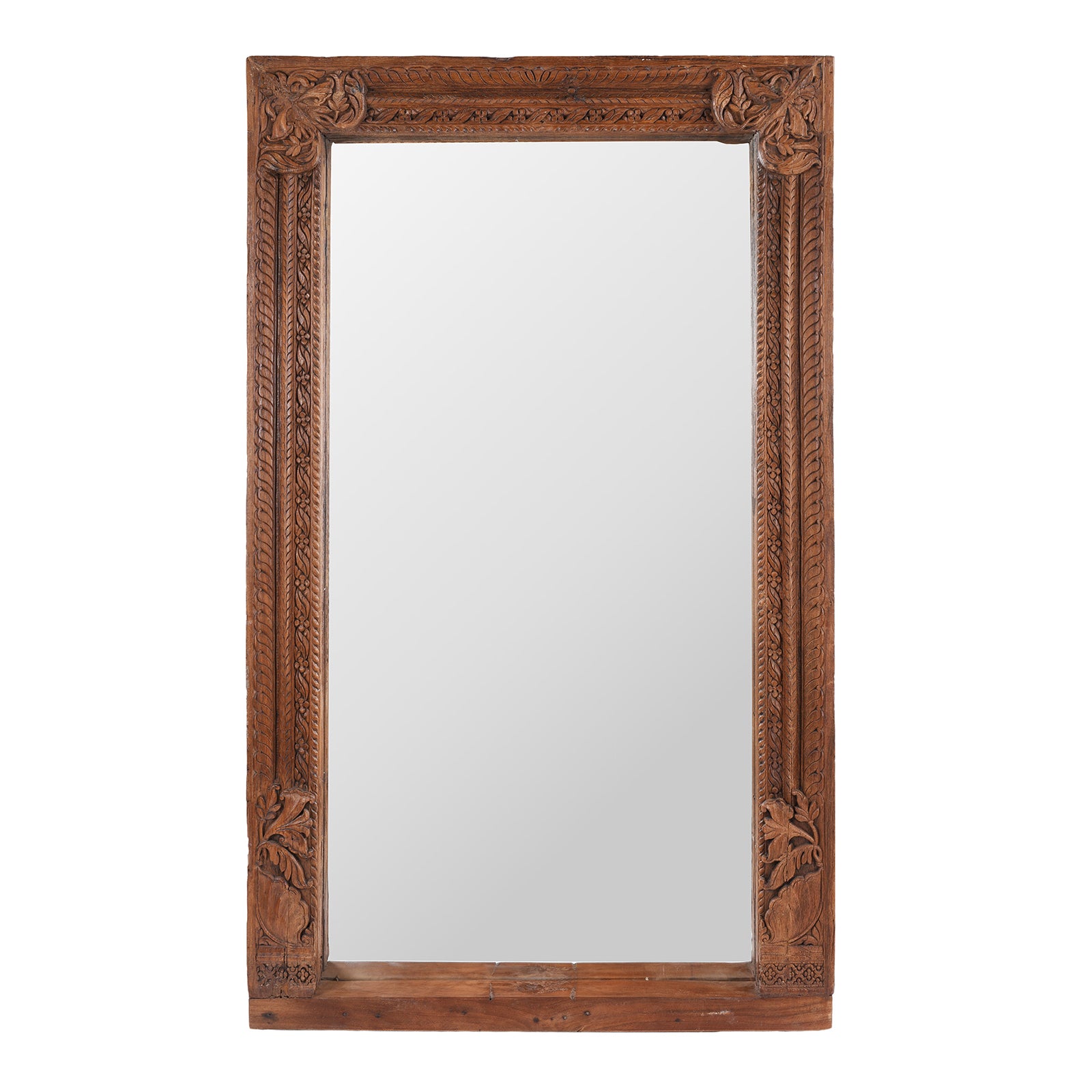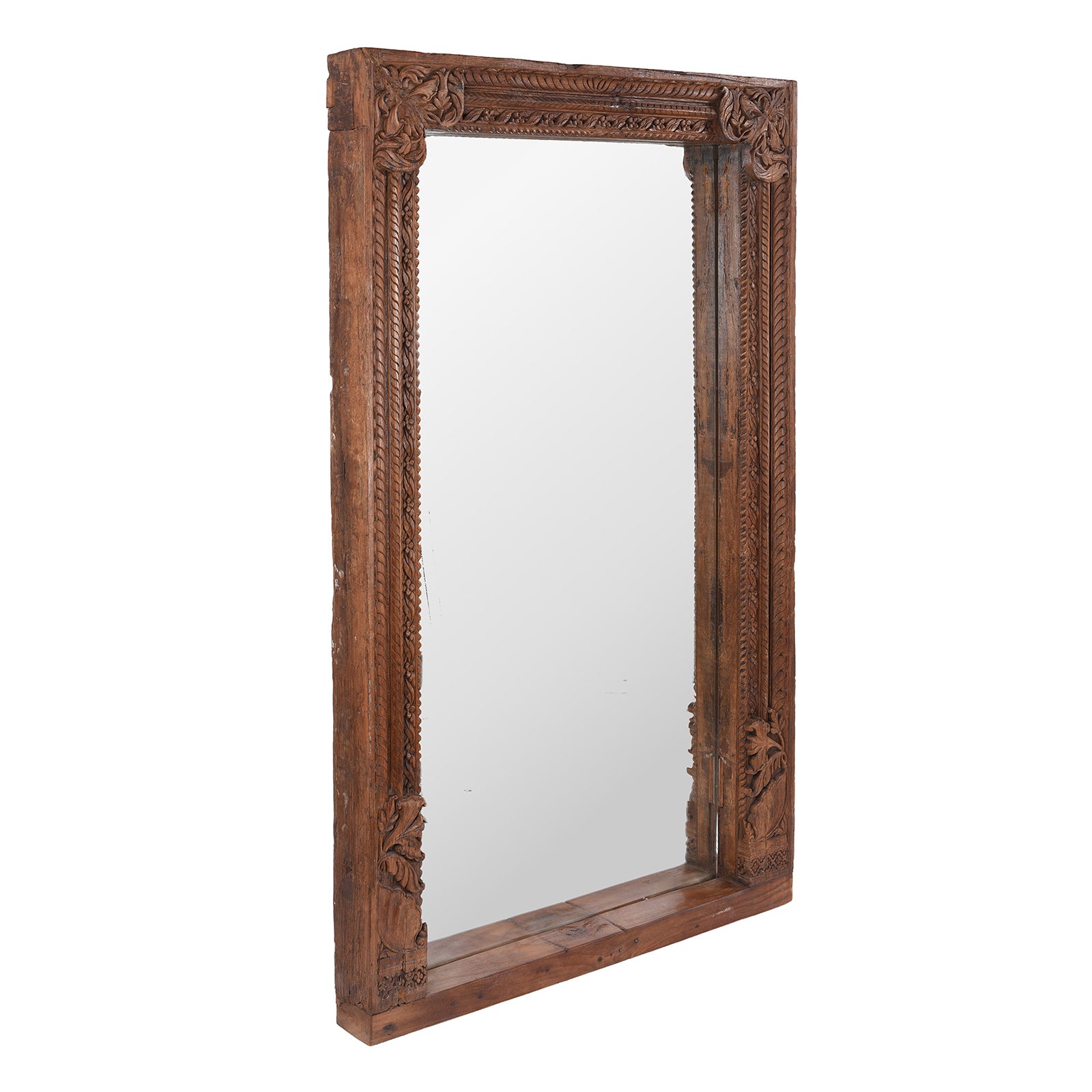 This striking 19th-century carved teak mirror was originally a door frame from Andhra Pradesh, South India, now thoughtfully repurposed as a mirror. The deep, richly aged teak is beautifully hand-carved with botanical and foliate motifs, showcasing the intricate craftsmanship typical of traditional South Indian woodwork. The design features elegant corner flourishes and vertical borders reminiscent of temple architecture, lending the piece a quiet grandeur.