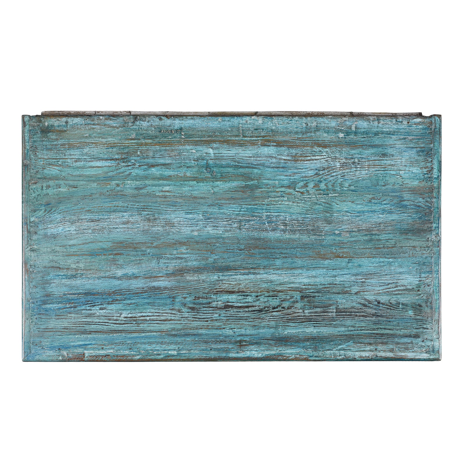 Its compact, upright form includes an internal shelf and twin doors with delicate metal ring handles. The distressed paintwork reveals layers of turquoise, white, and hints of wood beneath€”bringing warmth and character to any interior, especially in kitchens, bathrooms, or living rooms where texture and colour are welcome.