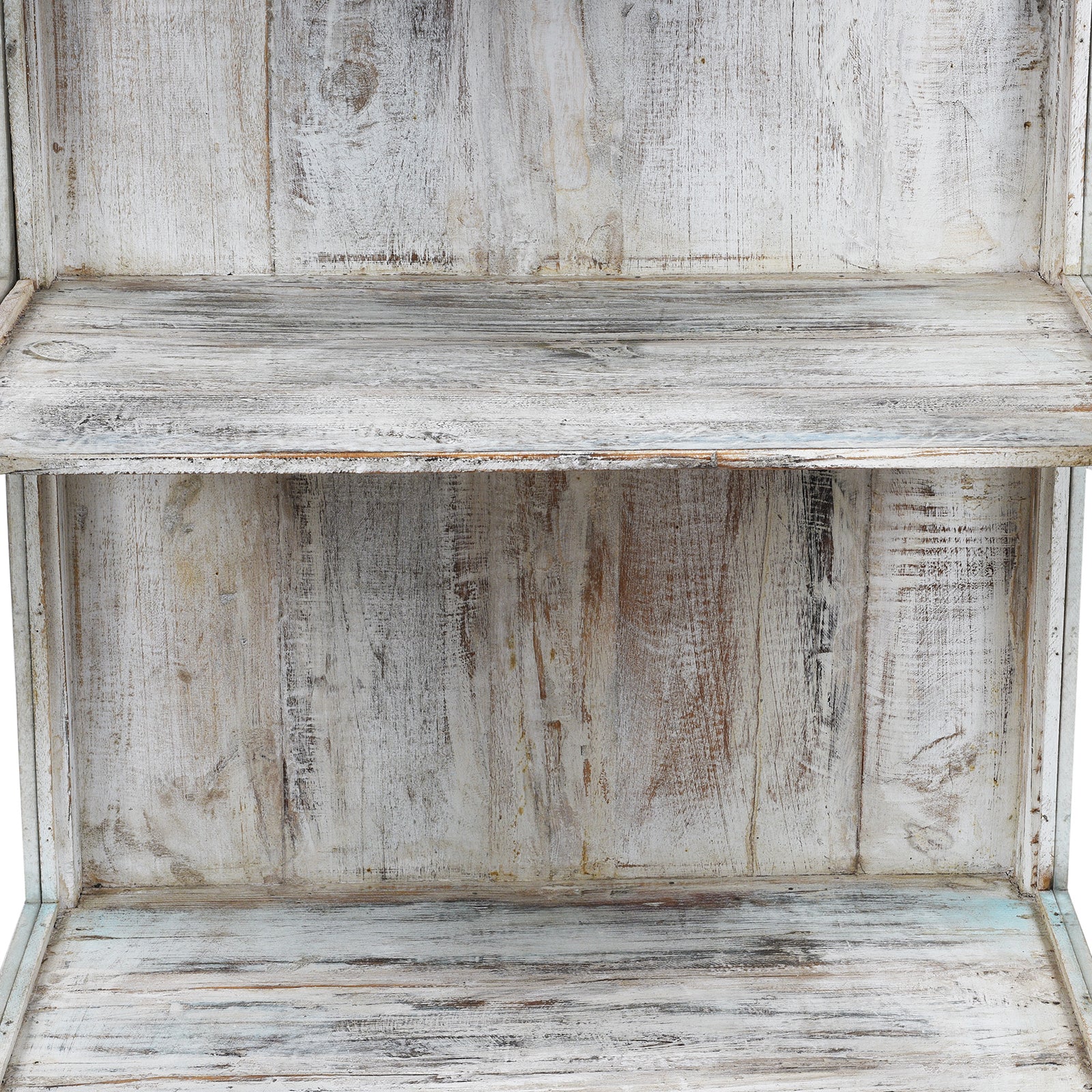 Interior Detail From Elegant Glazed Display Cabinet From 19th Century Gujarat With Distressed Blue Exterior And White Interior, Featuring Shelf For Generous Storage