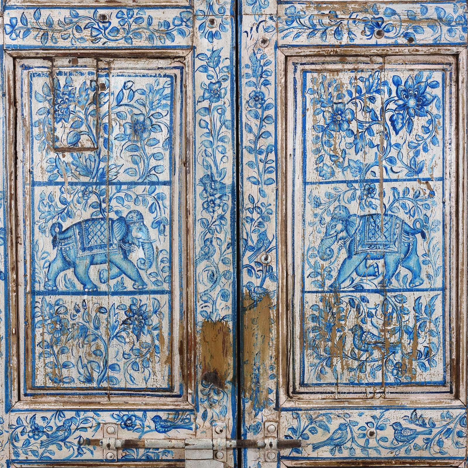 These beautifully painted Indian doors with frame are from Gujarat and date to the 19th century. The painting is modern and is inspired by blue and white porcelain found on Chinese vases and is decorated with elephants, horses amongst floral designs.