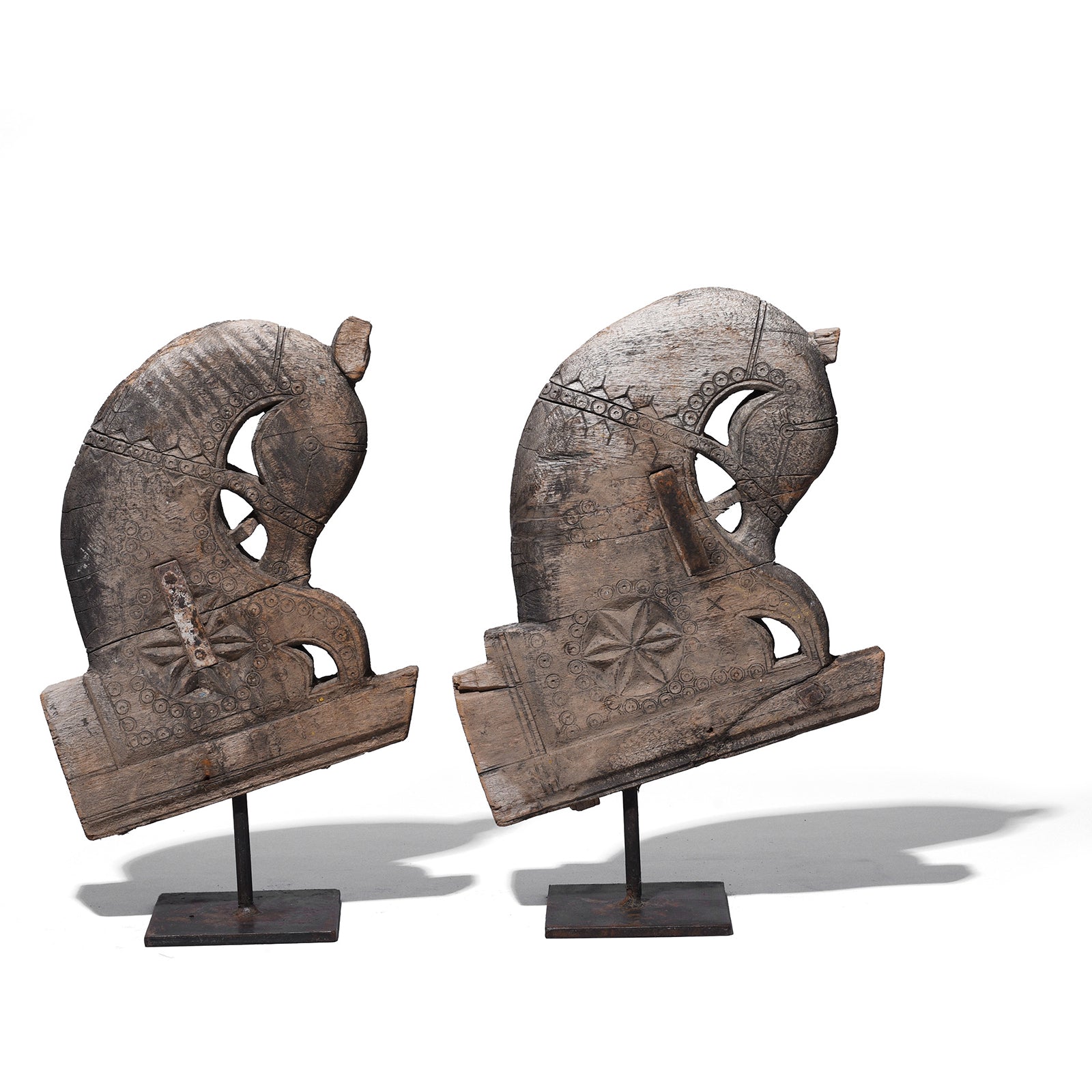 This carved teak horse-head corbel from 19th century Saurashtra began as a kāṇ bracket in a Kanbi household, where horse motifs were associated with protection and auspicious energy. The arcing profile, forward-leaning head and incised detail show the lively folk carving typical of rural workshops.