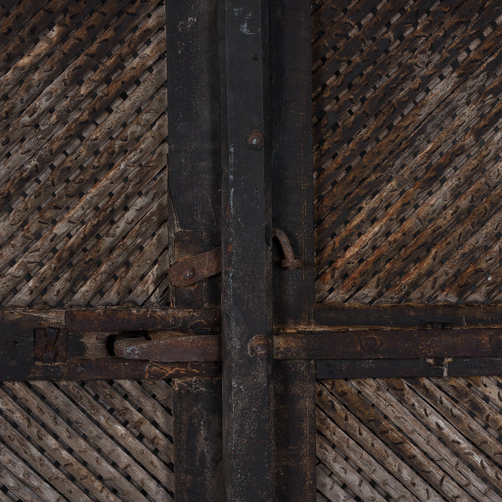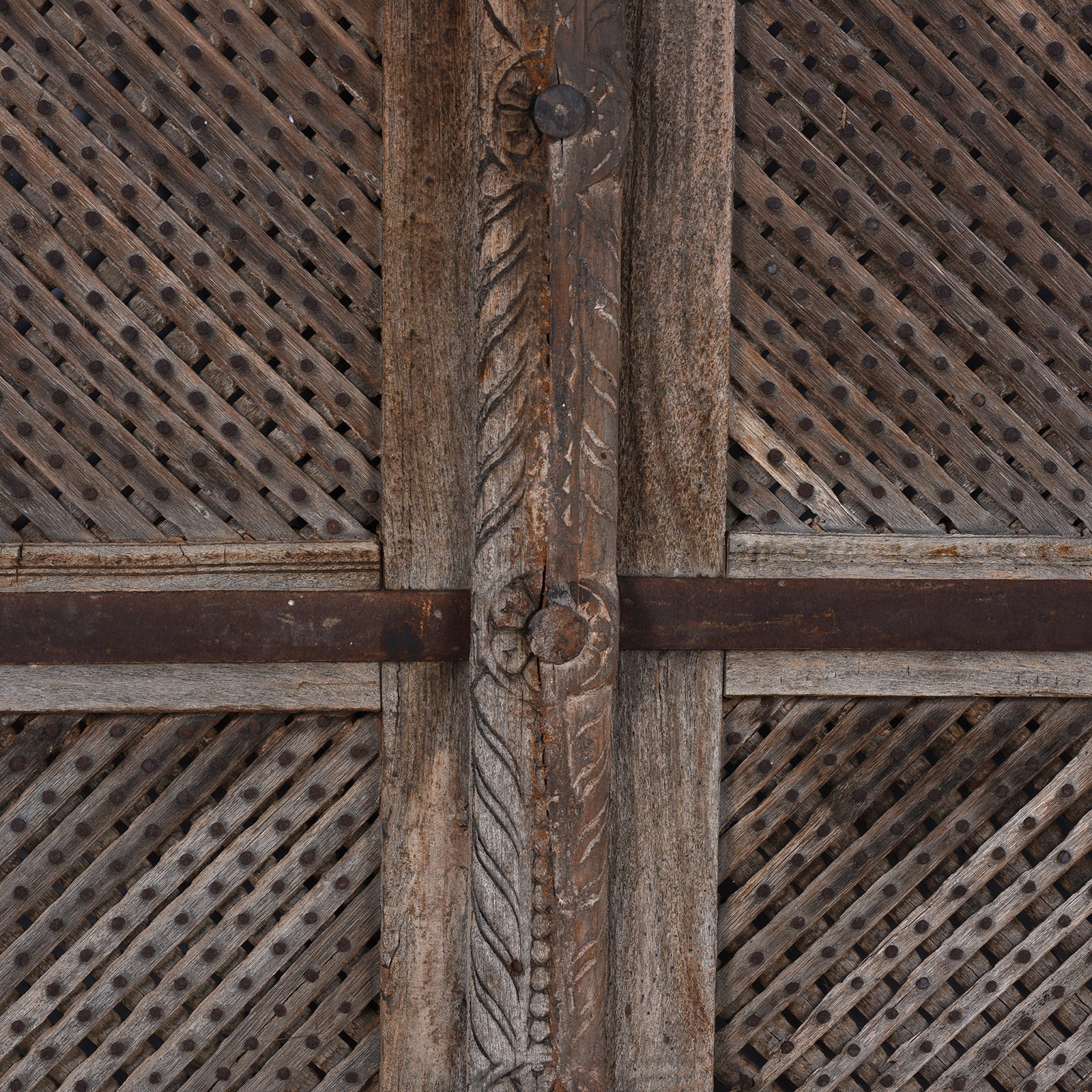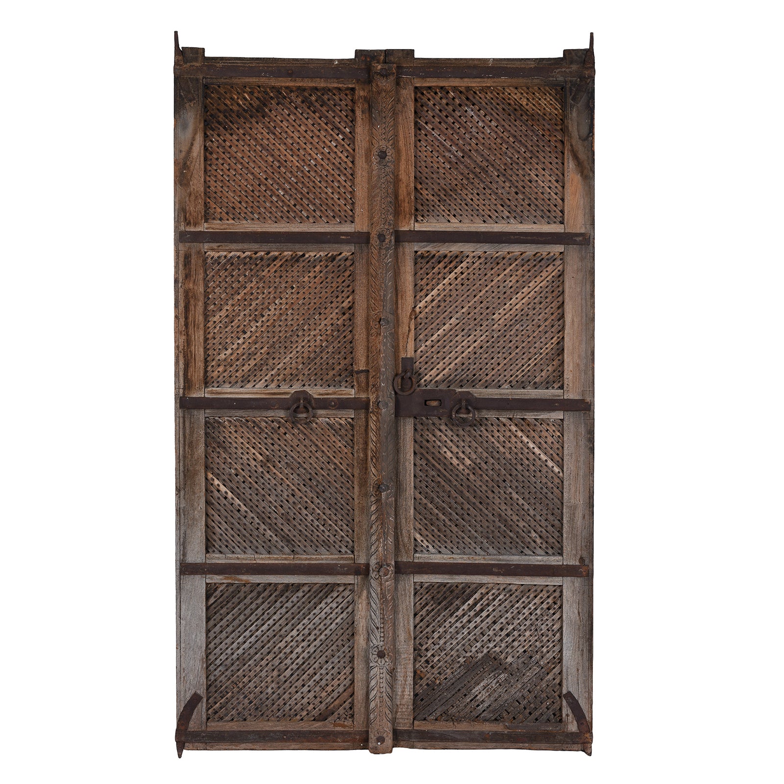 These magnificent 19th-century teak doors hail from Bikaner, Rajasthan — a city renowned for its grand havelis and intricate woodwork traditions. Each panel is crafted from solid teak and adorned with fine hand-carved geometric jali (lattice) patterns that filter light beautifully while maintaining privacy. The time-worn patina tells a story of centuries past, showcasing weathered tones and subtle iron details from the original locking mechanisms and braces.