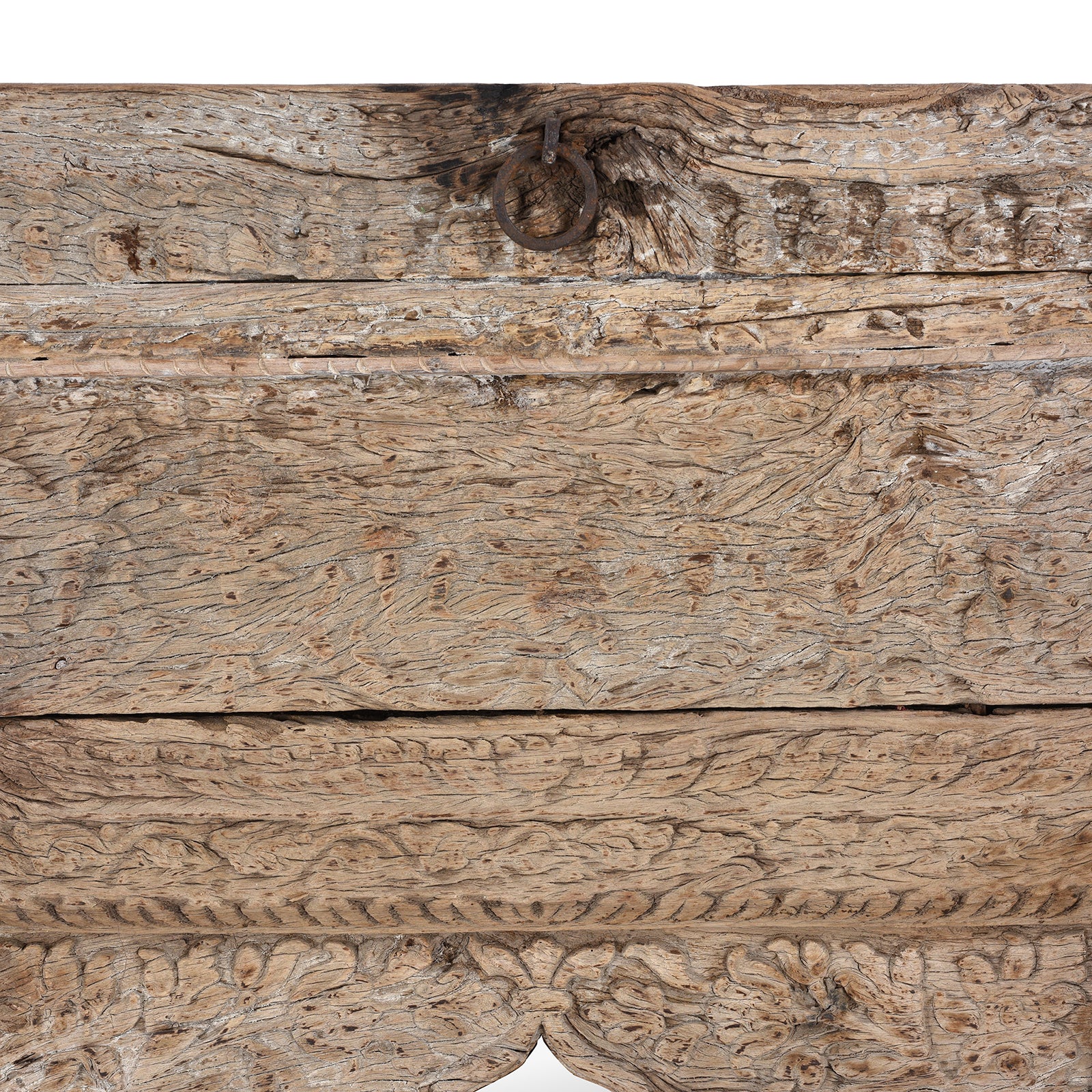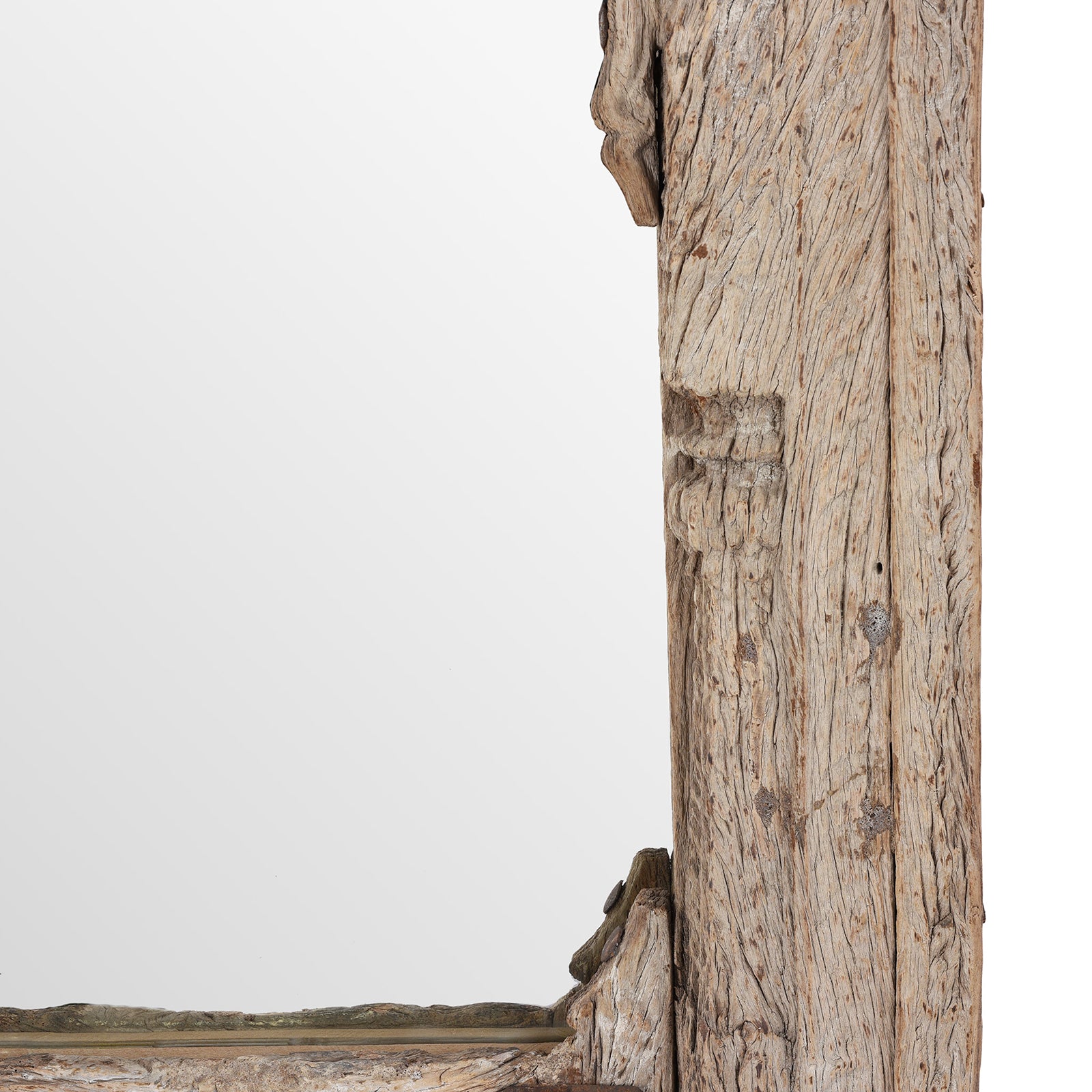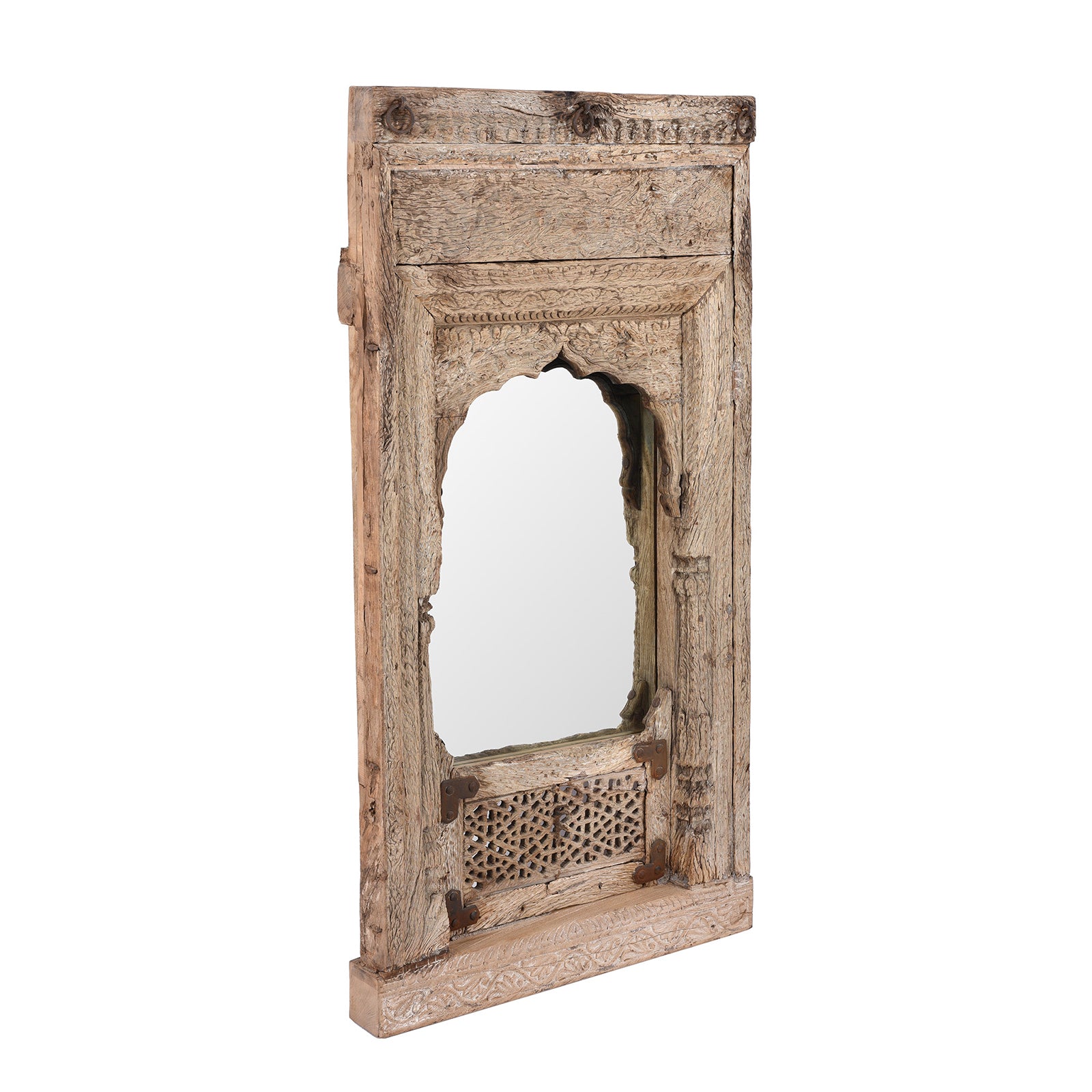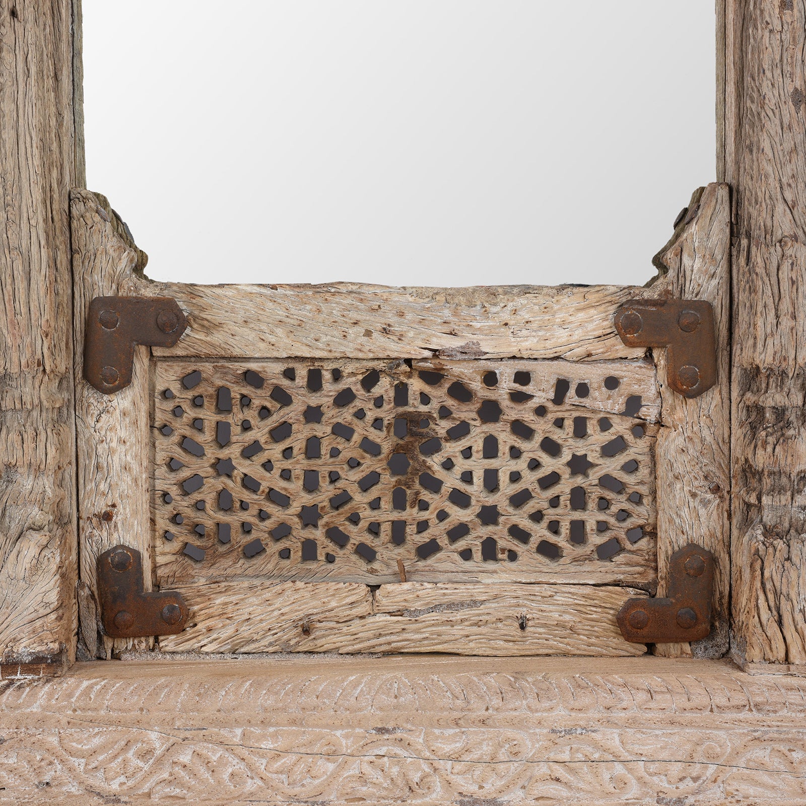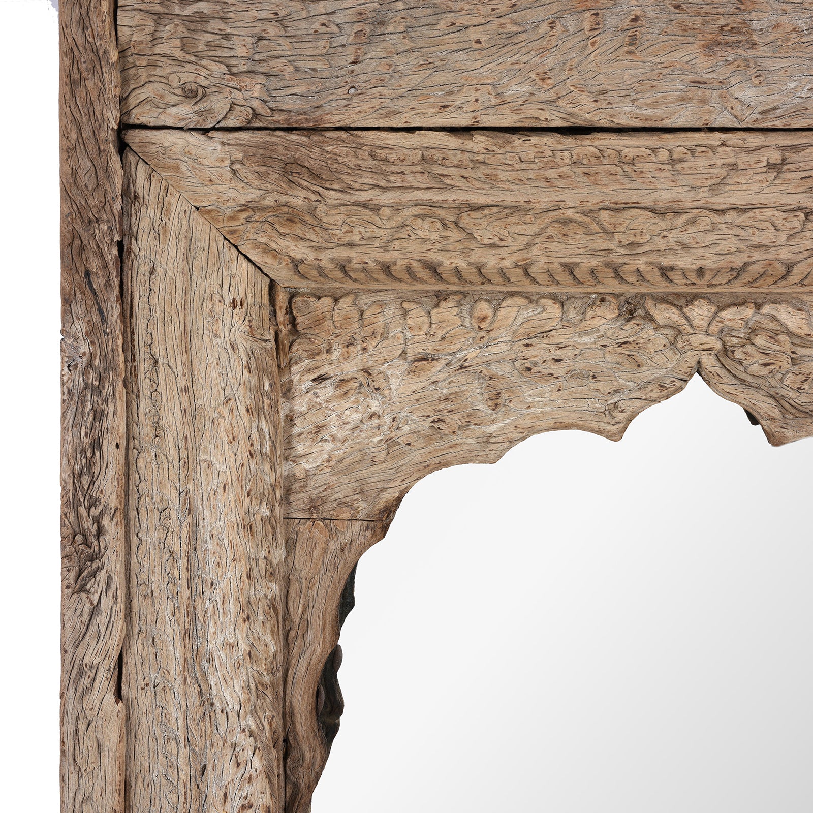This exquisite Indian mirror has been created from an old sun-bleached window from Punjab. The quality of carving on this particular mirror is of exceptional quality. In order for rosewood to bleach like this, it takes considerable time, making this window 18th century or earlier. It has been ornately carved in the traditional Mughal style and has aged beautifully. The mihrab arch is carved with delicate flowering peonies and the top panel features an interlaced stylised lotus design. The balcony is carved with a refined jali design allowing the mirror to glisten through the design.