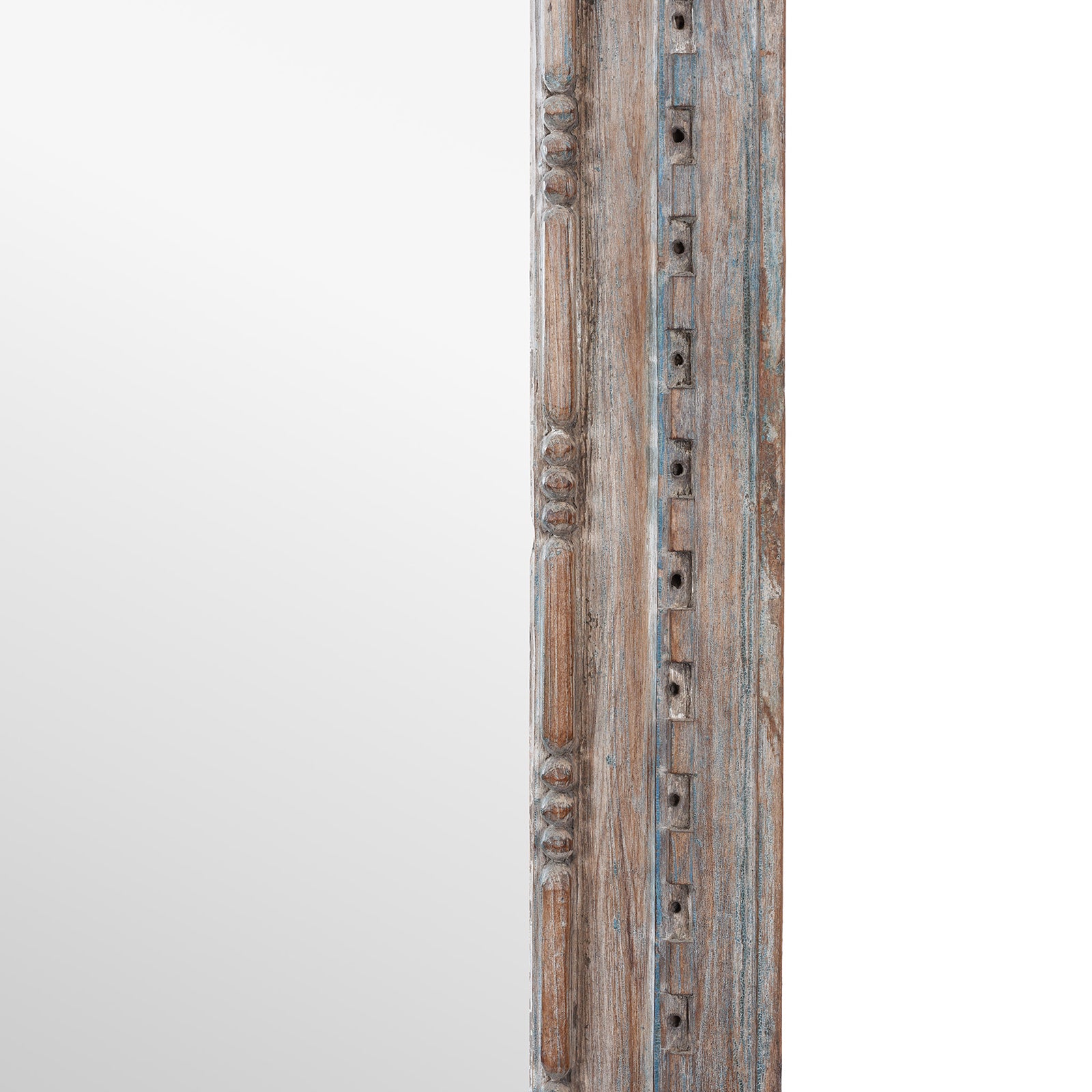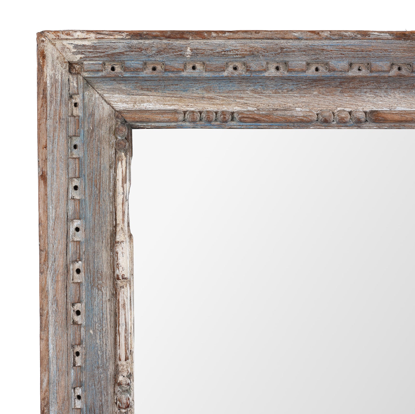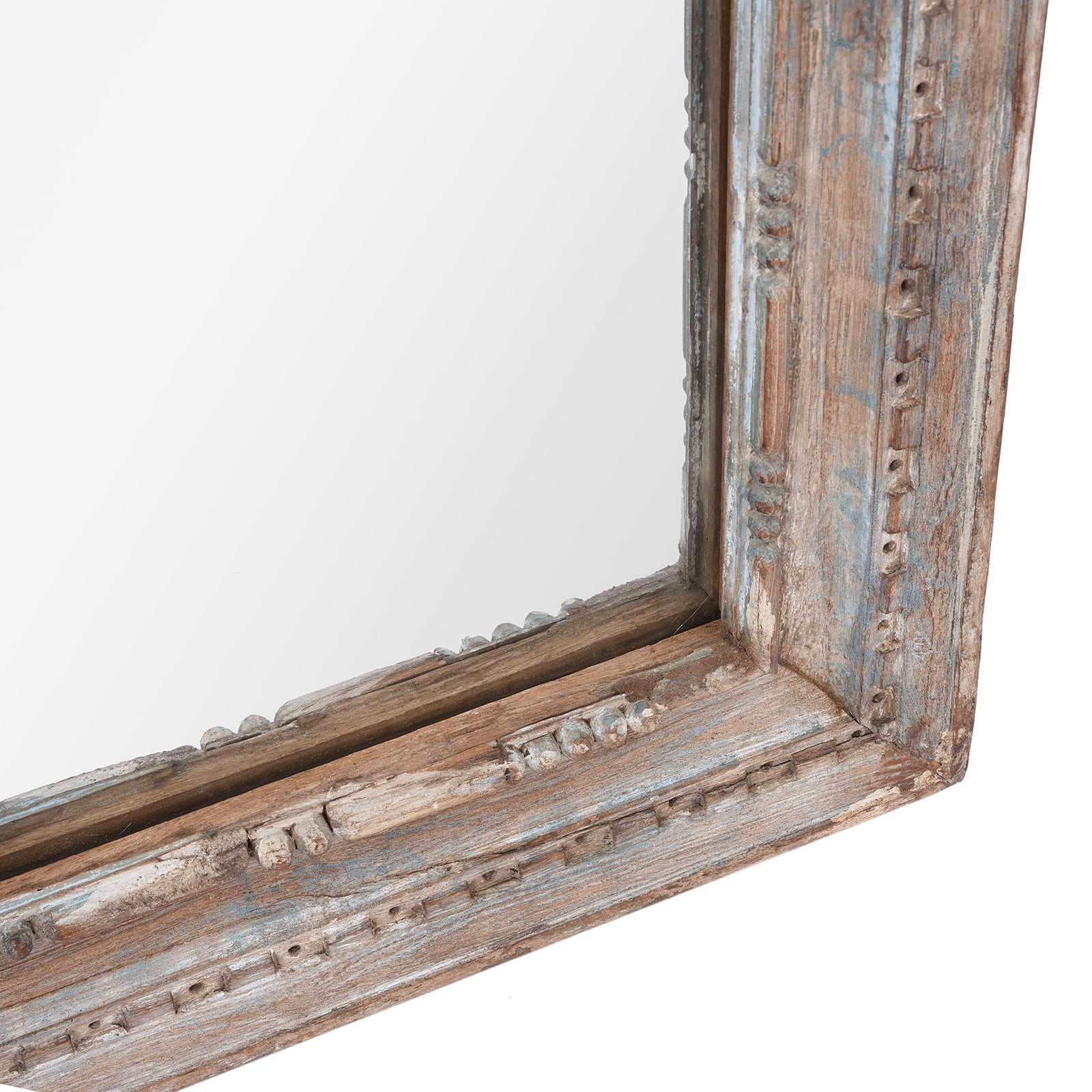 This unique mirror is made from teak wood salvaged from an old Indian 19th-century building in Gujarat that has fallen into disrepair. It still has patches of old blue paint clinging to the simple repeating carved pattern.
