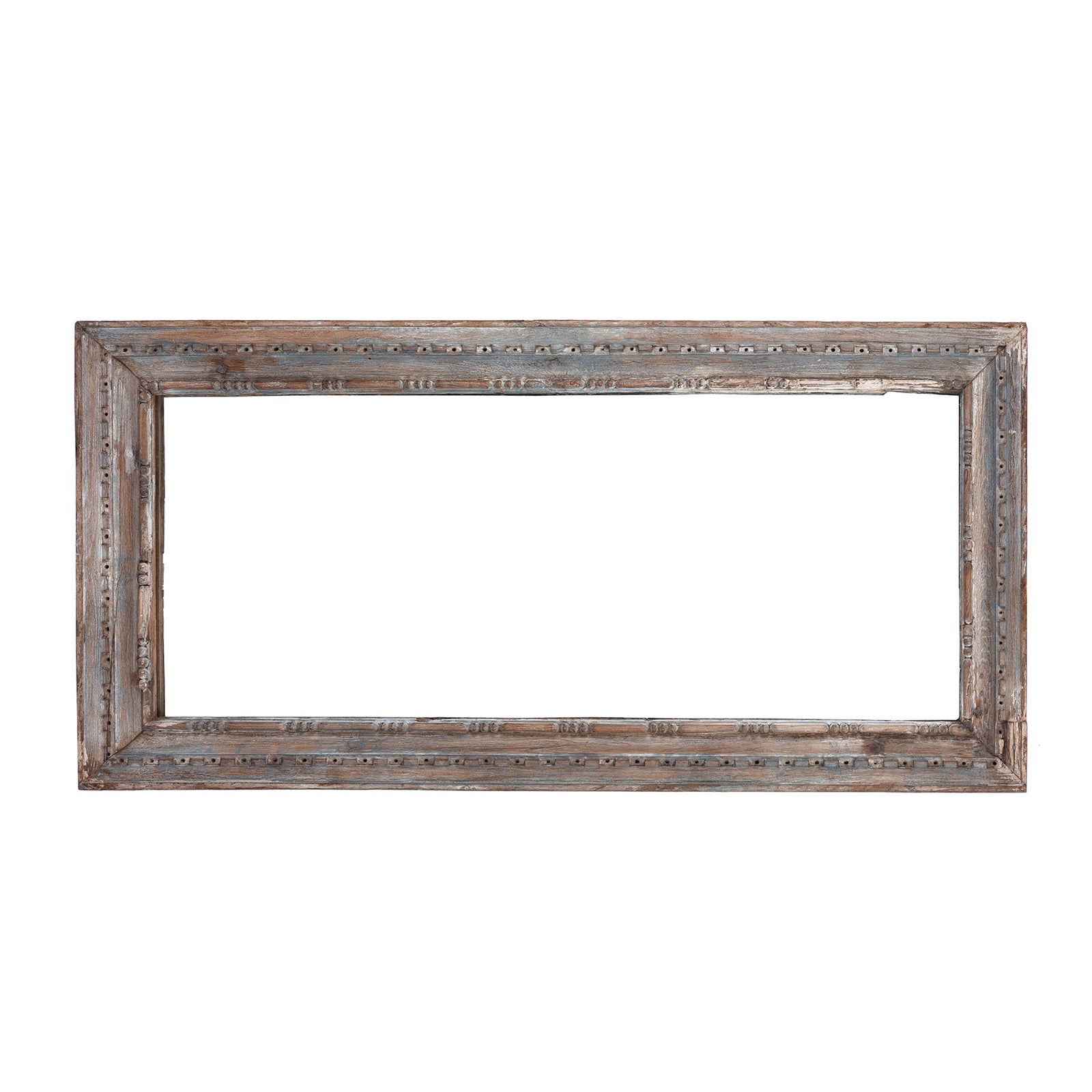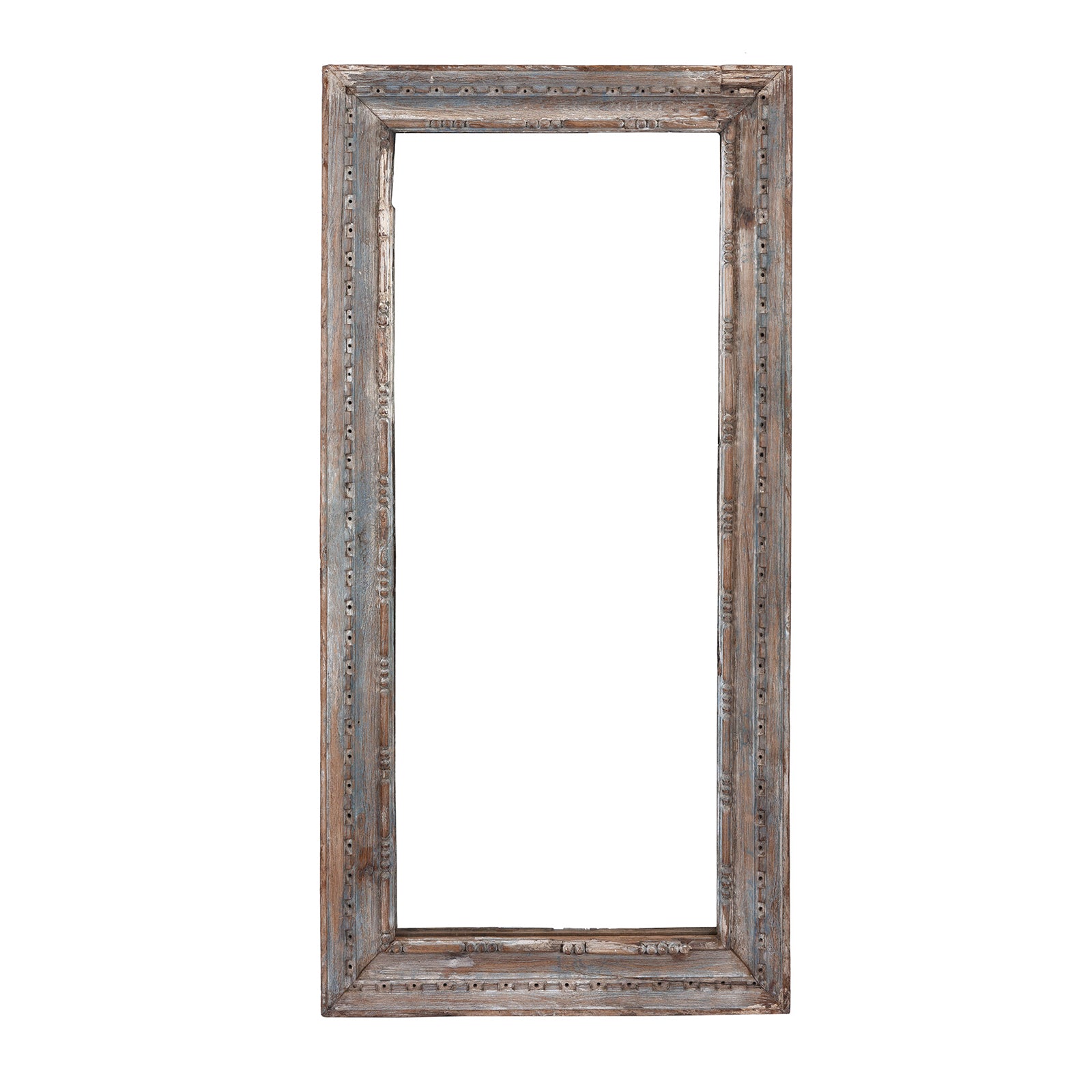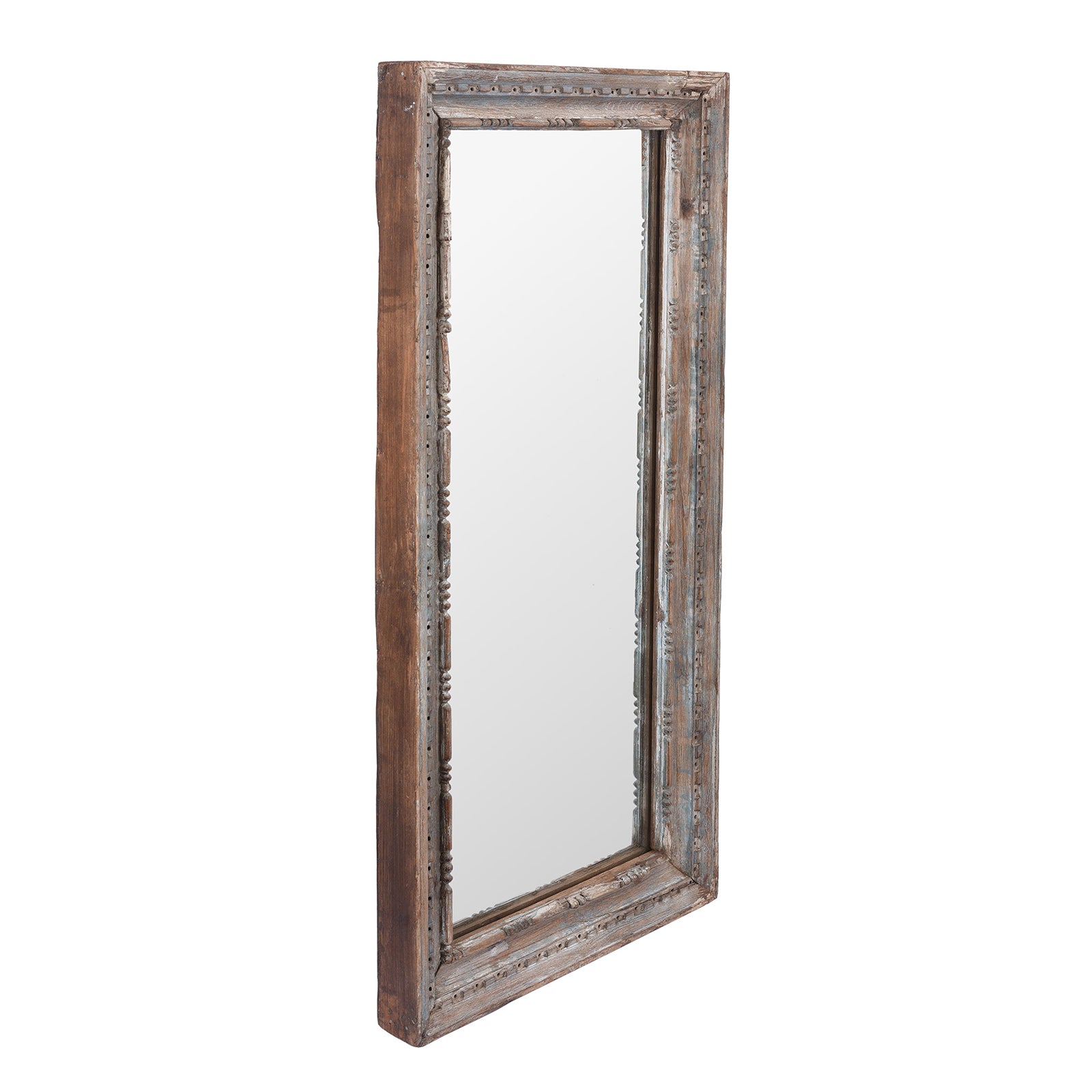 This unique mirror is made from teak wood salvaged from an old Indian 19th-century building in Gujarat that has fallen into disrepair. It still has patches of old blue paint clinging to the simple repeating carved pattern.