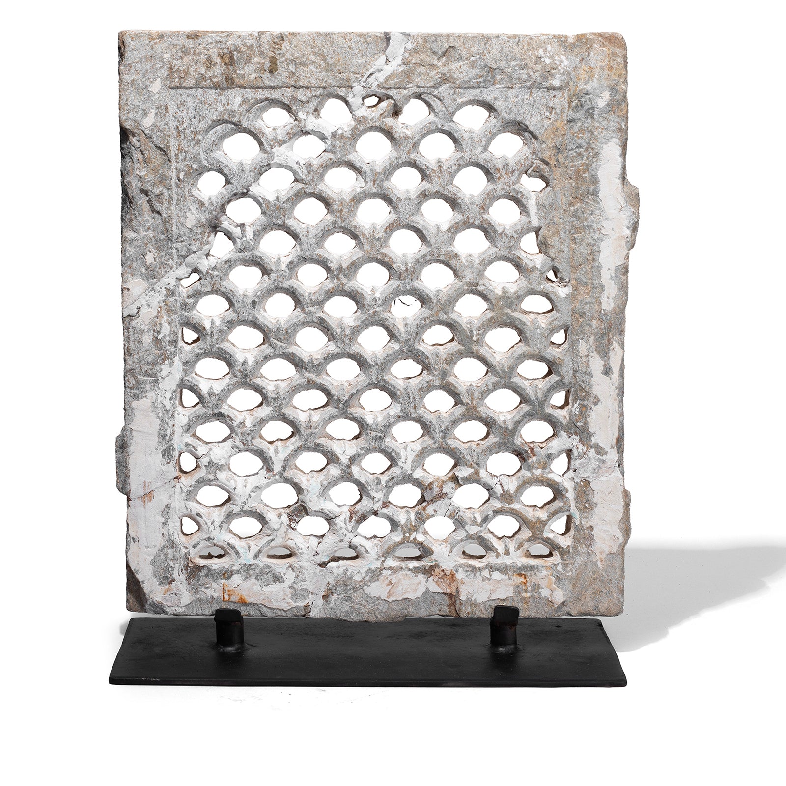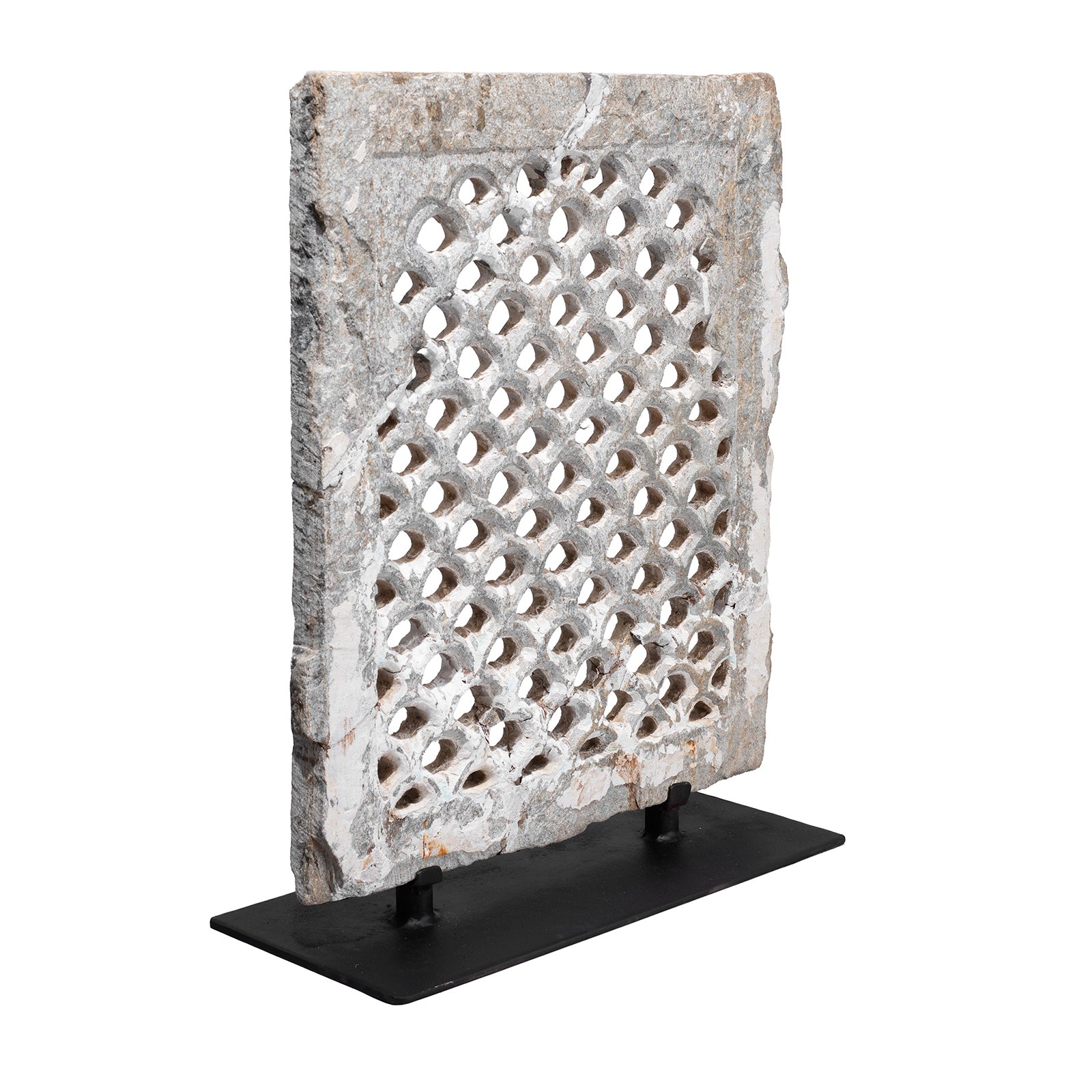 This intricately carved stone jali panel originates from Dungarpur in Rajasthan and dates to the 19th century. Jali panels are a hallmark of Indo-Islamic architecture, known for their delicately pierced stonework that filters light and air while creating beautiful geometric patterns. This example, carved from pale stone, features a repeating lattice motif and has been carefully mounted on a custom iron stand for display.