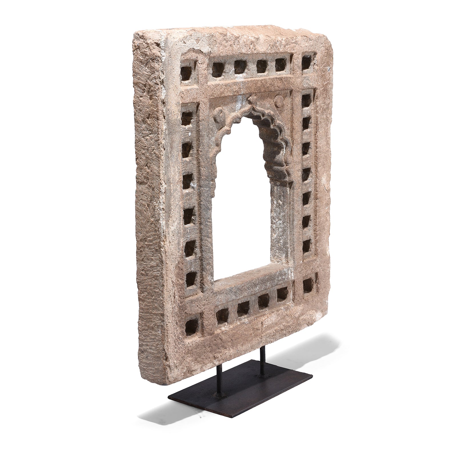 This antique stone window panel hails from Dungarpur in southern Rajasthan, a region celebrated for its ornate palace architecture and finely carved sandstone work. Similar window panels can still be found in the Juna Mahal, the 13th-century hilltop palace of Dungarpur, famed for its richly embellished interiors and distinctive Rajput-Mughal fusion style.
