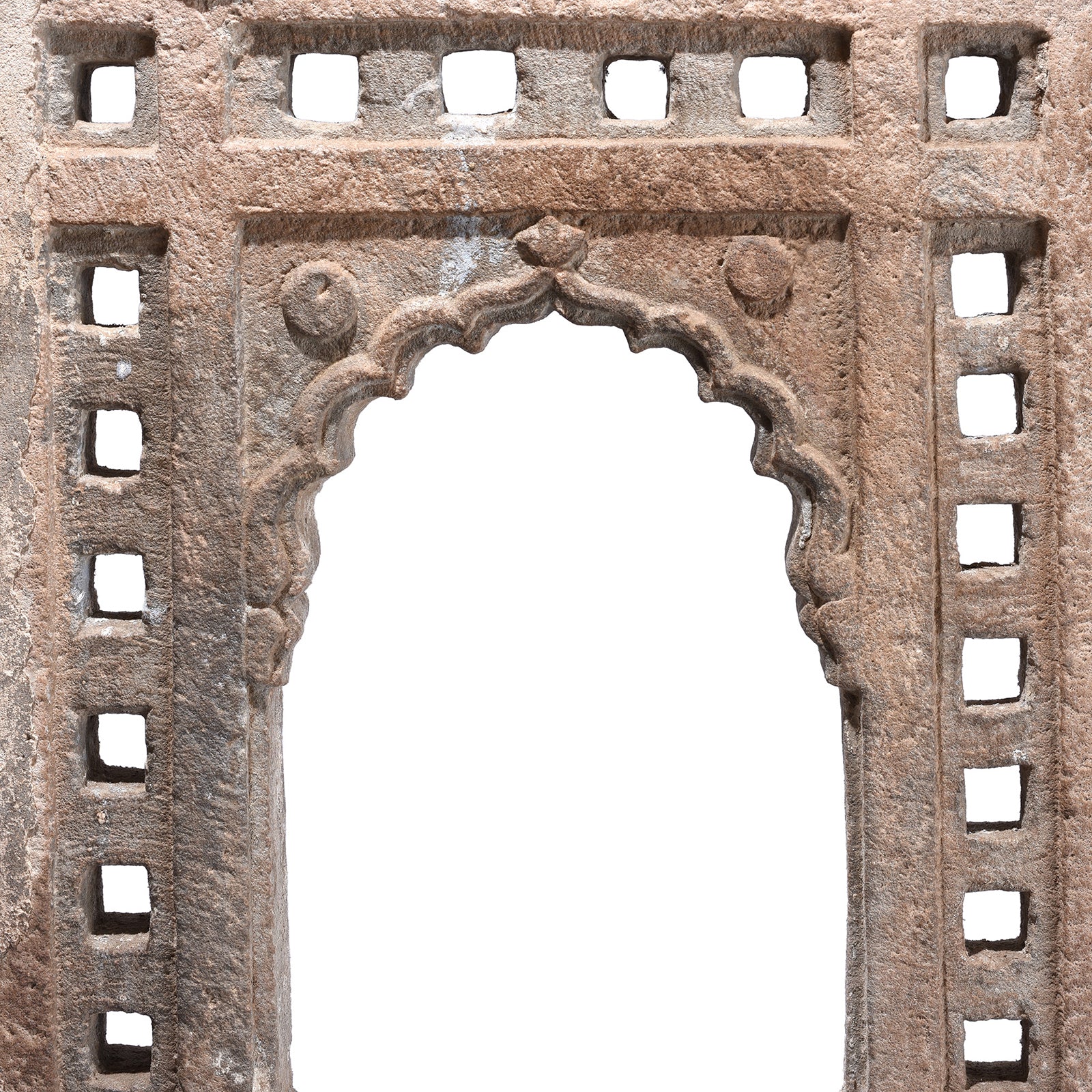 Carved from local sandstone, the panel features a cusped arch framed by a pierced lattice of square openings - both decorative and functional, designed to filter light and air while preserving privacy. The natural weathering of the stone and the softness of its chisel marks add depth and texture, revealing centuries of exposure and use.