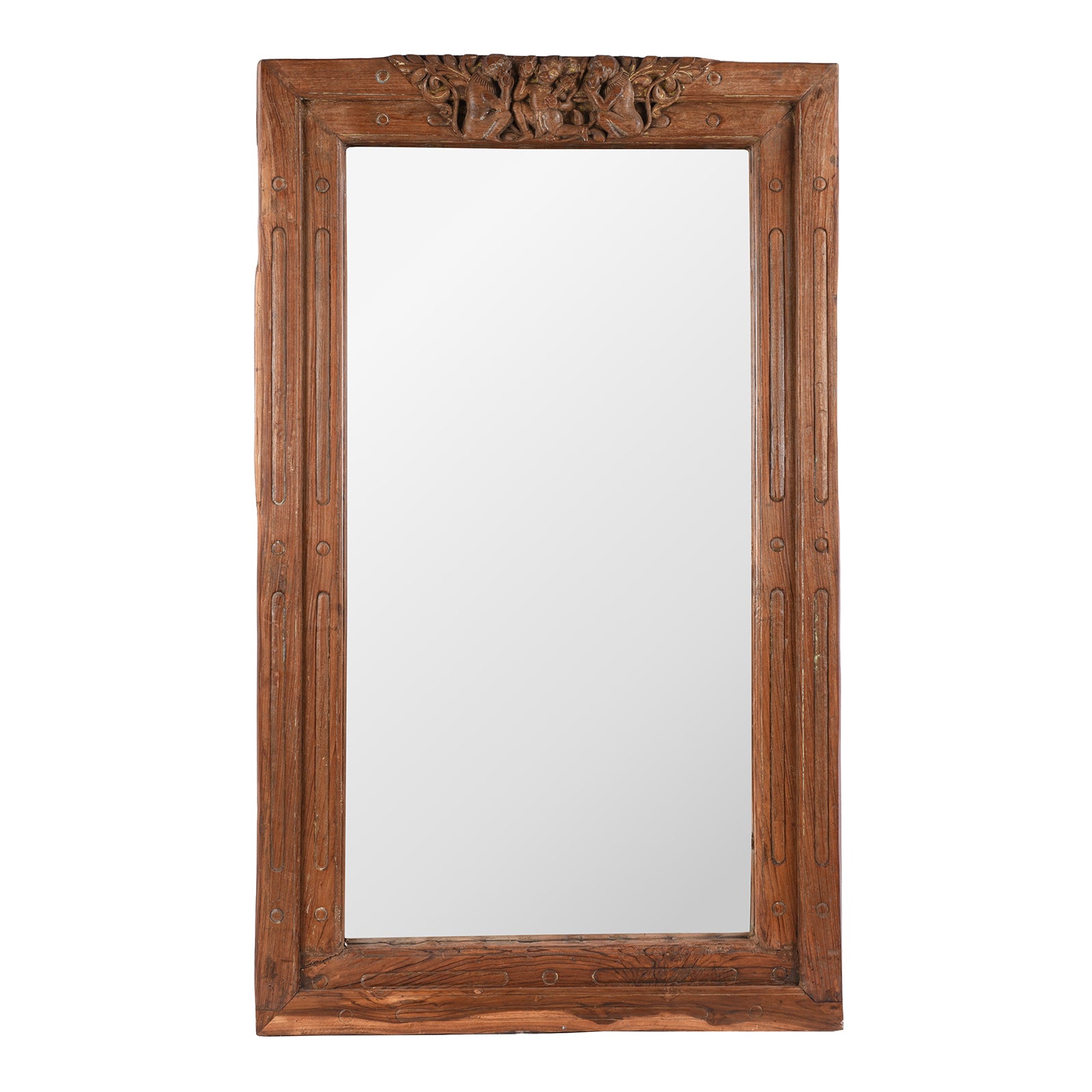 The surrounding frame features subtle linear carvings and roundel motifs on rich and solid teak wood.  Its generous scale and serene patina make it a beautiful feature mirror for hallways, bedrooms, or statement walls. This piece comes with sturdy hangers attached.