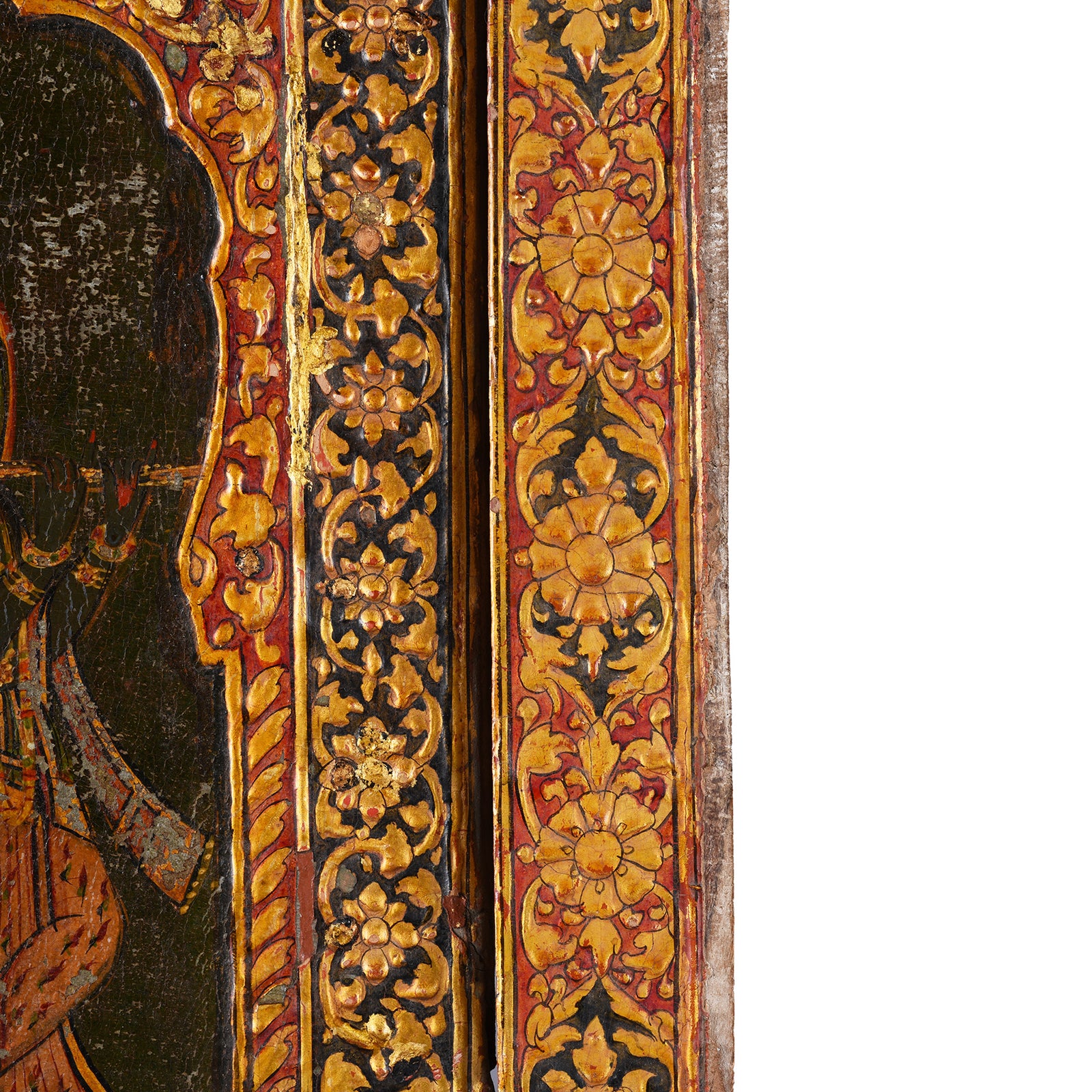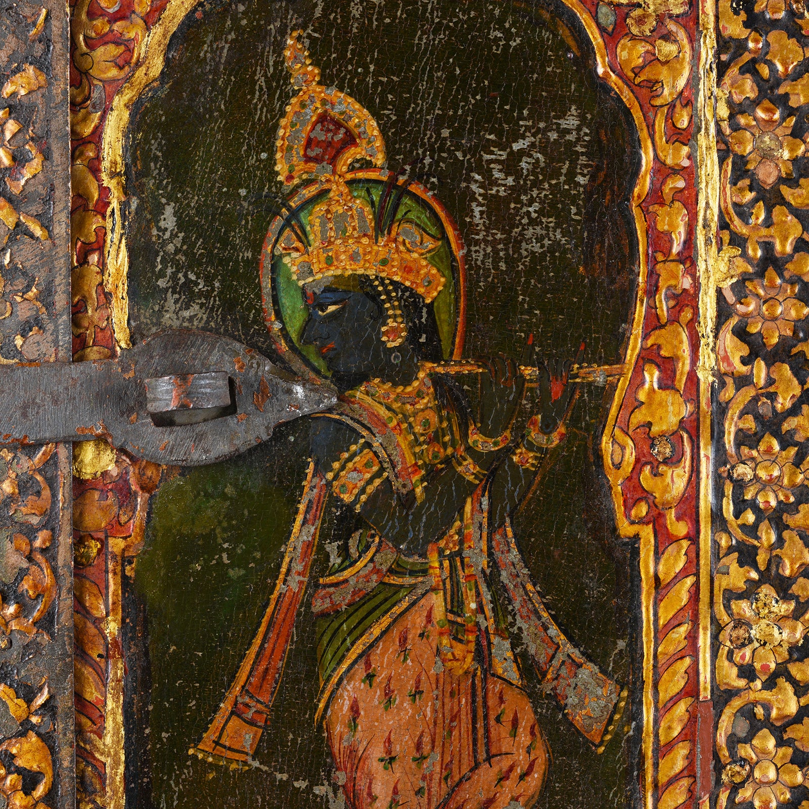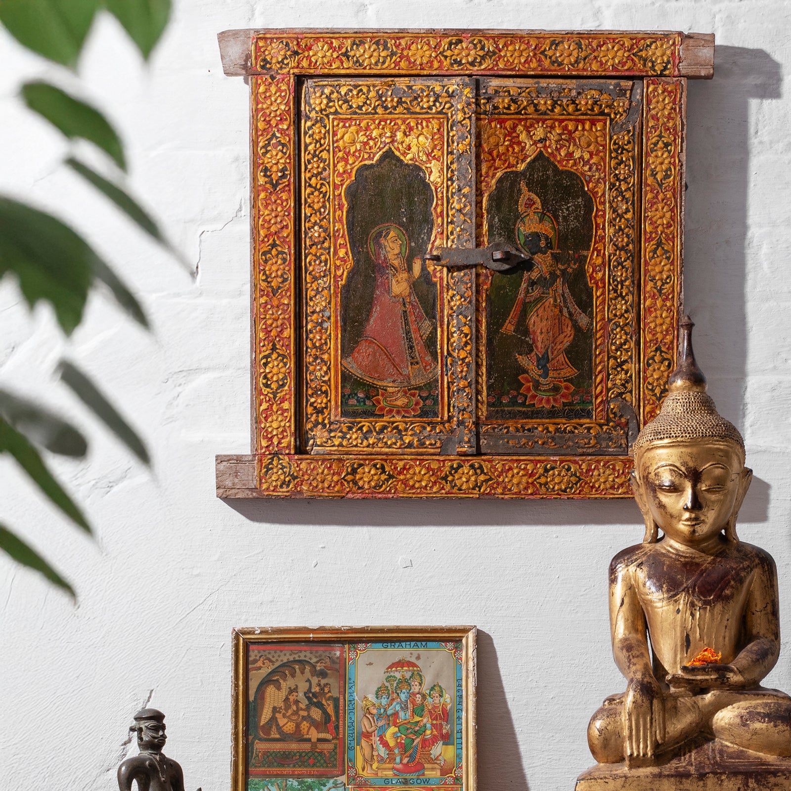 This beautiful painted Indian shutter depicts Krishna & Radha. The shutter dates to the 19th century and is in excellent condition. The eternal and sublime love of Krishna & Radha is a deeply popular story often found in Bikaner paintings. Often called 'Radha Krishna', it is a romantic tale depicting the beauty of romantic and physical love. Radha was already married and they engaged in a passionate intermarital affair transcending traditional mortal relationships and morality. The subject has become more secular than religious and symbolises the union between the human soul and the divine.