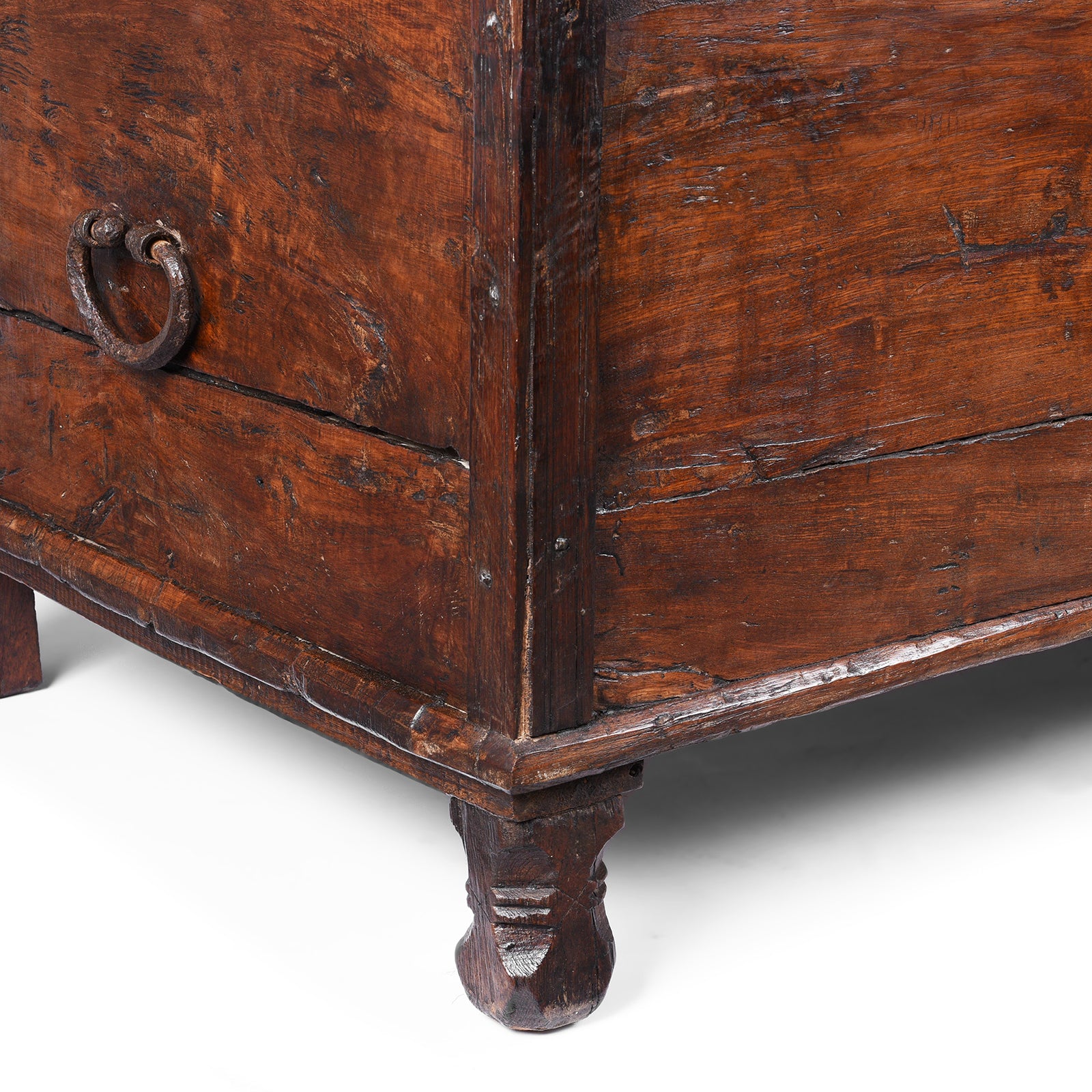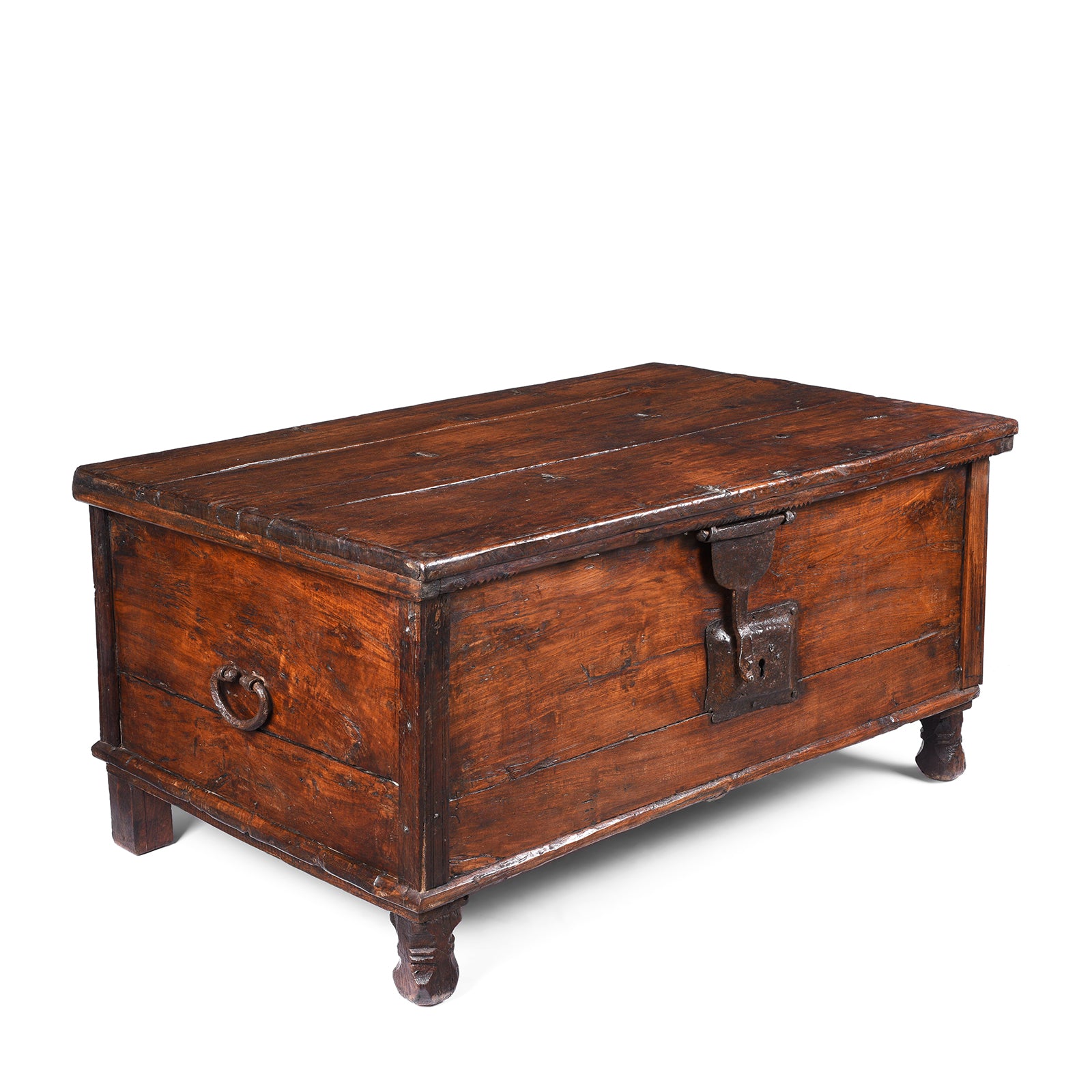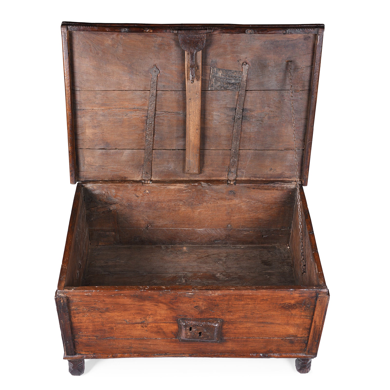 This iron bound teak chest from Goa is not only a stunning piece, but also has a rich history behind it. In the 19th century, these chests were used to store valuables such as textiles, jewelry, and cash, as it was not yet common to keep all money in banks. These strong boxes were custom-made, often commissioned by the head of the family. This particular chest boasts a beautiful patina and a sturdy design, complete with a chain to prevent the lid from falling open.